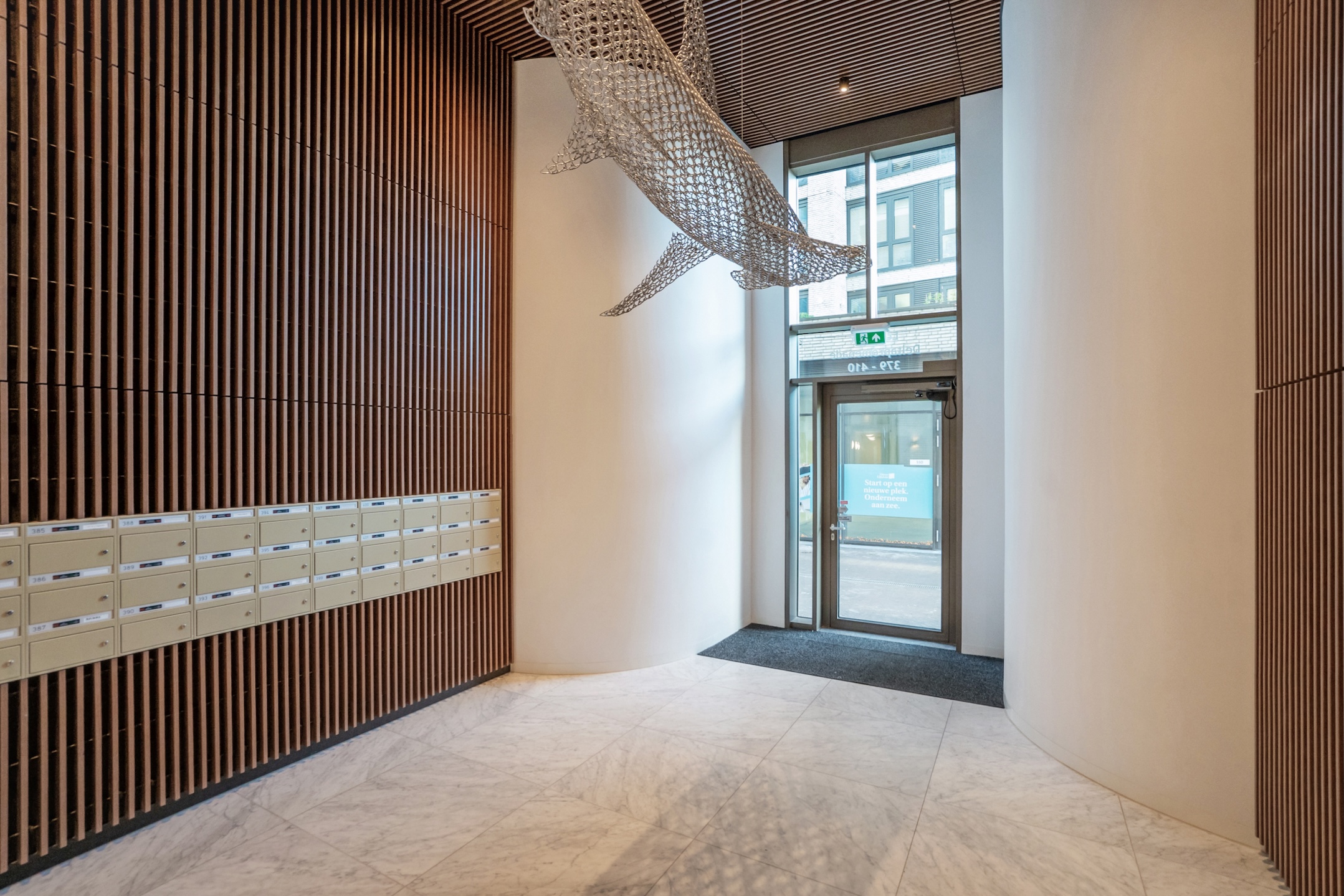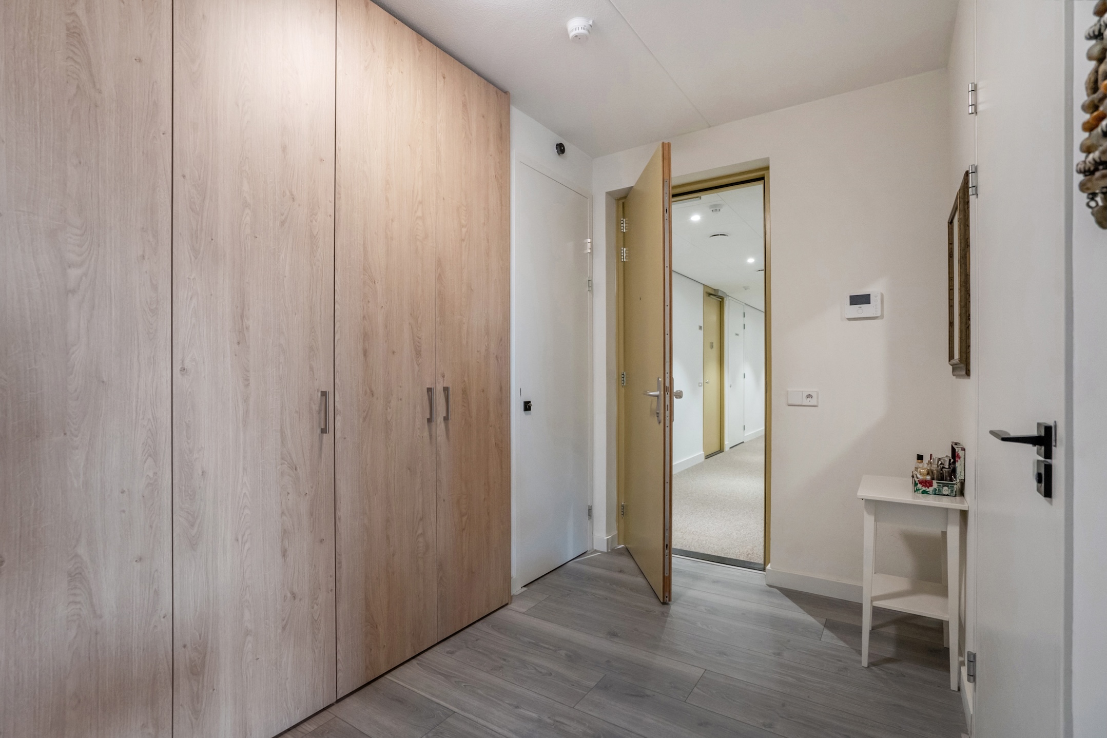 Closed central entrance with video intercom system. From here, you can reach the fourth residential floor via the elevator or staircase. The wide corridors are finished with luxurious carpeting, providing a stylish entrance to the apartment. CCTV surveillance on the ground floor and in the elevators.