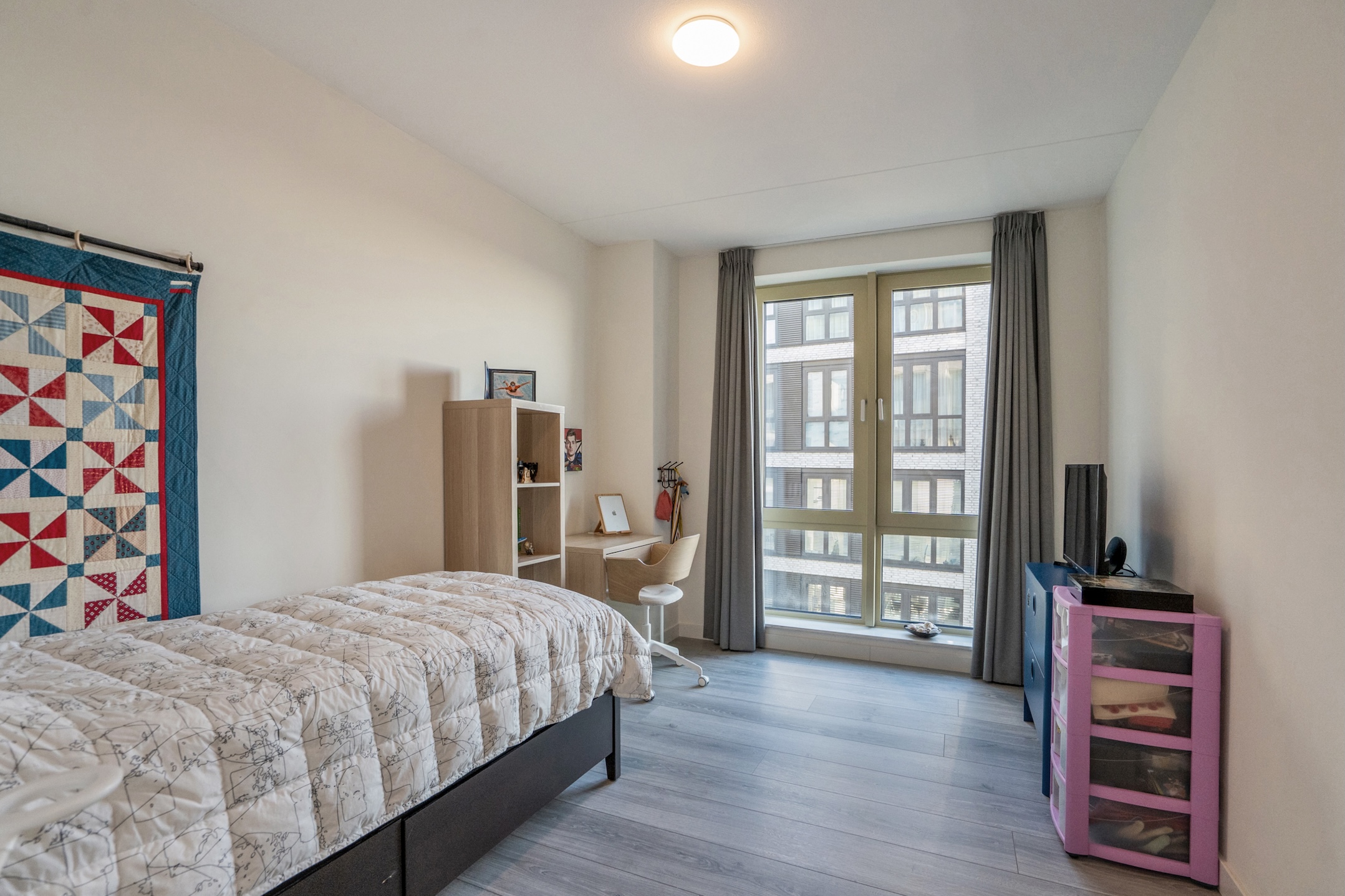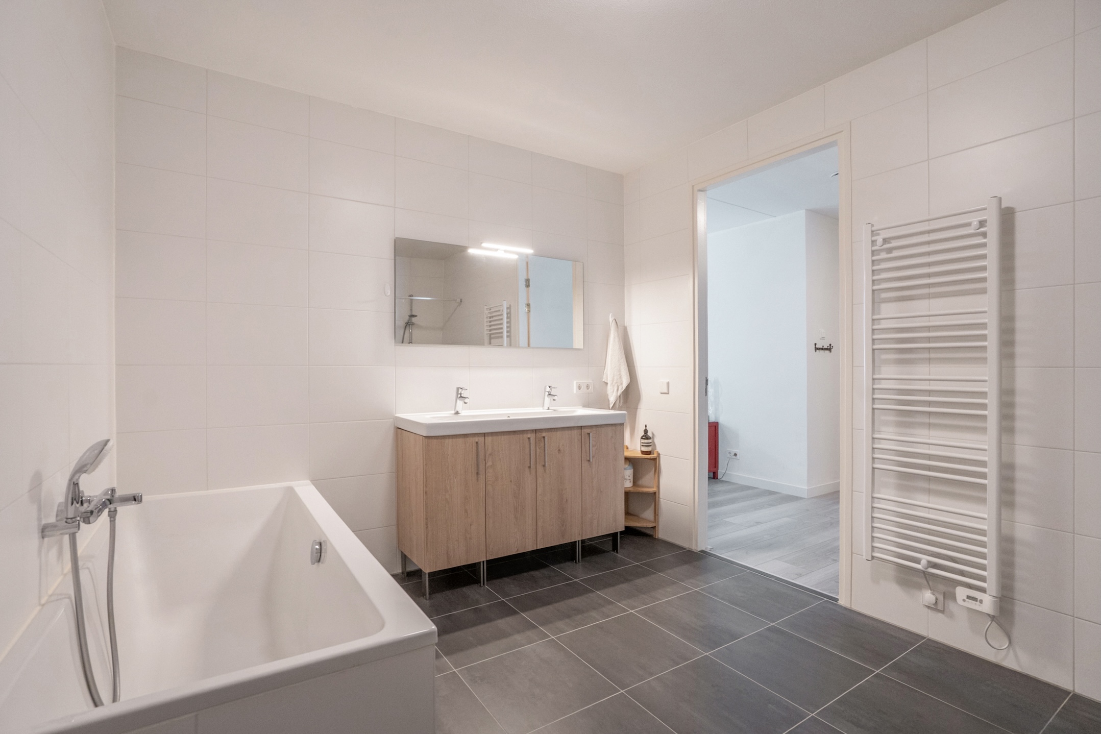 This property has 3 full-sized bedrooms. Immediately on the right side of the hallway, you will find the first 2 bright bedrooms. The described hallway leads to a spacious hall with double wardrobes arranged in a corner setup, access to a bathroom, and a generous master bedroom, which also has a large wardrobe wall and 2 large windows. Then there is the spacious bathroom, featuring a dark gray tiled floor, towel radiator, wide vanity unit with double sinks and faucets, a bathtub, a deep walk-in shower, and the 3rd wall-mounted toilet.