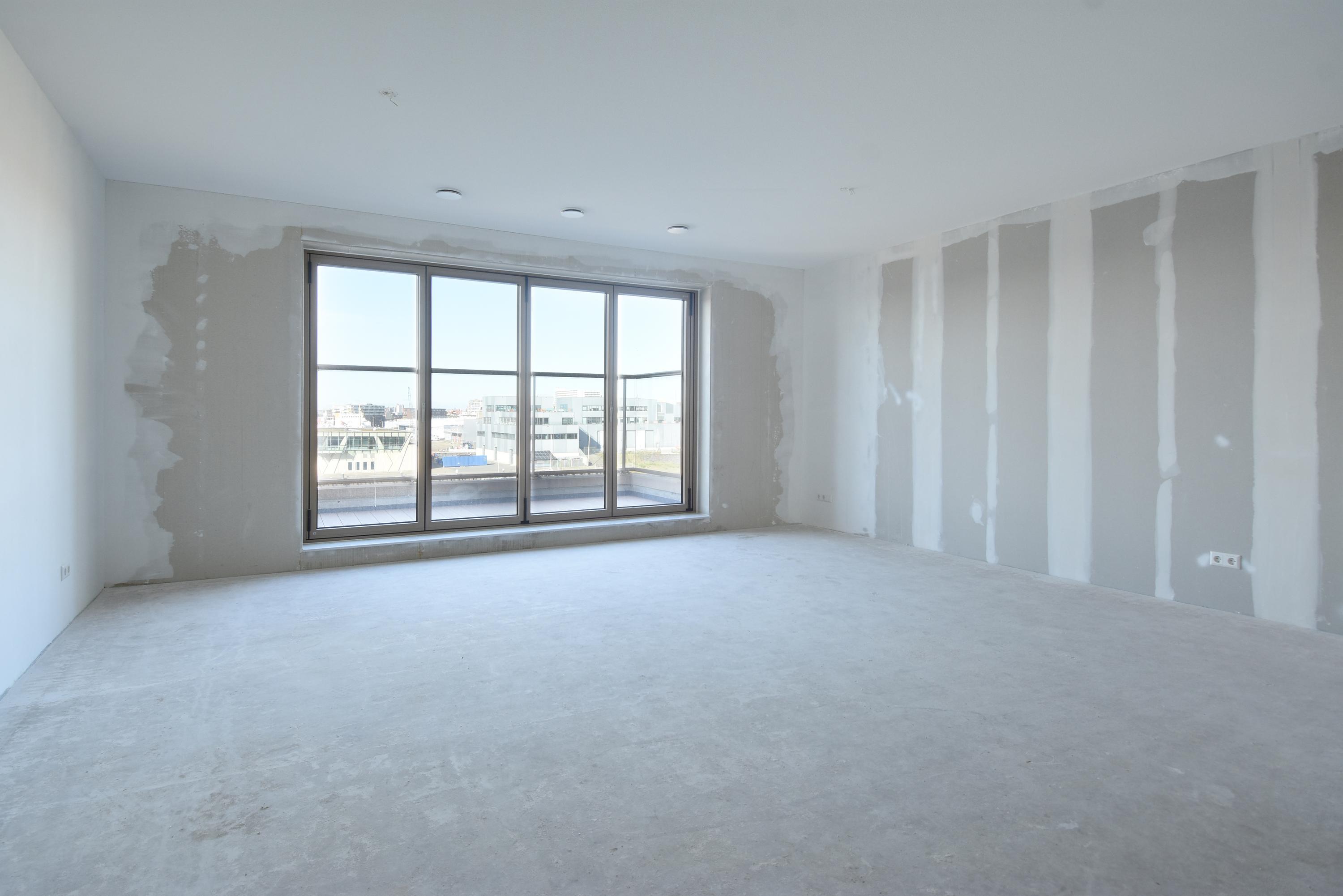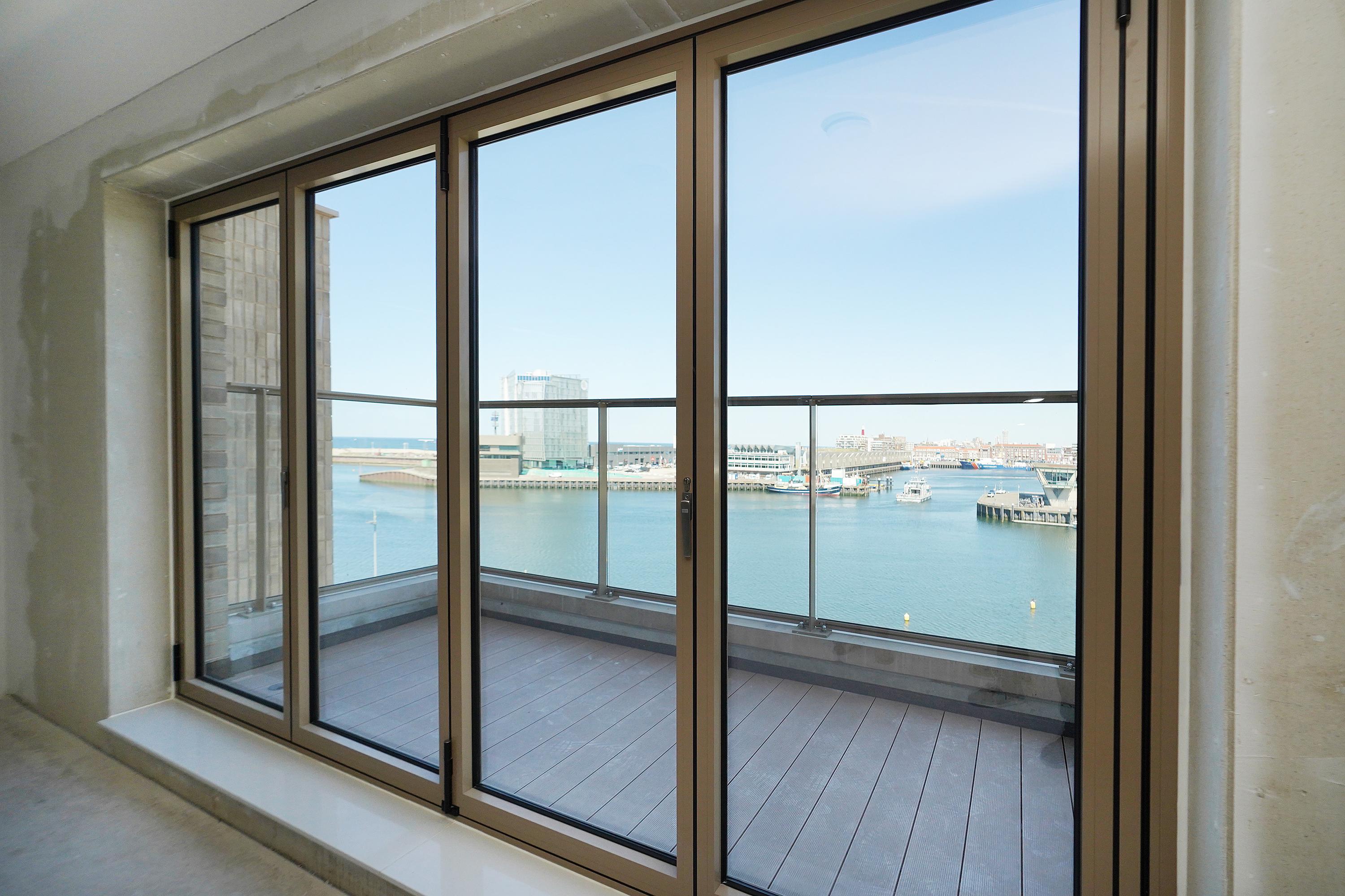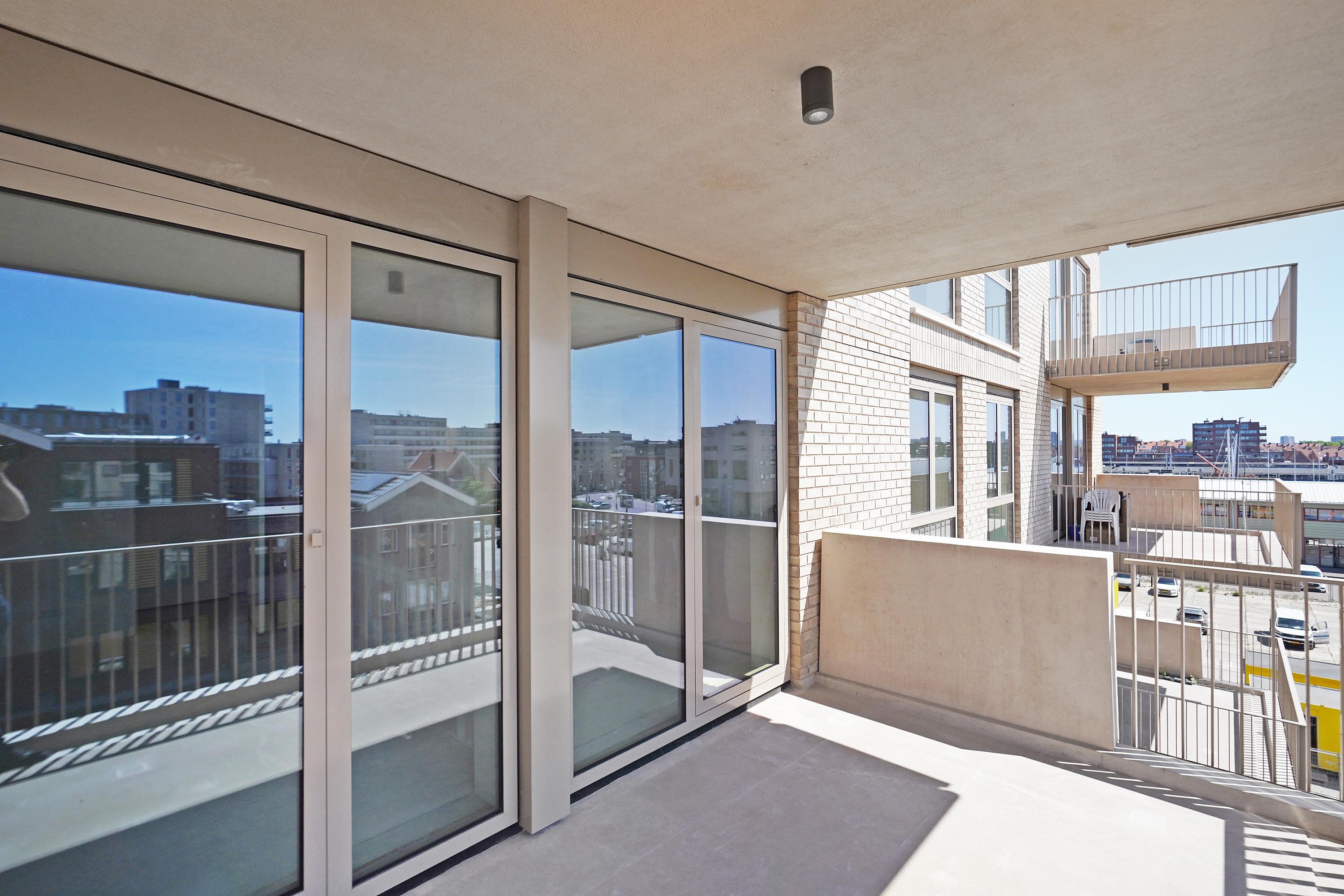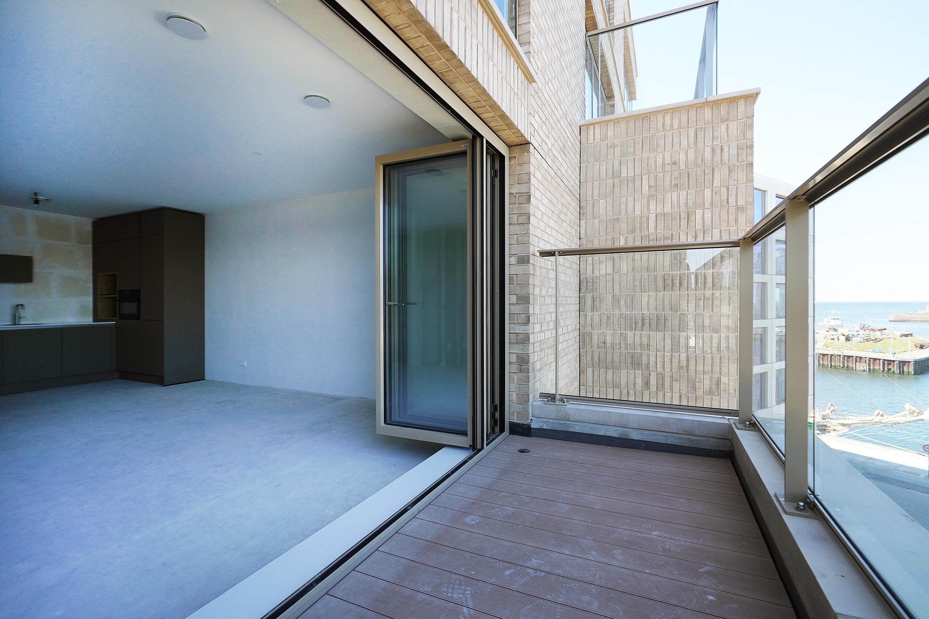 Entrance, hall, modern toilet, modern bathroom with a walk-in shower, washbasin with vanity unit, and towel radiator (Duravit sanitary ware), integrated technical room/storage with a heat pump, ventilation system, and washer/dryer connections. The spacious living room on the harbor side offers a phenomenal view thanks to large windows and the folding/sliding door to the balcony. From the living room and balcony, you have views of the Scheveningen harbor and the sea, a lively view that never gets boring with the arriving and departing fishing boats, pleasure yachts, and numerous water sports enthusiasts.