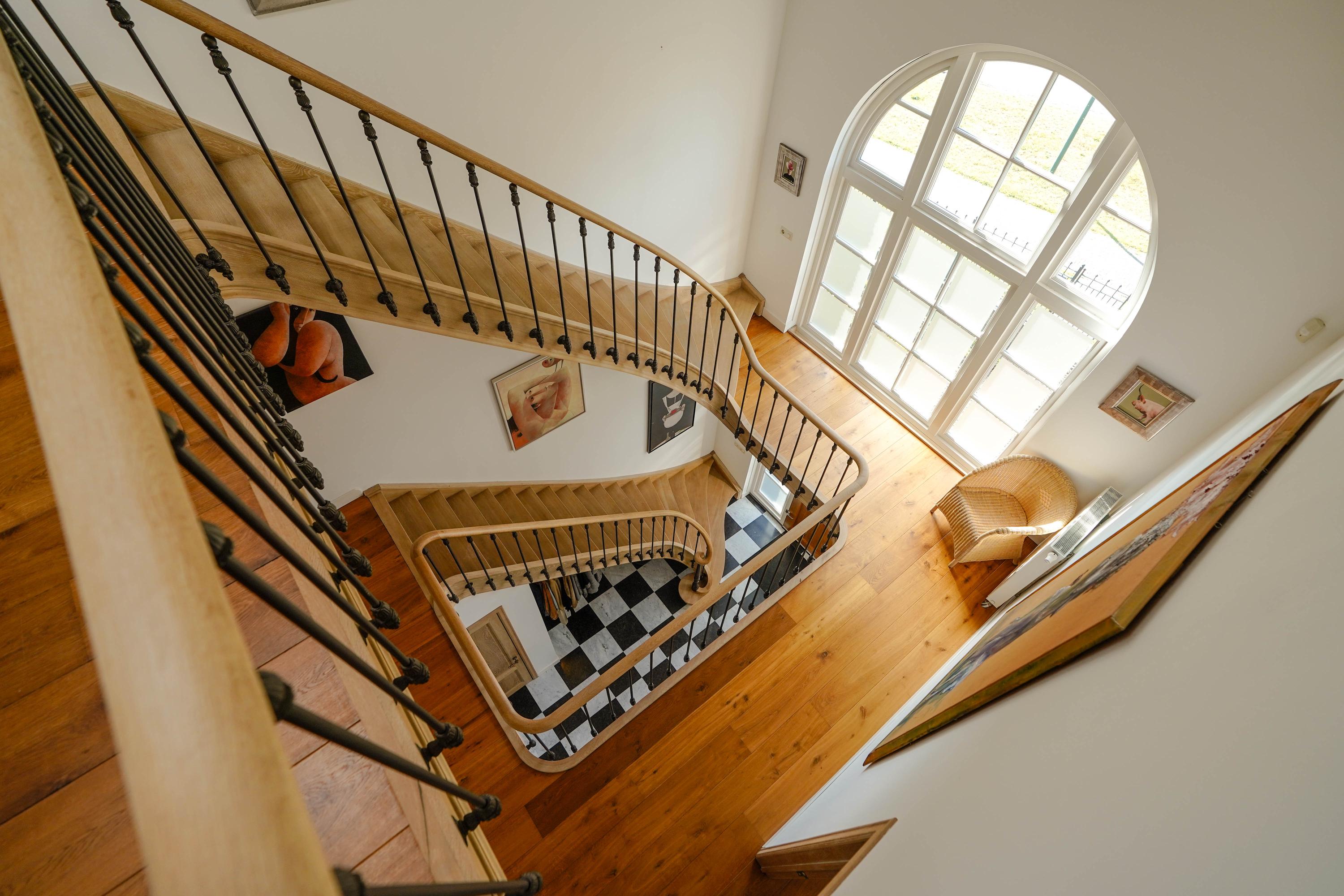 De entreehal maakt direct indruk met een fraai gesculptureerde, eiken trappartij. Vanaf de begane grond loopt een massief eiken leuning in één ononderbroken stuk door tot en met de bovenste etage, gedragen door 87 gepatineerde, gietijzeren zijbalusters. Een meesterwerk van de befaamde Belgische trappenmaker Luc Steels. Hij vervaardigde ook de eiken paneeldeuren en sponningen in het hele huis. In de hal bevinden zich het toilet en de meterkast. Het lichtvenster in het dak boven in de vide zorgt samen met de grote glaspui voor optimaal daglicht op alle etages.