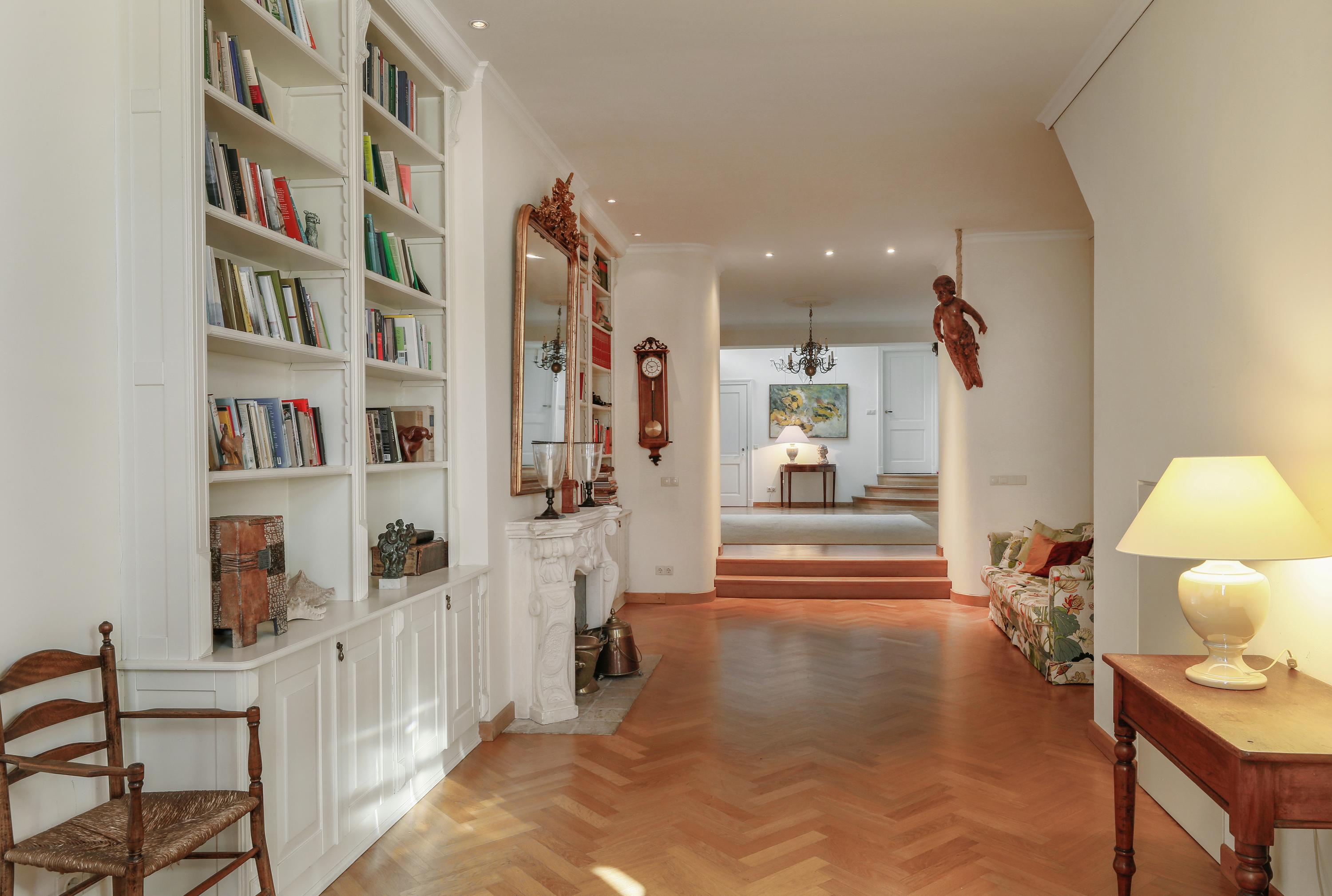 Spacious living area with herringbone flooring and smooth plastered walls. This floor can be configured flexibly, for example, as a second living room, workspace, or home office. From here, you can access the first roof terrace, the toilet, and the garage.