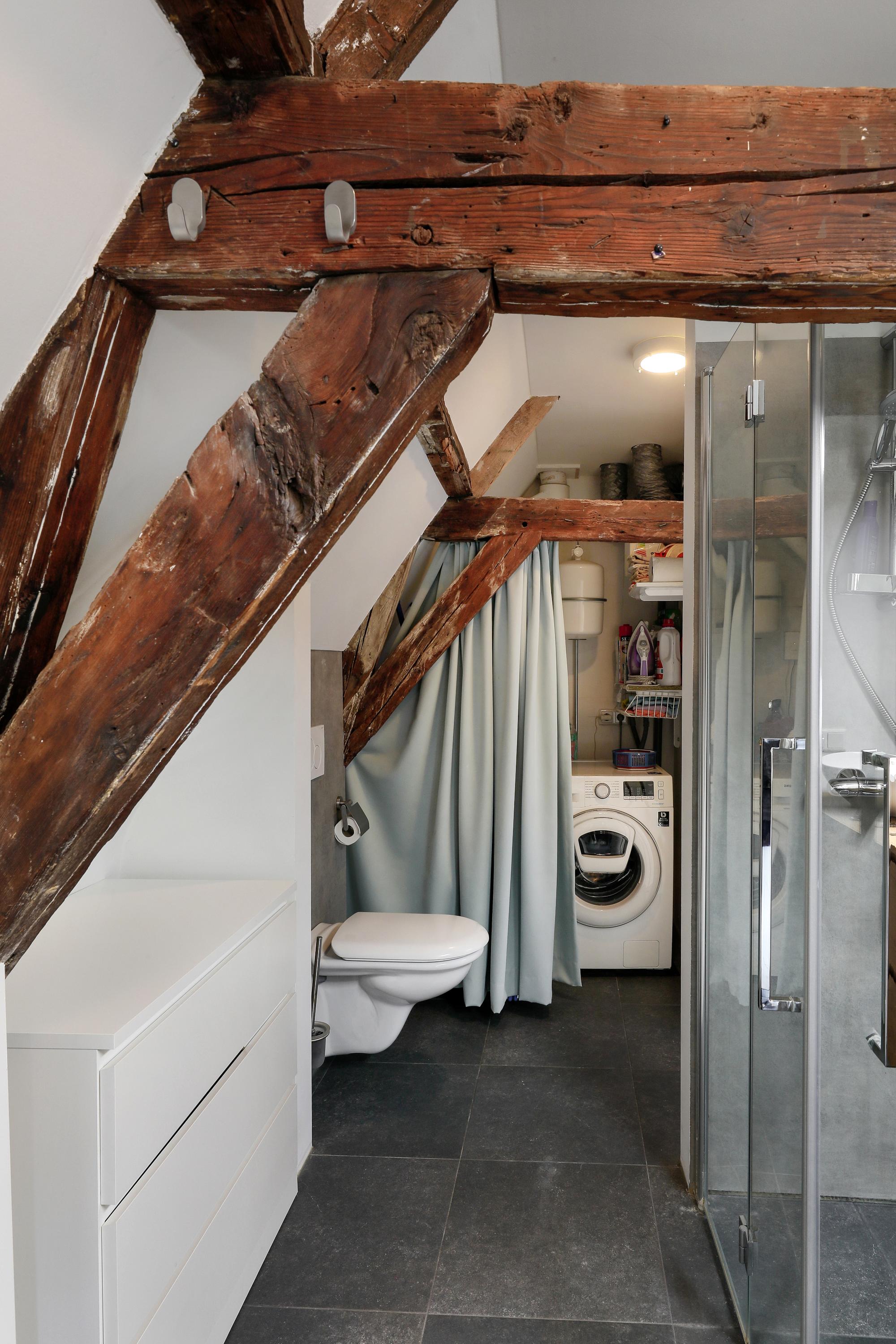Two bedrooms under the characteristic roof eaves, one with a water view and one with a private loggia that catches the afternoon and evening sun. The bathroom features a walk-in shower, vanity, and toilet. This floor is accessible by stairs and elevator.