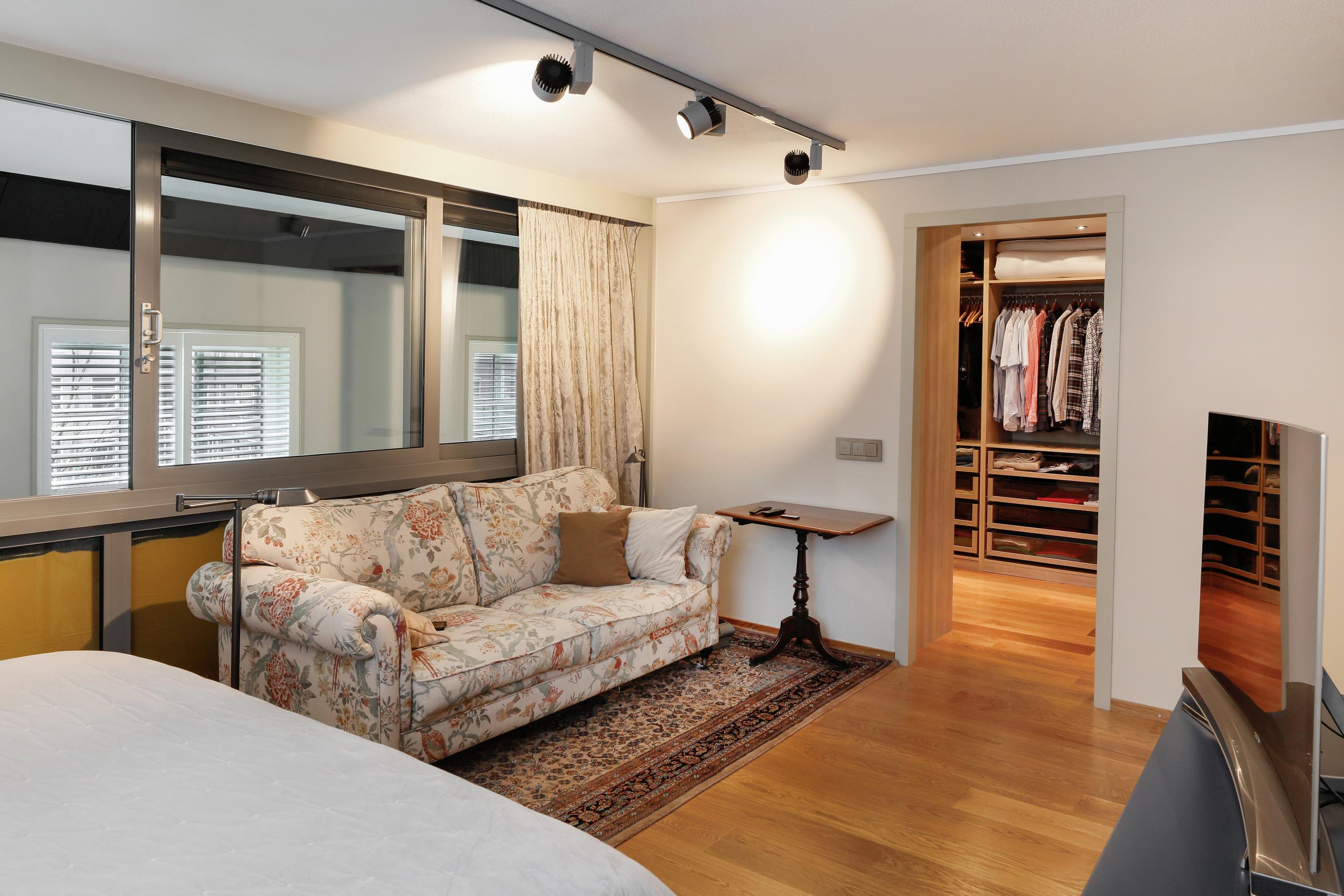 The bedroom is designed so that you'll have everything you need right at your fingertips. Naturally, there's plenty of space for the bed and bedside tables. Through the sliding door into the living room and further through the tall windows in the living room, you have a beautiful view of the courtyard. The bathroom and walk-in dressing room are en suite to this bedroom. There's also plenty of room for a sofa and TV. The walk-in dressing room was created from an originally planned mezzanine. A truly wonderful and very rewarding space. The dressing room is fully equipped for organized and practical storage of all your clothes.
