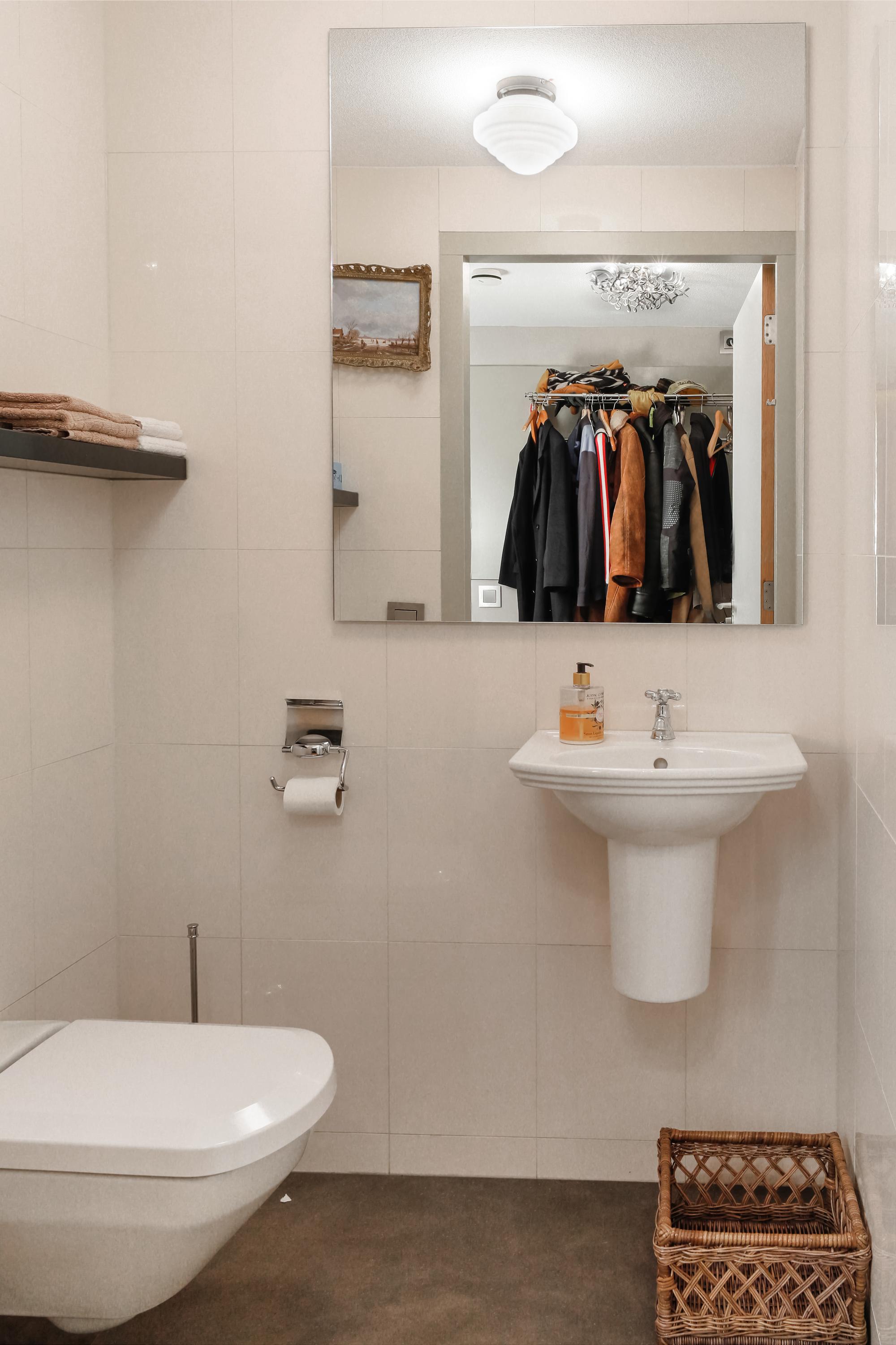 With soft tones, large tiles, and a well-designed layout, a double walk-in shower was installed in 2018, which you'll thoroughly enjoy. The floor is tiled with non-slip underfloor heating. The Geberit Mera AquaClean toilet is placed behind a low wall for privacy. There's a double shower and a slightly raised vanity with two sinks and a heated mirror. Towels and other bathroom utensils can be conveniently stored in cupboards and on open glass shelves.