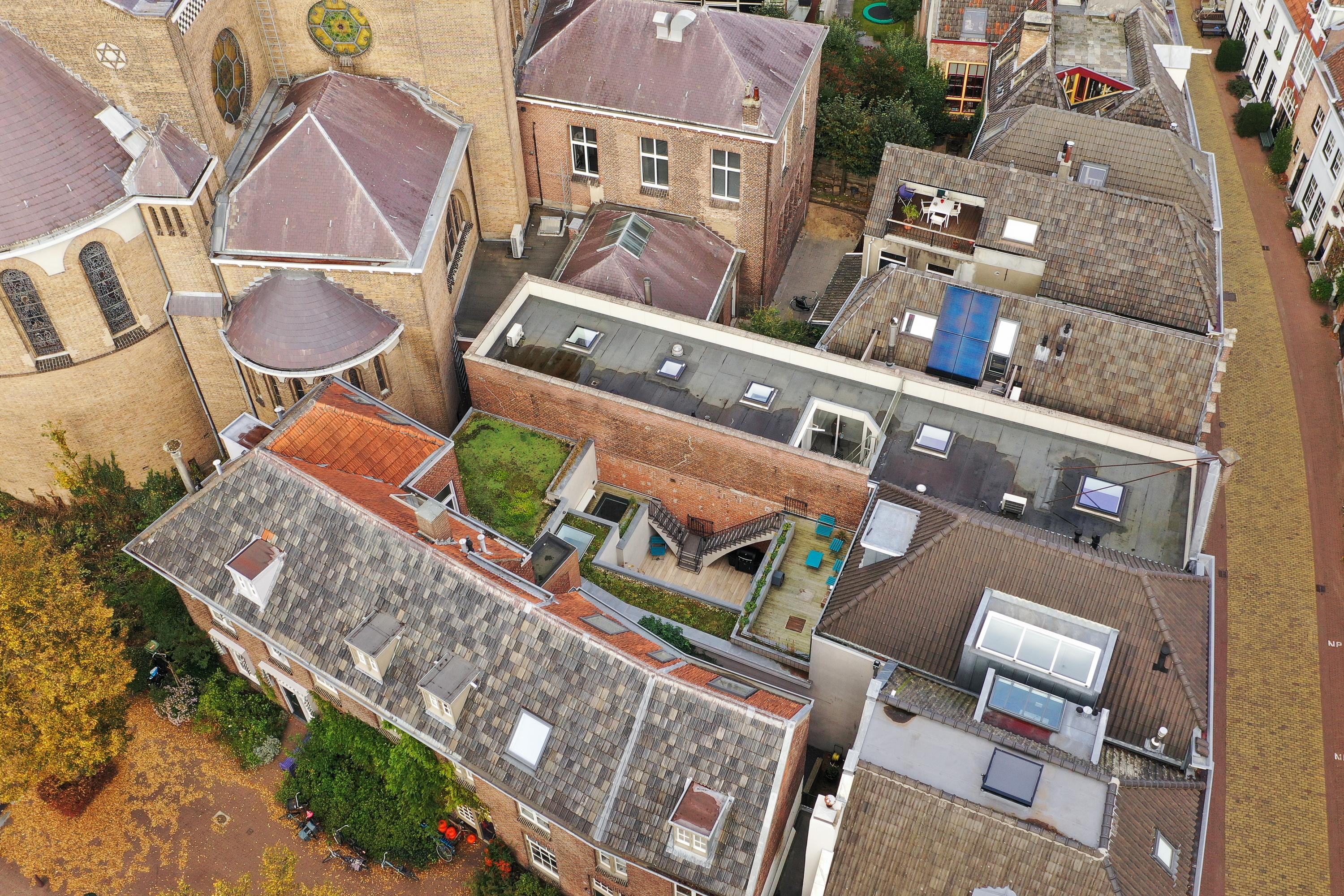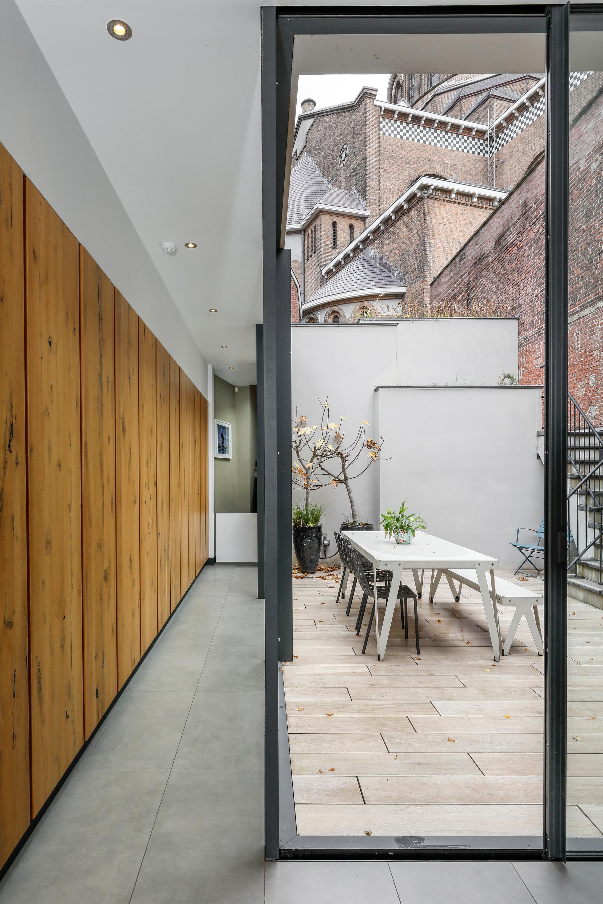 Of course, everyone is familiar with the front of St. Jacob's Church. But your visitors will still be surprised by the view from this side. The architect's approach to this project was a surprising one. By installing a huge transparent wall, the inside becomes the outside, and vice versa. The wall can be slid open in two directions from the corner. During the day, it's a wonderfully bright spot for a cozy dining table, and in the evening, you can dine with this remarkable view. The long wall of cabinets makes your home both practical and tasteful. This home also offers more outdoor space than is typical in the city center. In addition to a large courtyard garden, there are two roof terraces. So, you can choose your own spot for sun, shade, reading a book, enjoying a glass of wine together, or enjoying a delicious dinner al fresco.