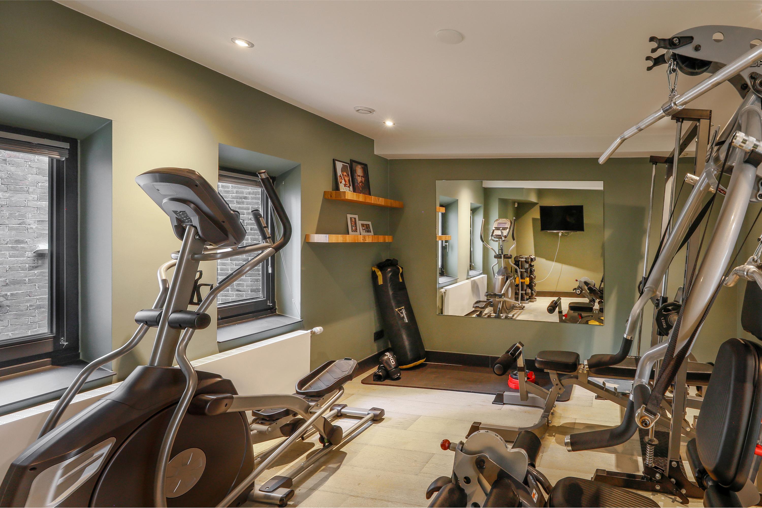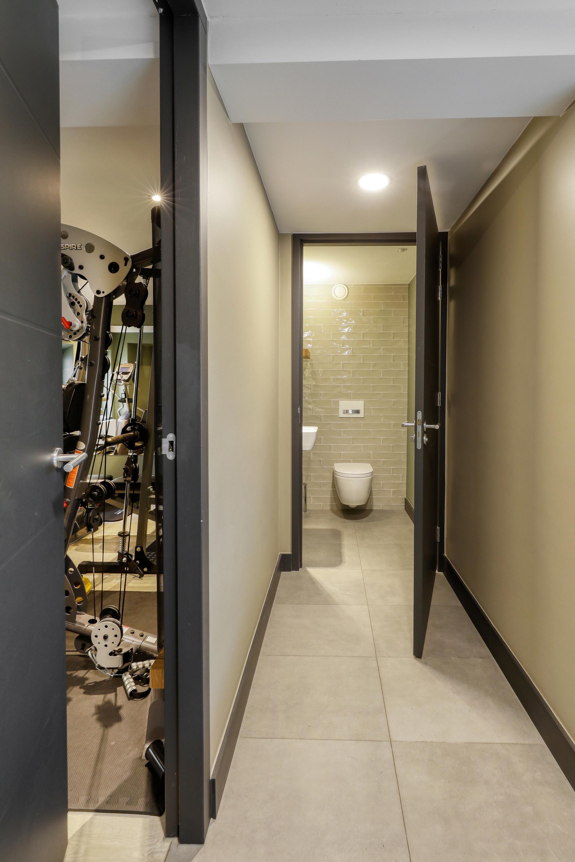 In the back house, on the first floor, you'll find a large room suitable for a variety of purposes. It's currently used as a gym. Below, you'll find the technical room for the spa. There's a sauna with, again, a large glass wall. The heater is freestanding in the room, and there are benches for three people. The (plunge) shower is located at the back. Perhaps even more beautiful is the jacuzzi for about four people. Up on a raised platform under the starry sky behind a glass roof, this is the ultimate relaxation experience, right at home.
