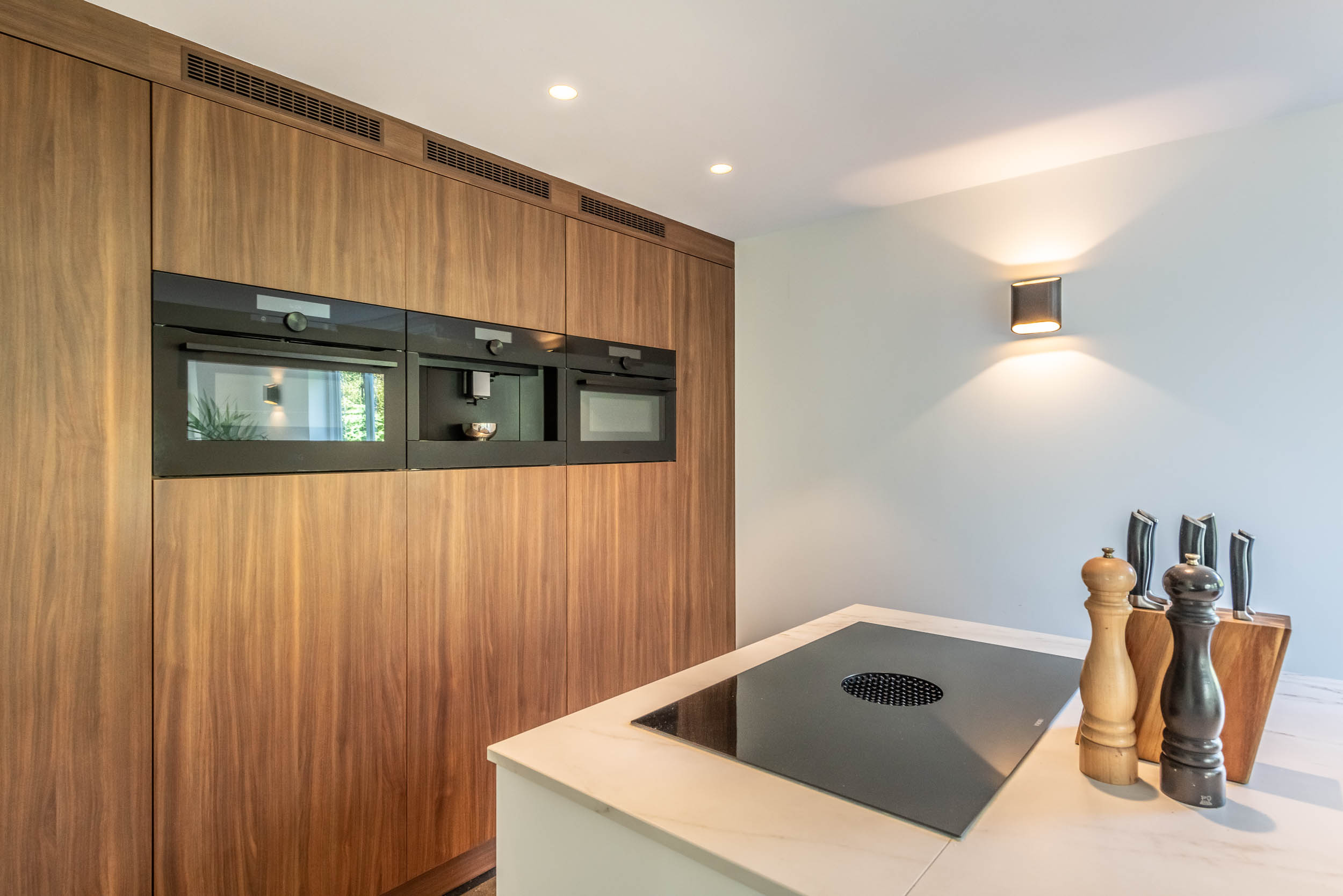 This semi-detached villa, with the feel of detached living, is easily accessible via the driveway. The grounds are enclosed by an electric gate. The driveway has space for several cars, features a charging station and provides access to the indoor garage.
