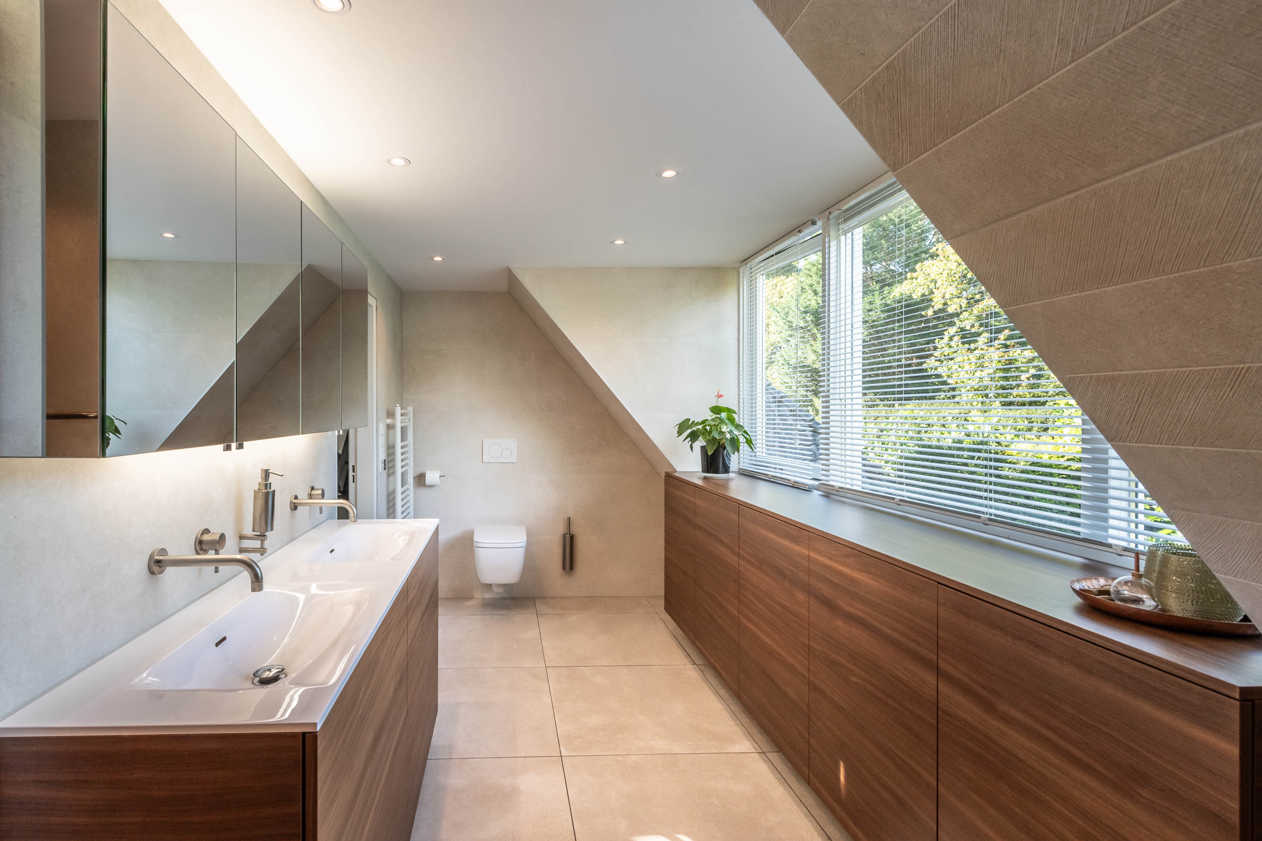 Landing, three bedrooms, including the spacious master bedroom (formerly two rooms) with walk-in wardrobes on both sides. Modern, tailor-made bathroom (’t Spant in Heemstede, 2022) with large dormer window, double washbasin unit, toilet, ample cupboard space, underfloor heating, freestanding bathtub, walk-in shower with Sunshower and hand shower.