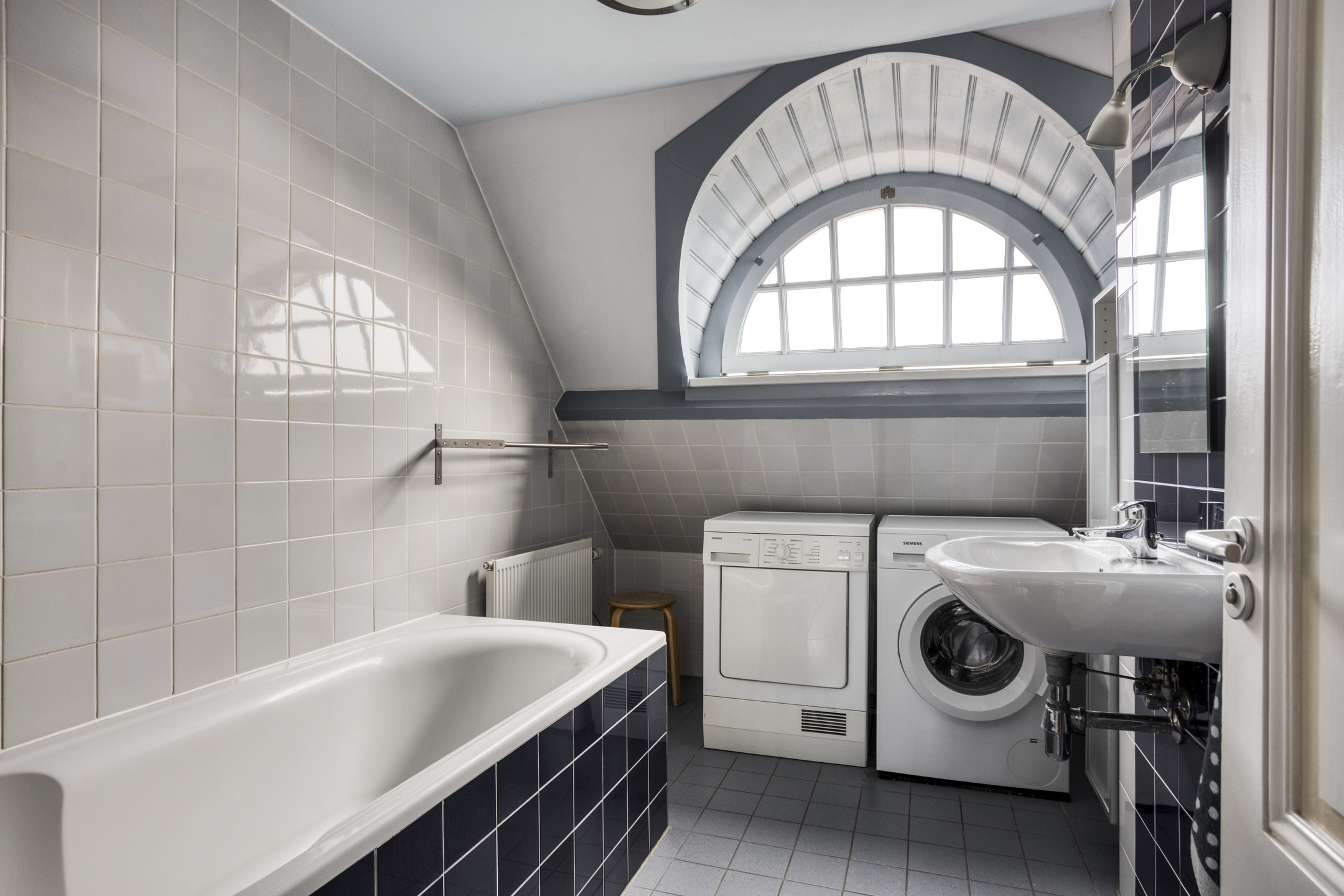 On the top floor are two additional spacious bedrooms, both extended with dormer windows. This floor also includes a separate toilet and a third bathroom equipped with electric underfloor heating, a bathtub/shower combination, washbasin, and washing machine connection. A pull-down ladder in the hallway provides access to the spacious attic, where the central heating boiler is located, along with a hatch for roof access and maintenance.