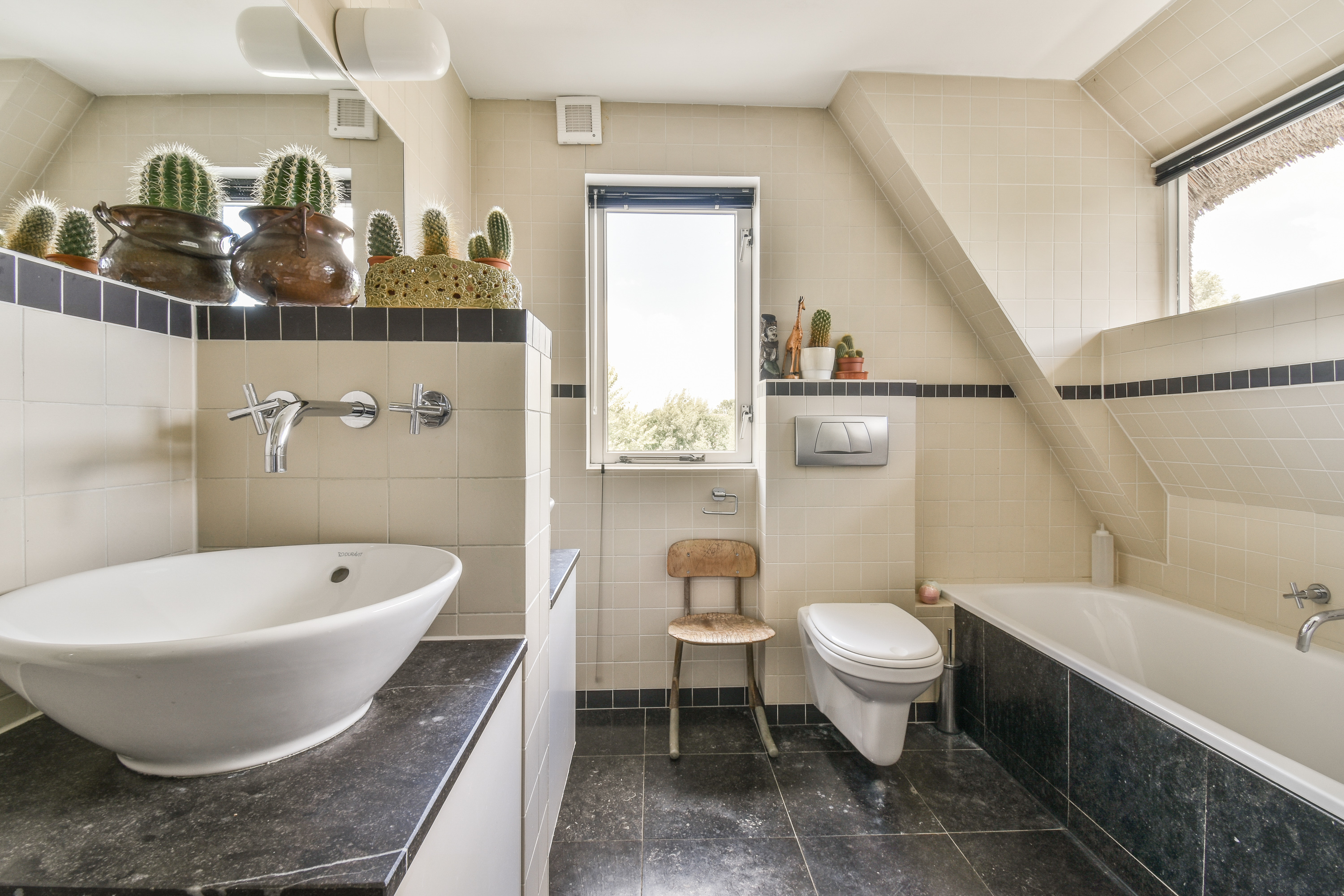 A staircase leads to the first floor, where peace and privacy are key. At the front of the home is the spacious bedroom, offering panoramic views of the Amstel. This room includes a large walk-in closet and a luxurious en-suite bathroom with a freestanding bathtub, double vanity, walk-in shower and toilet. At the rear is a second large bedroom, also with an en-suit bathroom. This bathroom is equipped with a double sink, walk-in shower and toilet. A bright landing connects the rooms and enhances the overall sense of space and refinement.