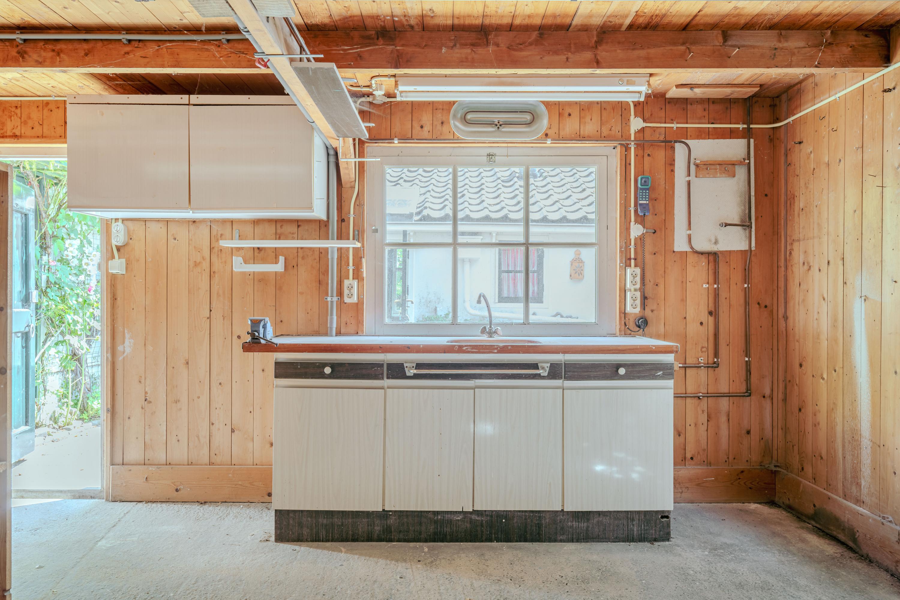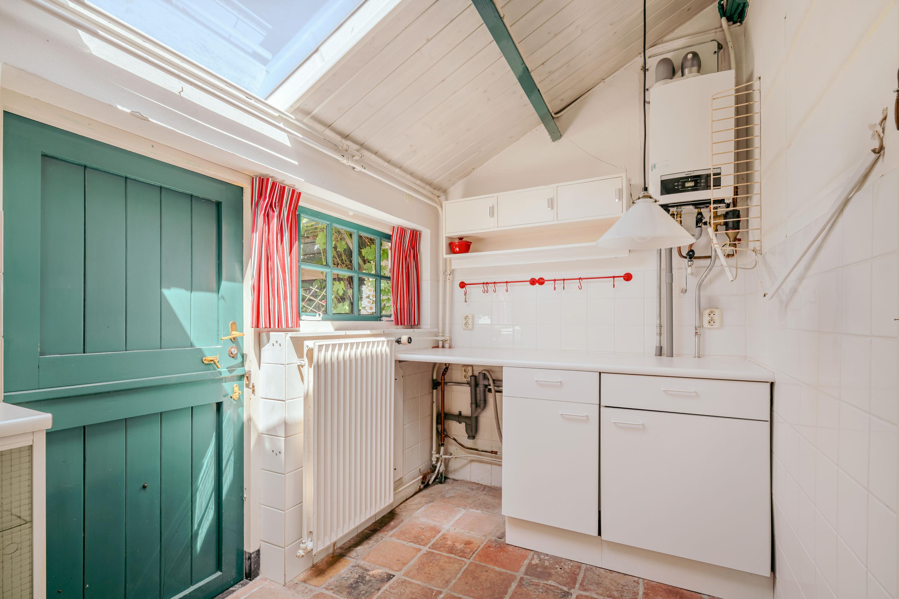From the courtyard, the main house can be accessed through two doors. The left door opens into the kitchen, where ample daylight enters through skylights. The kitchen is fitted with a sink, four-burner gas hob, oven, and various cabinets and drawers. The central heating boiler and washing machine connection are also located here. Adjoining the kitchen is the living and dining room at the front of the house, featuring wooden beams, built-in cupboards, and windows overlooking the garden. The fireplace, wooden finishes, and view of the dike give the room a warm and inviting atmosphere. Through the hallway with a skylight, you reach the separate toilet with washbasin and the bathroom, which includes a bathtub with shower and a washbasin unit.