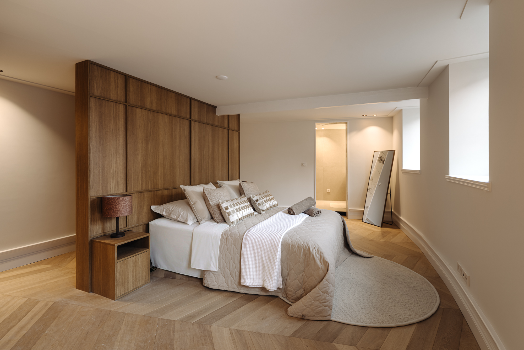 The monumental staircase leads to the landing of the first floor. At the rear is the classic dining room with access to a second internal balcony. This balcony features a folding glass façade, seamlessly connecting indoor and outdoor living. Thanks to its favourable position, you can enjoy the sun here well into the evening. At the front is the spacious kitchen-diner with cooking island—without doubt the centrepiece of the home. The kitchen is finished in beautiful dark oak and complemented by an elegant composite worktop. It is equipped with high-end Siemens StudioLine appliances, a Bora cooktop, and a Quooker tap. The island also features a welcoming bar area. With a width of nearly 7 metres and three large windows, the kitchen enjoys wonderful open views towards Jan Luijkenstraat. From both the kitchen and the landing, the fourth (bed)room can be accessed, which is ideal as a home office or study.