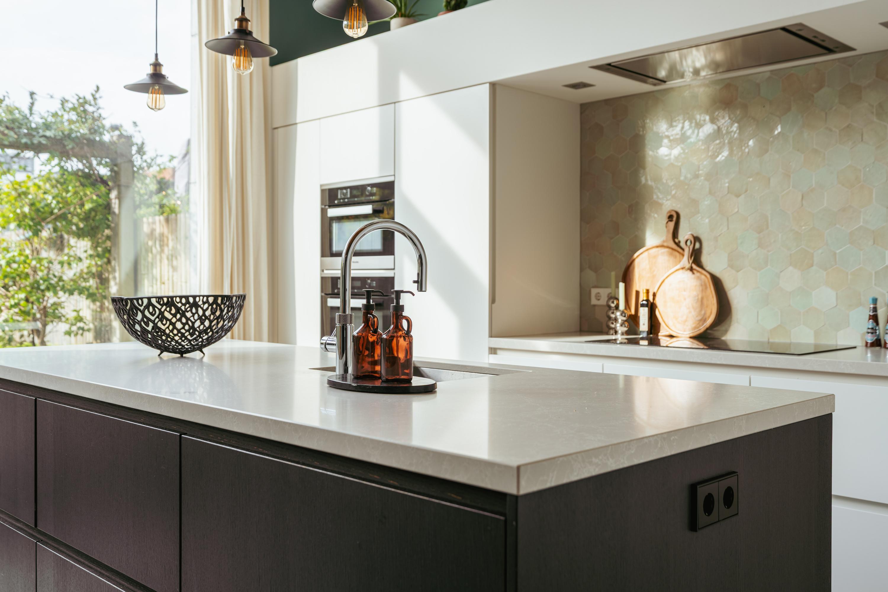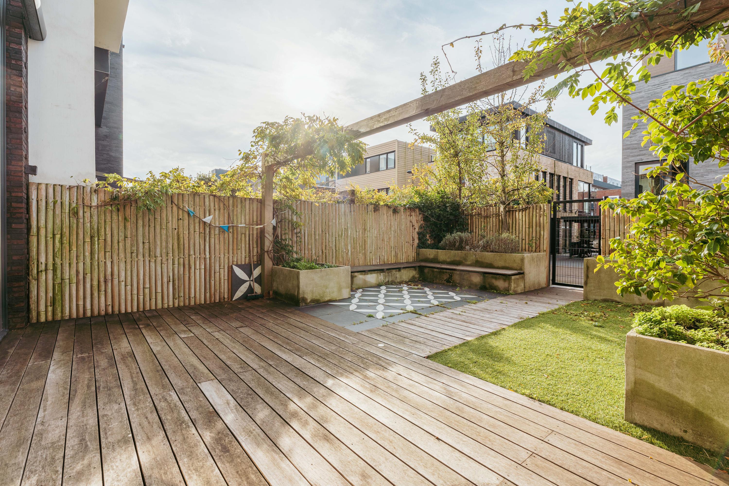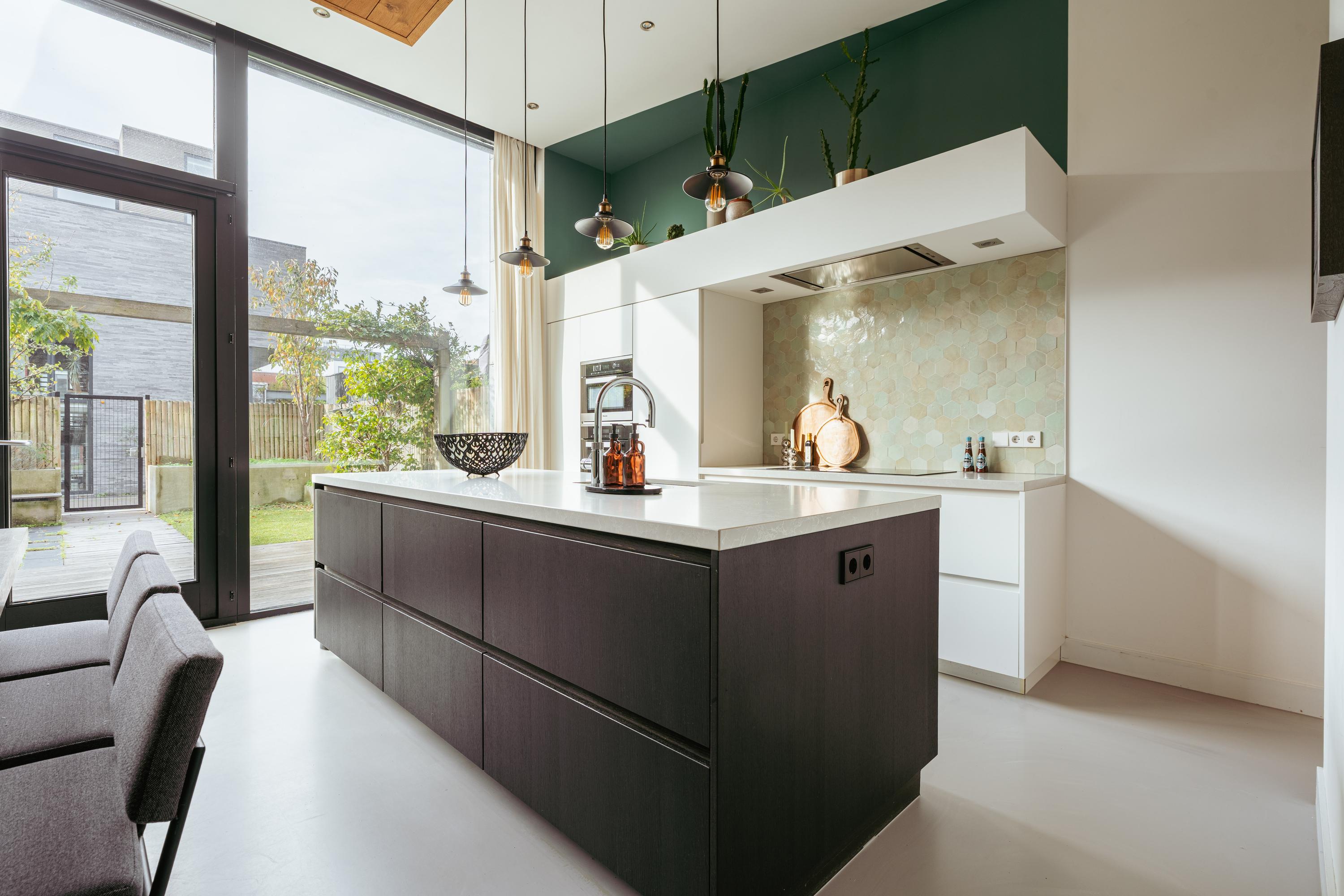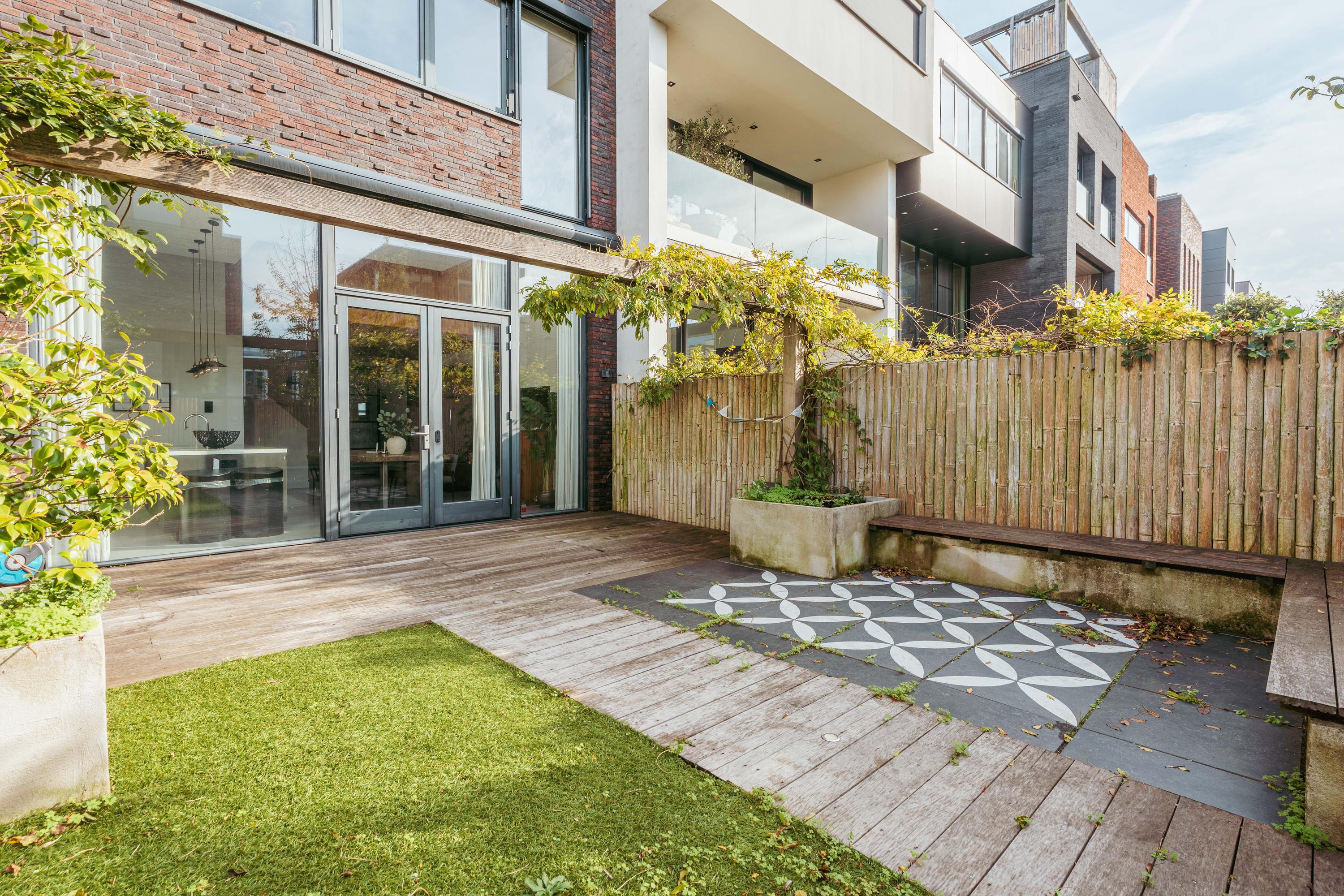 The custom-designed kitchen features a large cooking island with a composite worktop and premium built-in appliances, including a Quooker, induction cooktop, dishwasher, microwave, oven, and plate warmer. French doors open onto the beautifully landscaped, low-maintenance garden of approximately 54 m², with wooden decking, stone paving, and lush greenery. A private gate provides direct access to the back area with two private parking spaces equipped with an electric charging station.