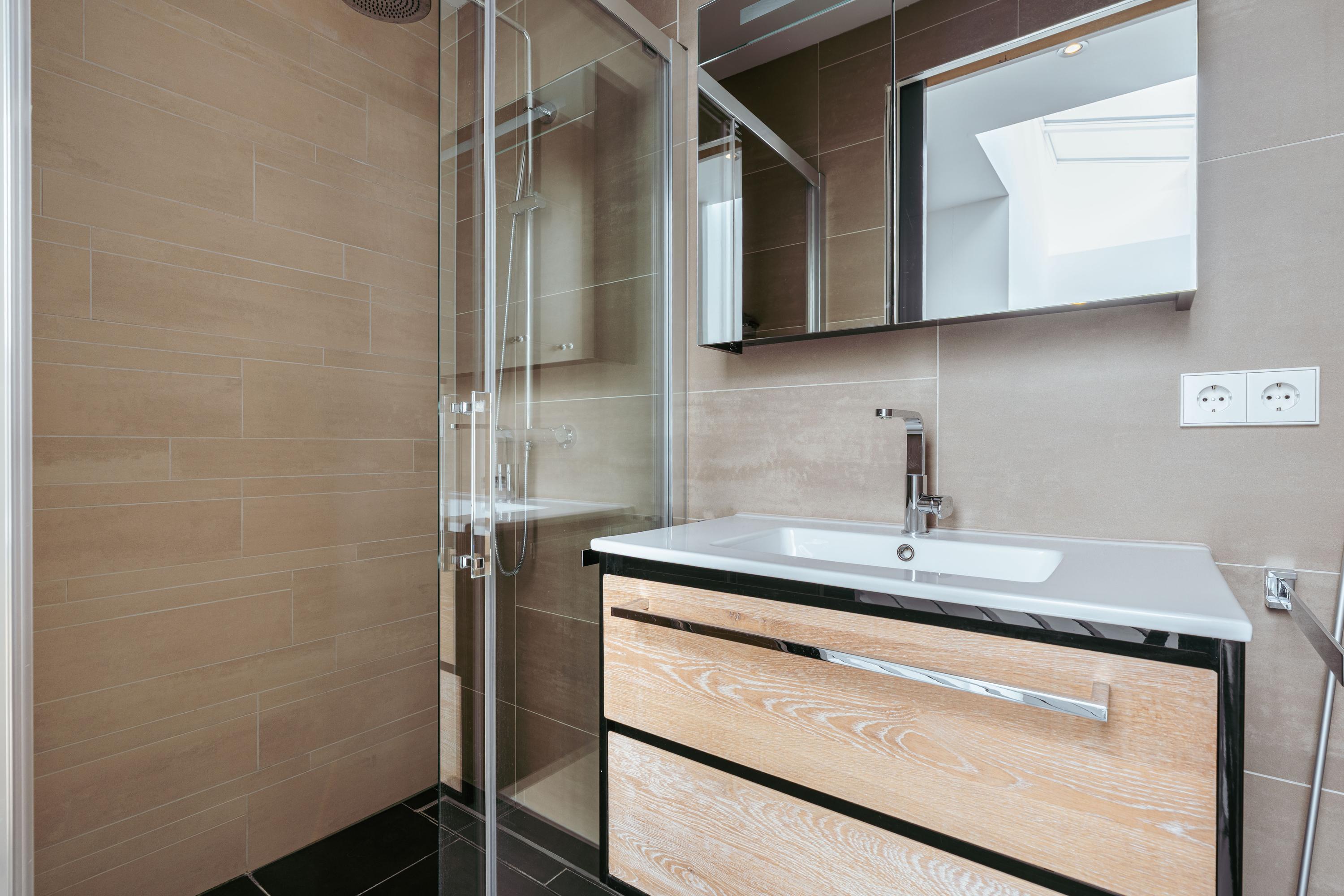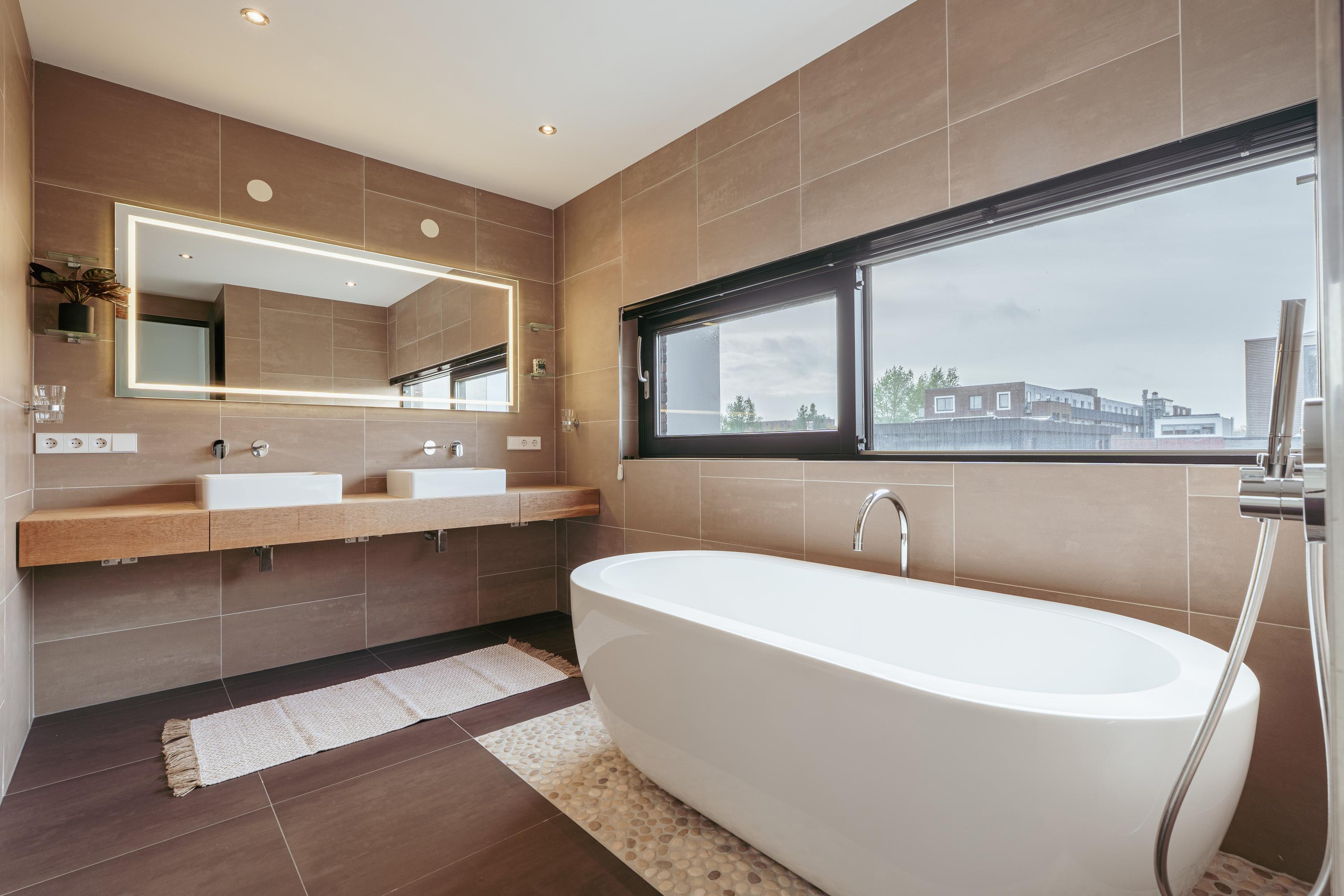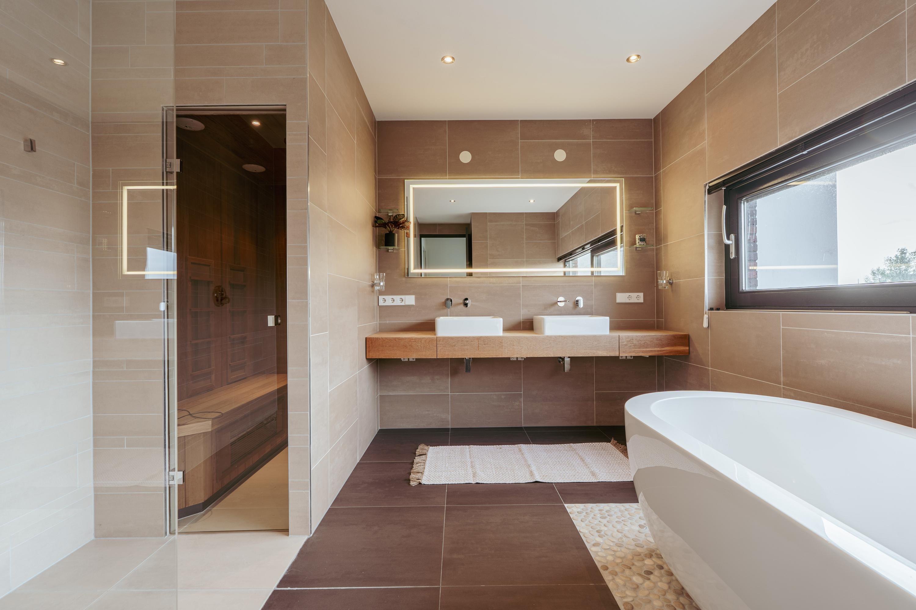 The luxurious bathroom exudes tranquility and sophistication, finished in warm earth tones and high-quality materials. It features a freestanding bathtub, walk-in rain shower, double washbasin, and a sauna — a wonderful private retreat to relax after a busy day.