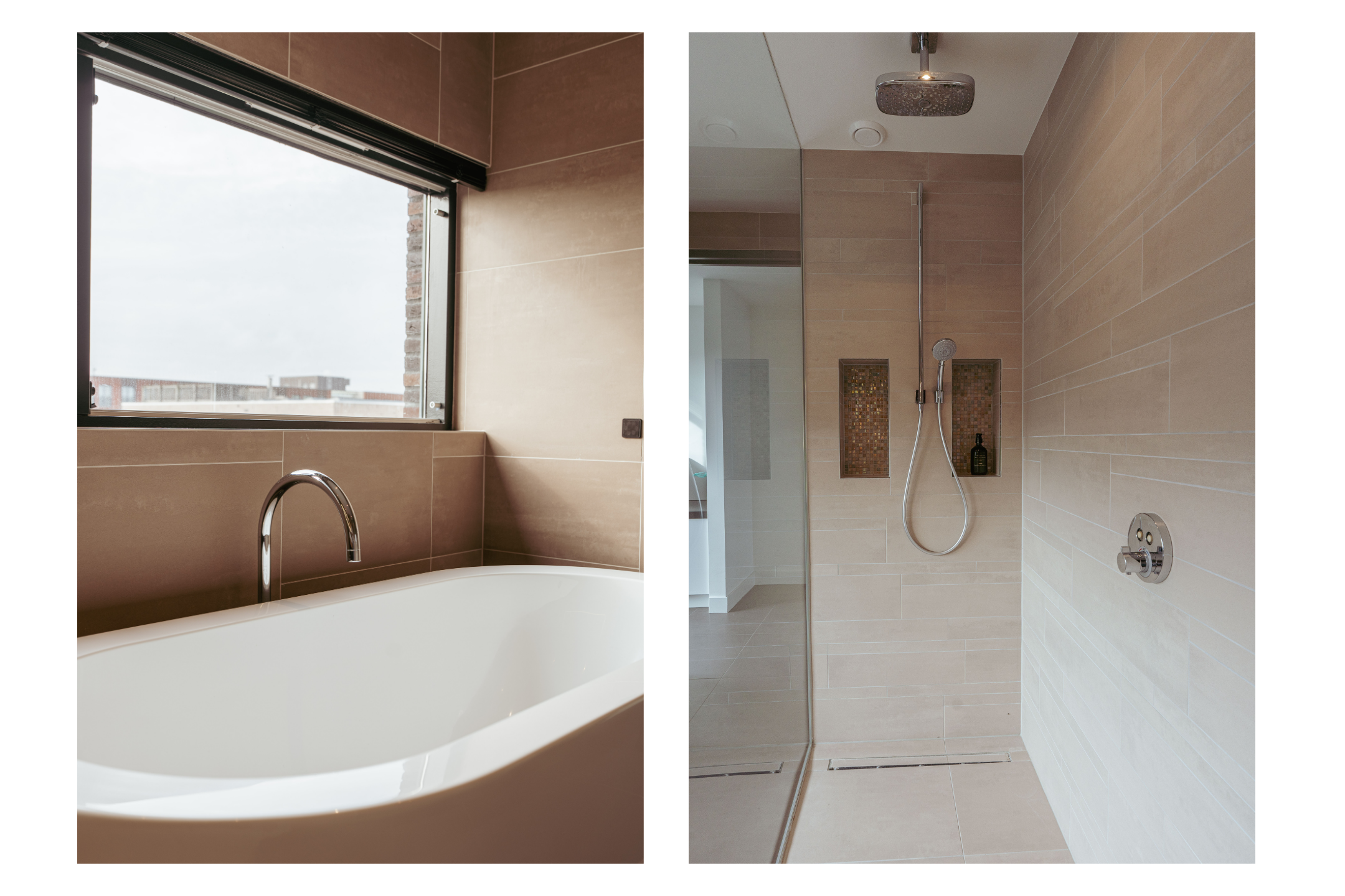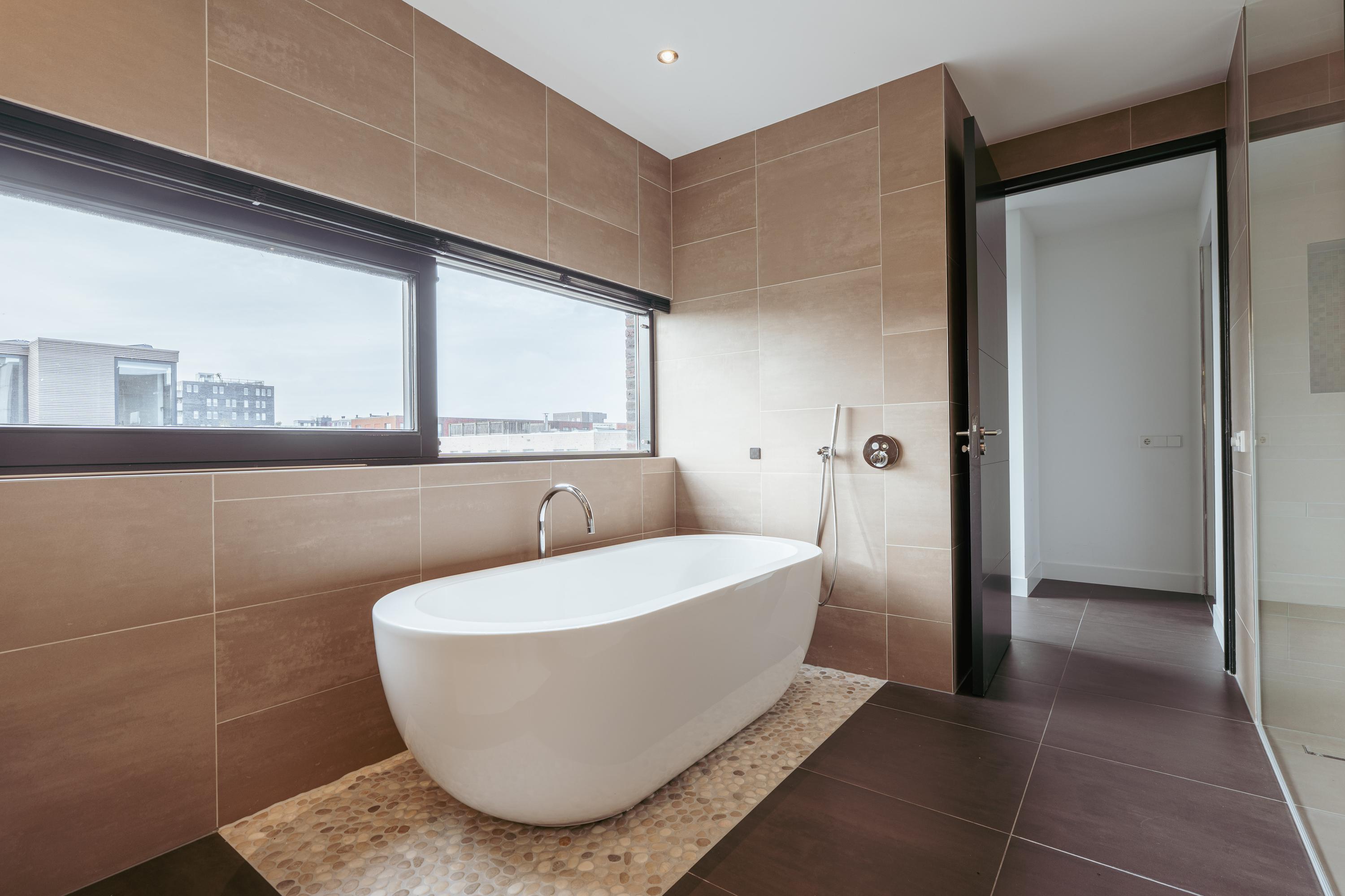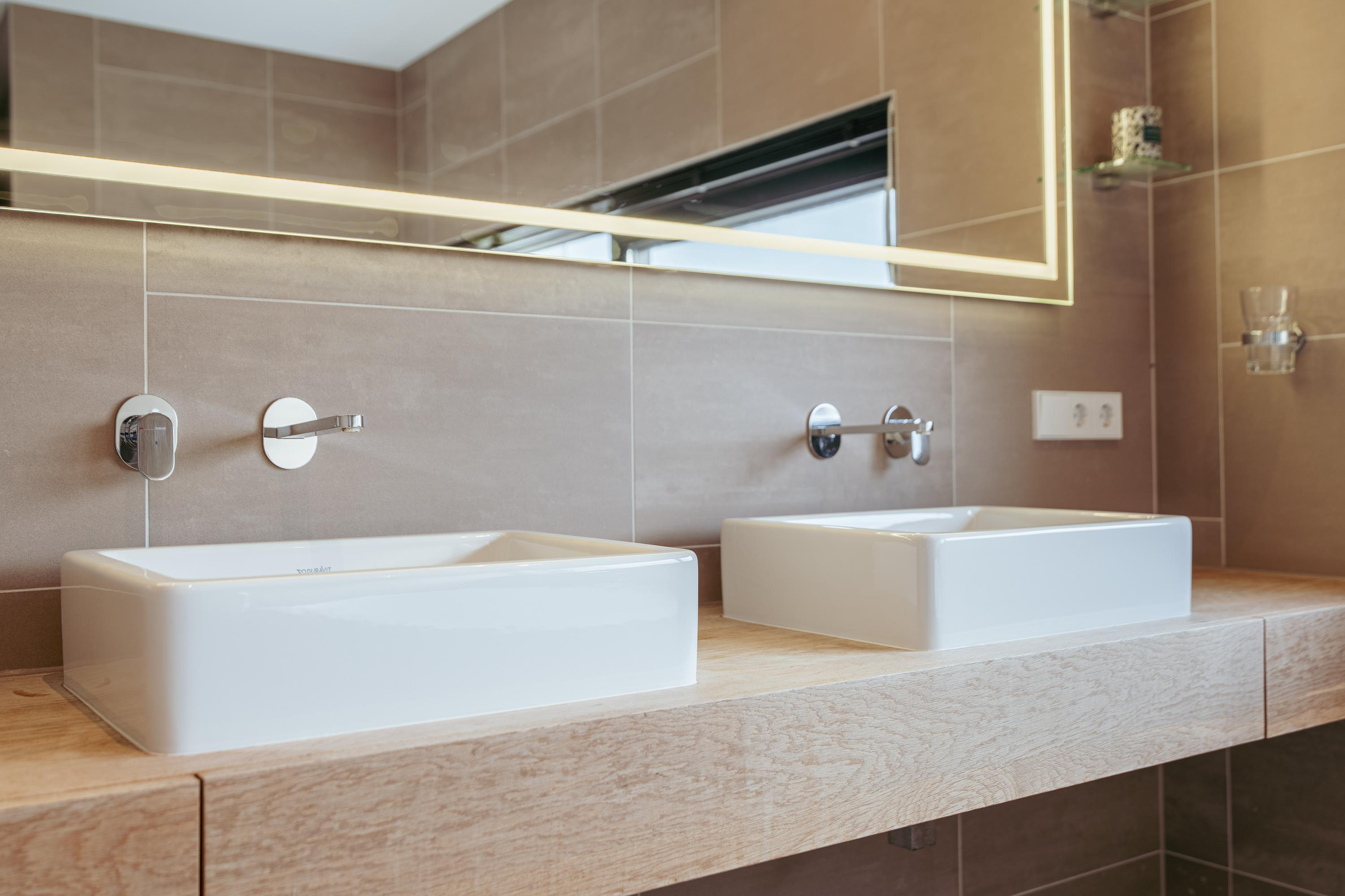 The luxurious bathroom exudes tranquility and sophistication, finished in warm earth tones and high-quality materials. It features a freestanding bathtub, walk-in rain shower, double washbasin, and a sauna — a wonderful private retreat to relax after a busy day.