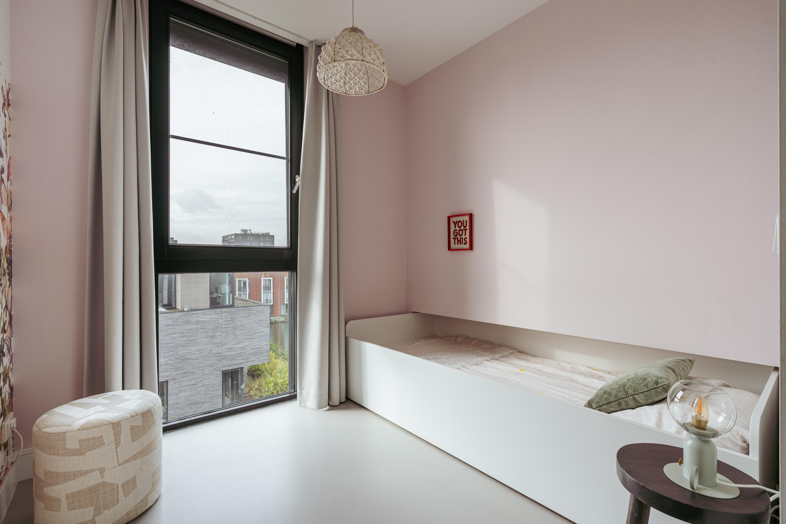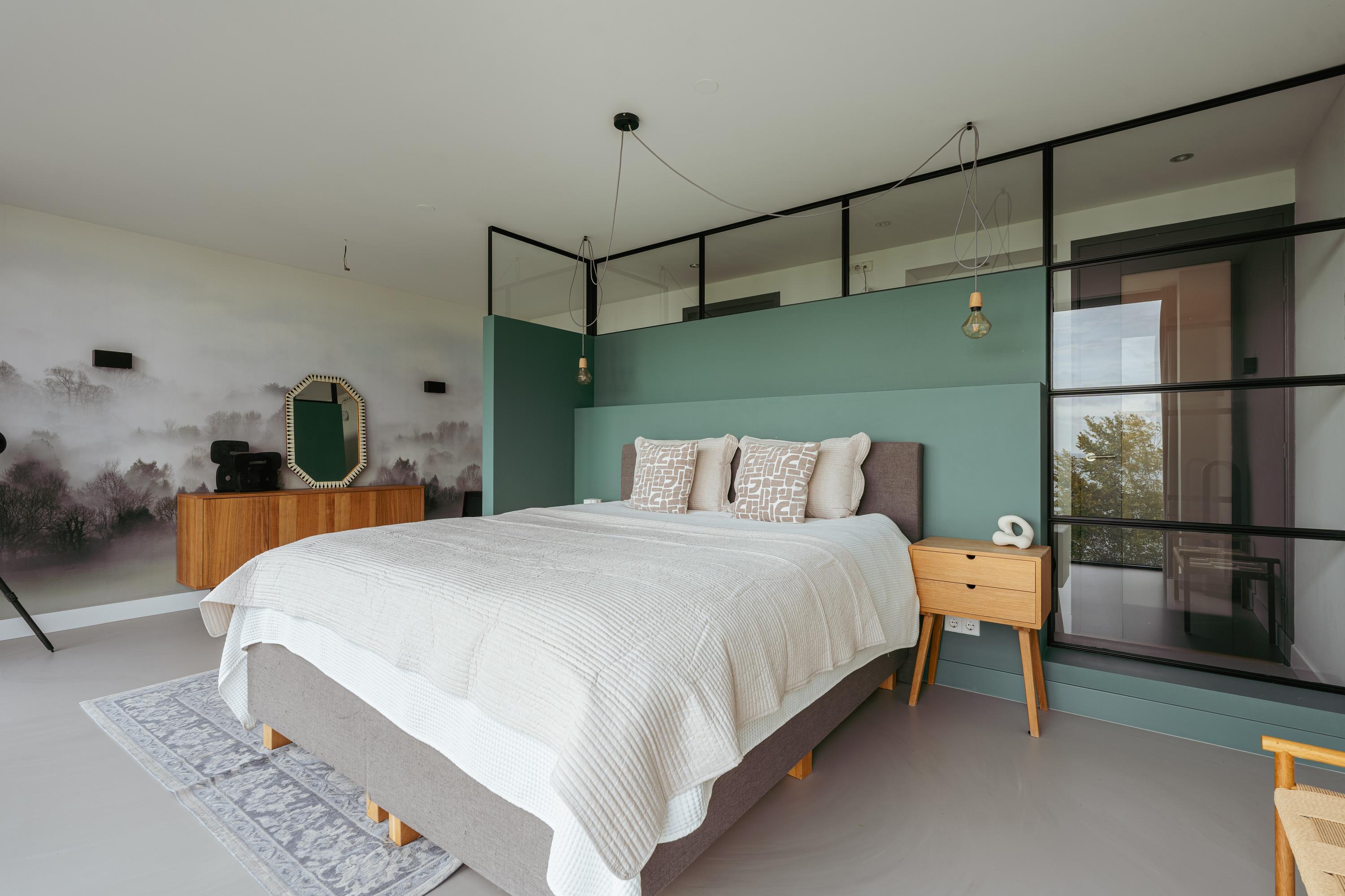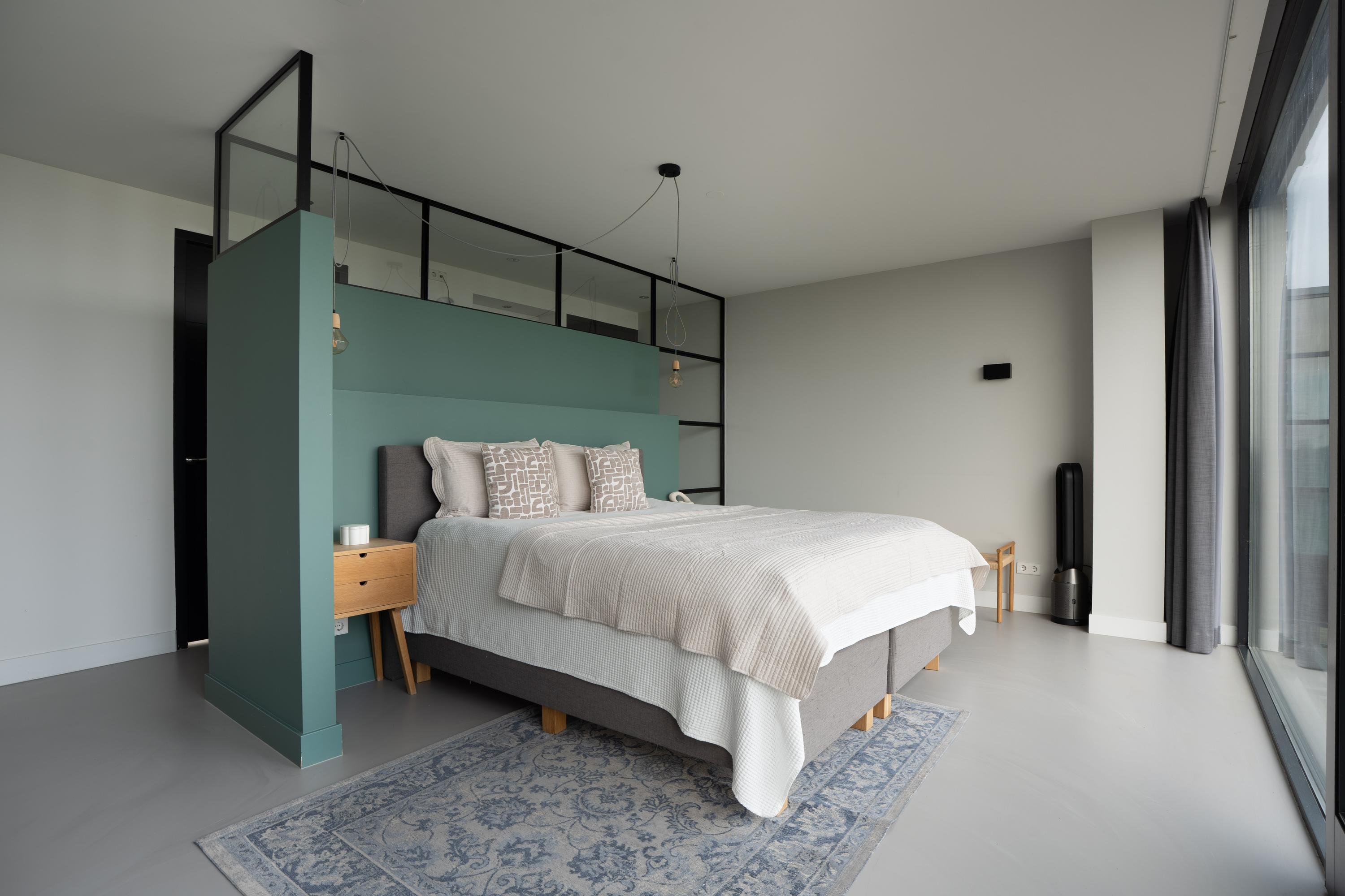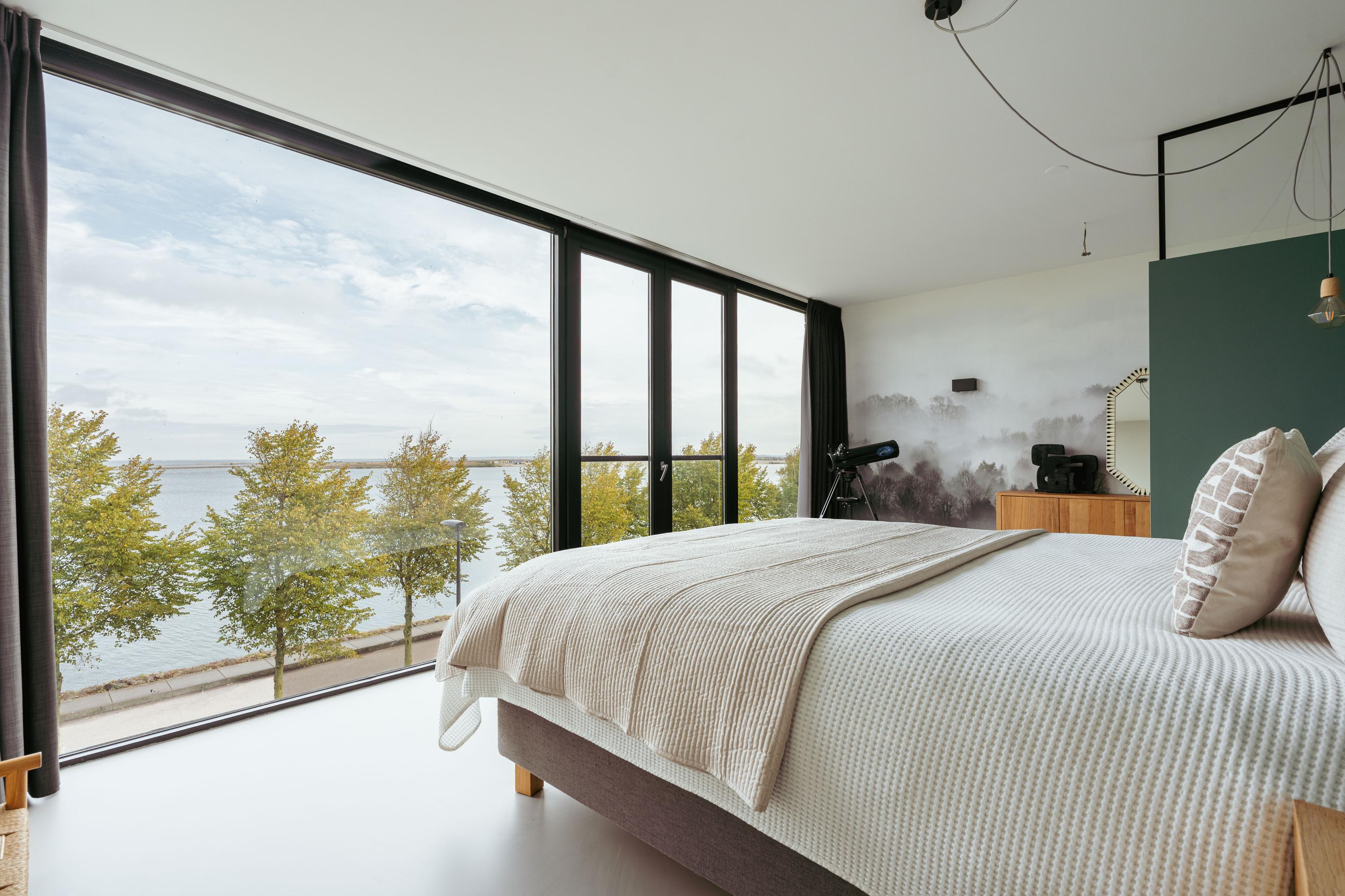 At the front of the house lies a very spacious bedroom, currently arranged as a stylish master suite. The full-width window offers spectacular panoramic views over the IJmeer, while the glass partition wall and soft, neutral color palette create a modern and airy atmosphere.