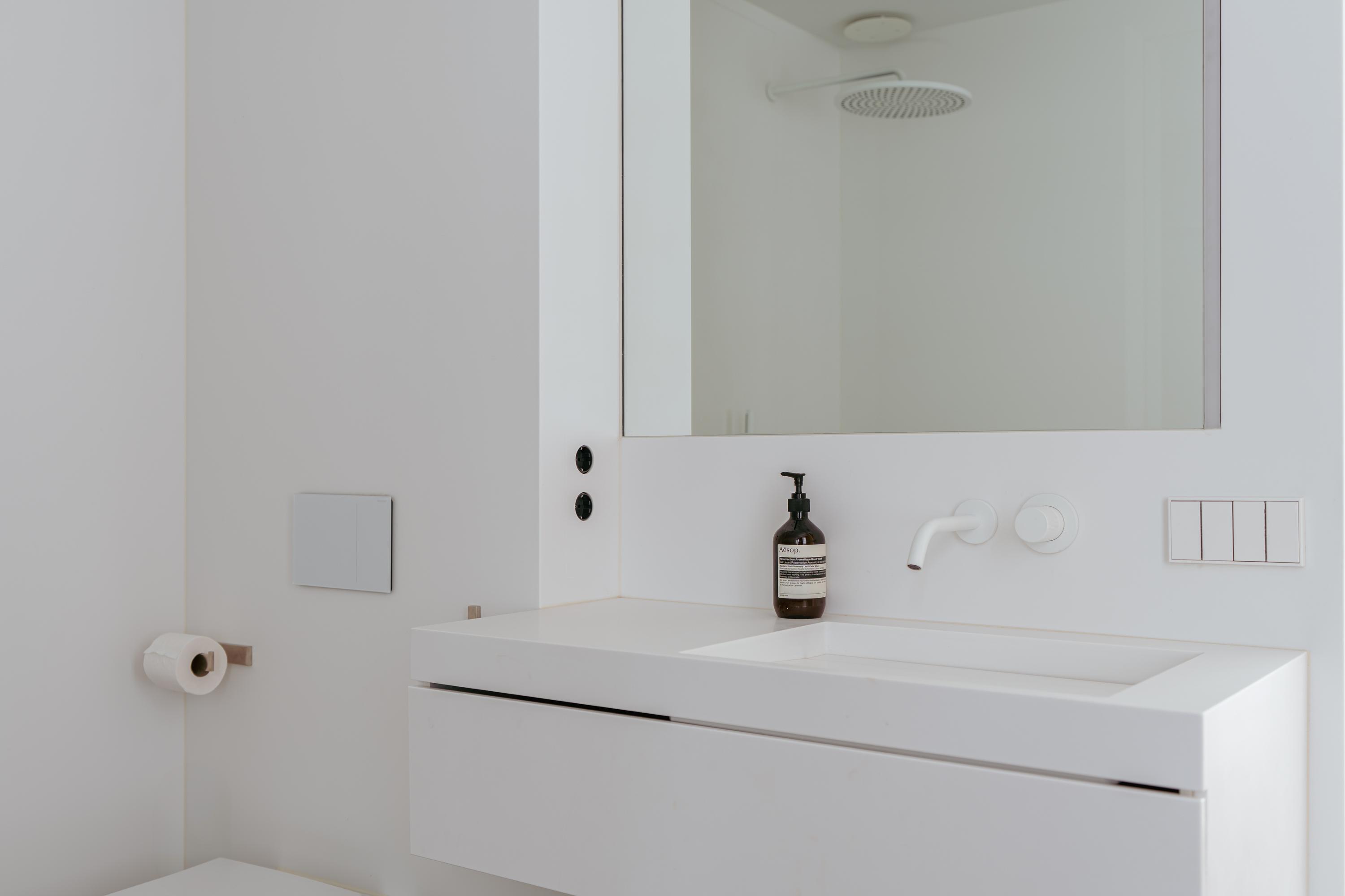 The entrance provides access to both the residence and the multifunctional commercial space on the ground floor. This space is finished with great attention to detail, exuding character through wooden elements, exposed ceiling beams, and high-quality materials. Large double doors at the front can be fully opened, creating an inviting look and allowing for ample natural light. Inside, the space is practical yet stylishly arranged. A compact but luxuriously finished kitchenette, a neat toilet, and a separate laundry and technical room complete this floor. A large skylight at the rear brings in abundant daylight, adding to the open and airy feel. Rear access to a private outdoor space is available, as well as a second entrance directly from the street — providing flexibility for use as a studio, home office, or practice space.