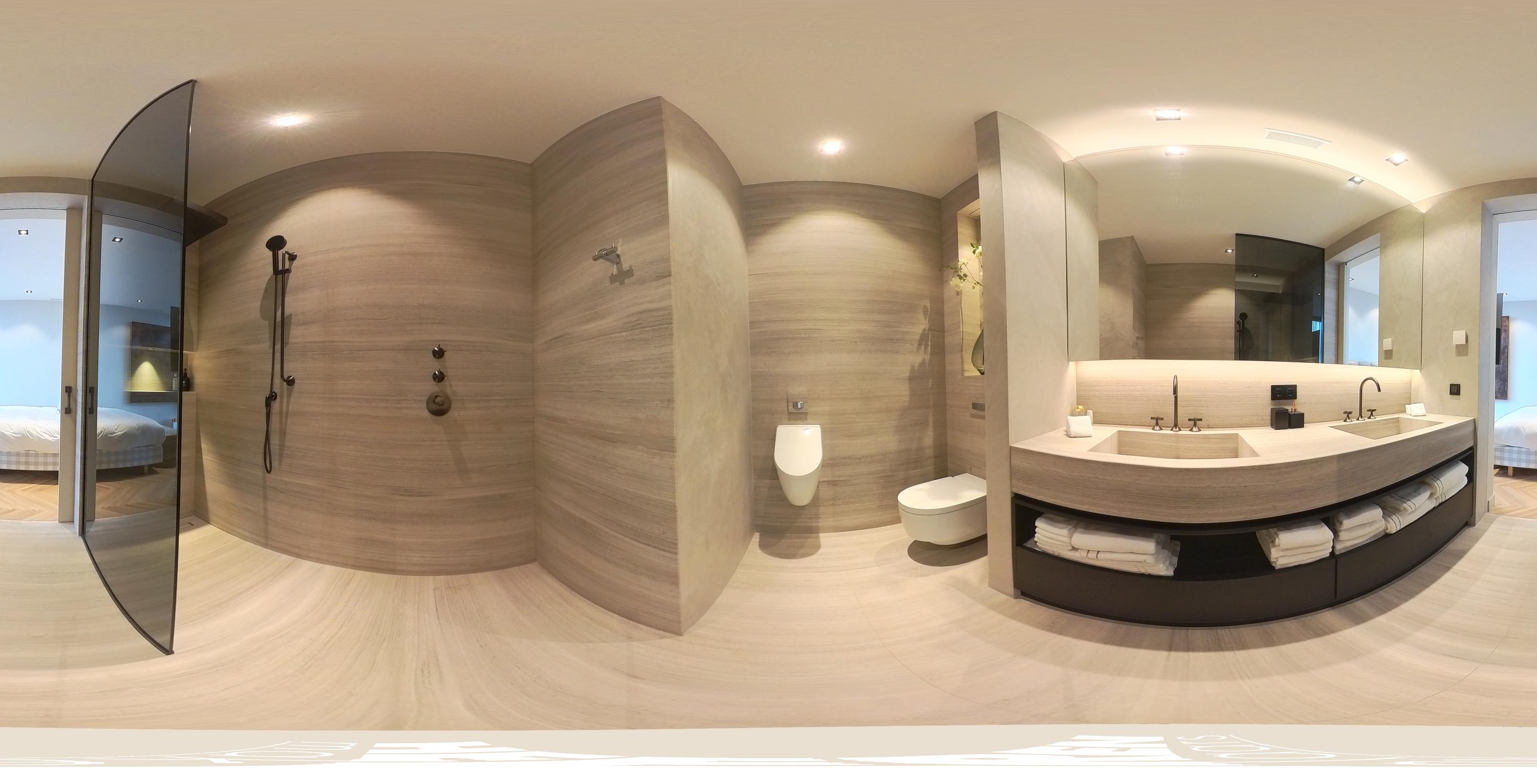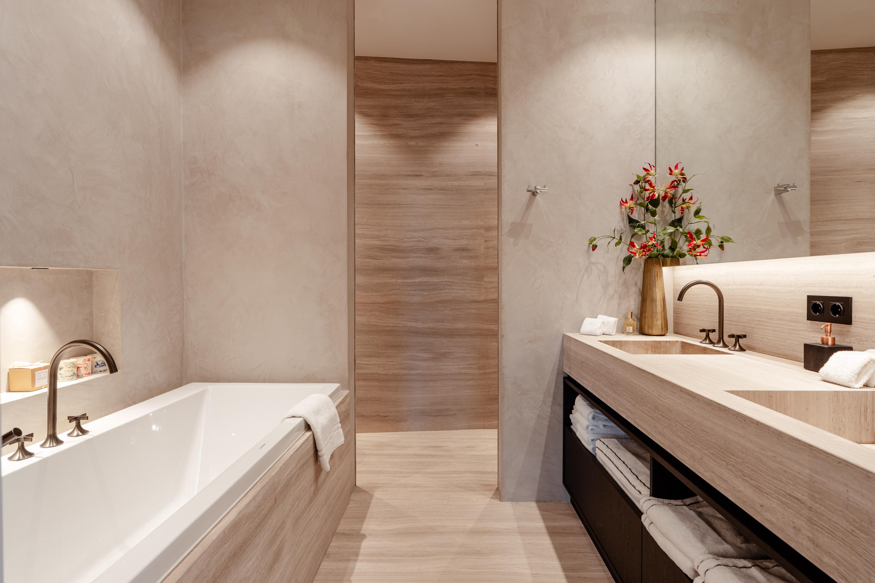The apartment offers three bedrooms, each furnished with luxury Hästens beds. The master suite includes a private walk-in closet and a luxurious bathroom finished in marble and mosaic, featuring a bathtub, double washbasin, walk-in shower, and separate toilet. The second bathroom, designed in warm earthy tones, is also fully equipped and smartly laid out. Throughout the apartment lies a beautiful wooden floor, combined with underfloor and ceiling heating and cooling, recessed lighting, and electric sun blinds. A private storage room, as well as a technical and laundry room, are also included.