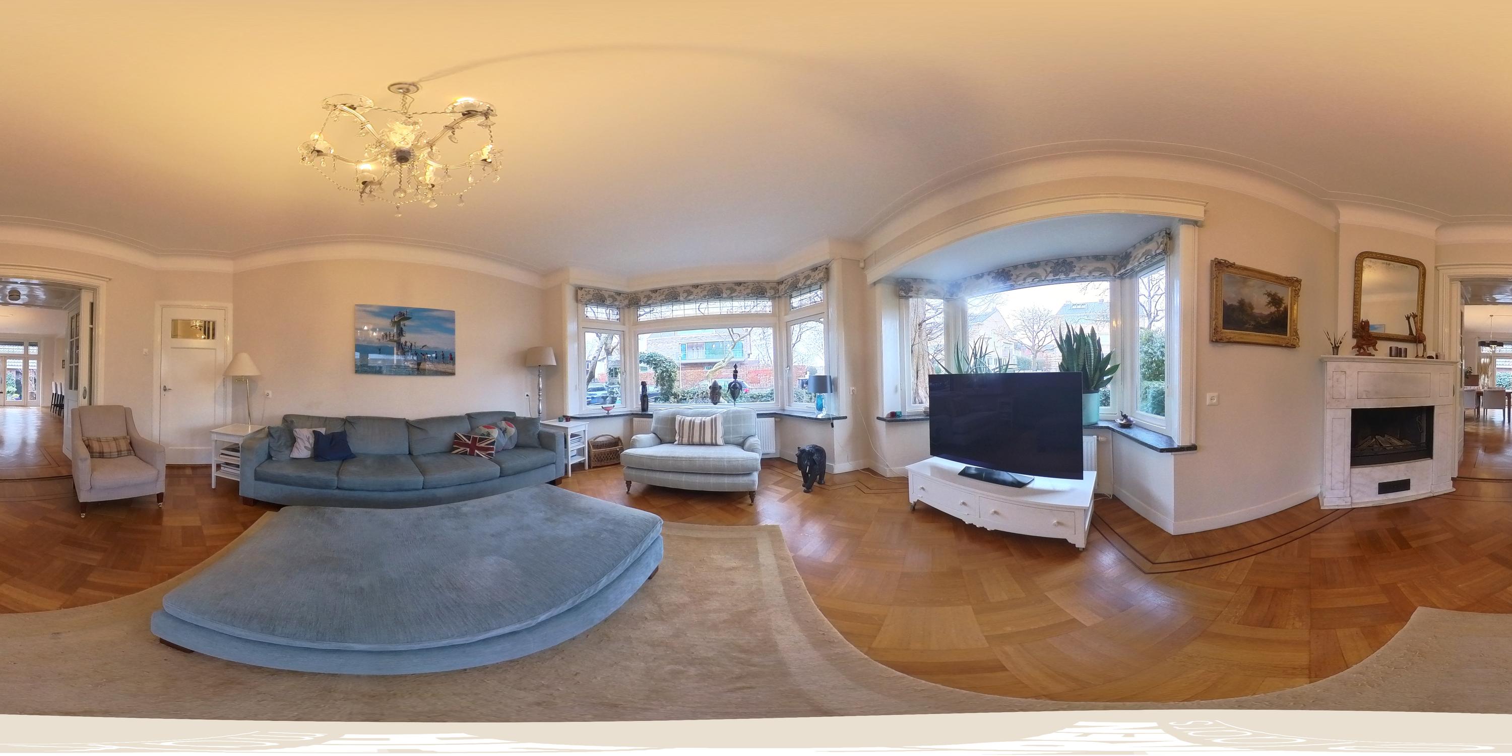 This floor is characterised by beautiful original stained-glass windows and an elegant parquet floor with border. At the front of the house is the spacious and bright en-suite living room with fireplace, creating a warm and inviting living space.