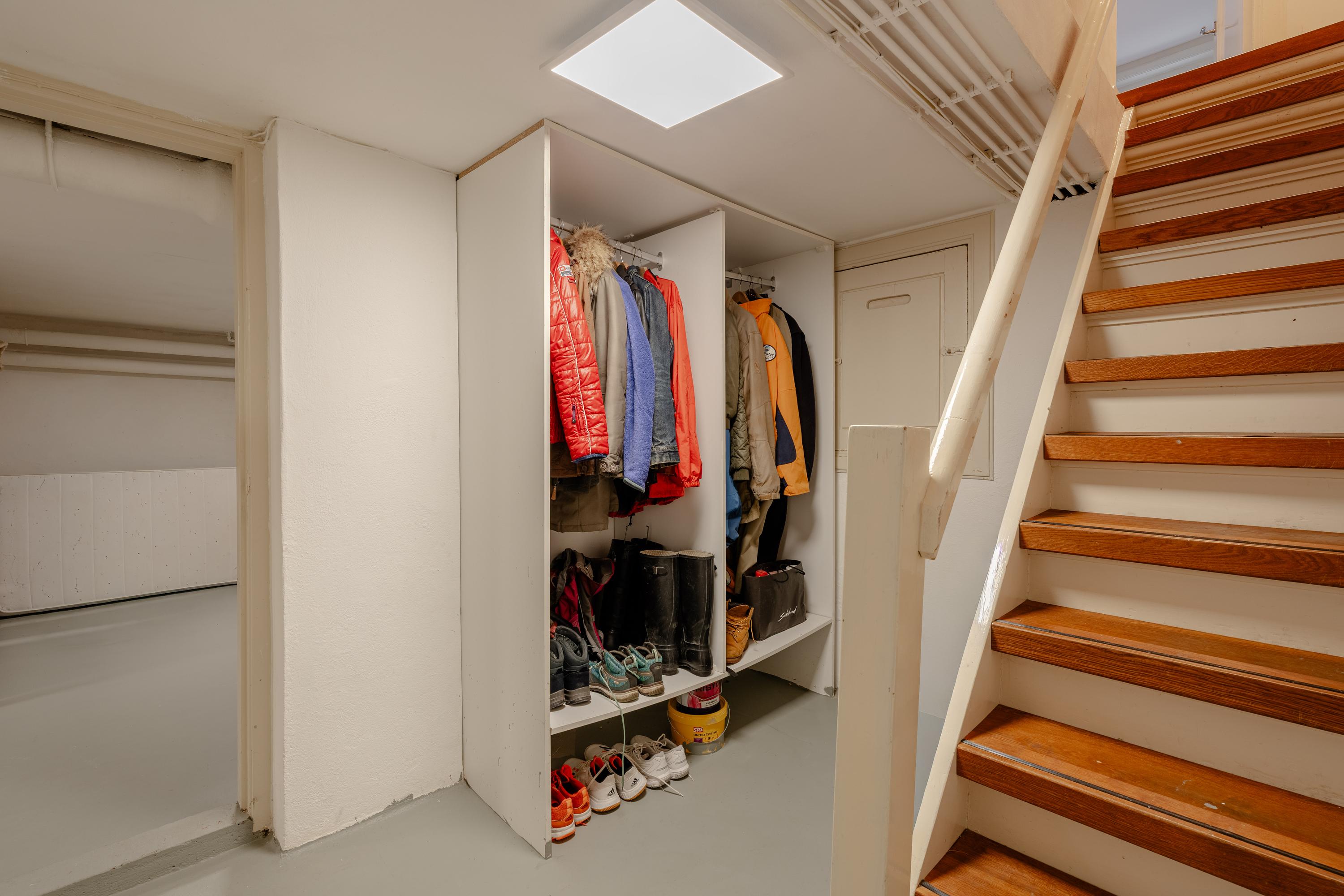 The connections for the washing machine and dryer are located here, and there is ample storage space. Due to its generous size and practical layout, the basement offers various possibilities such as a gym, playroom, workspace or studio.
