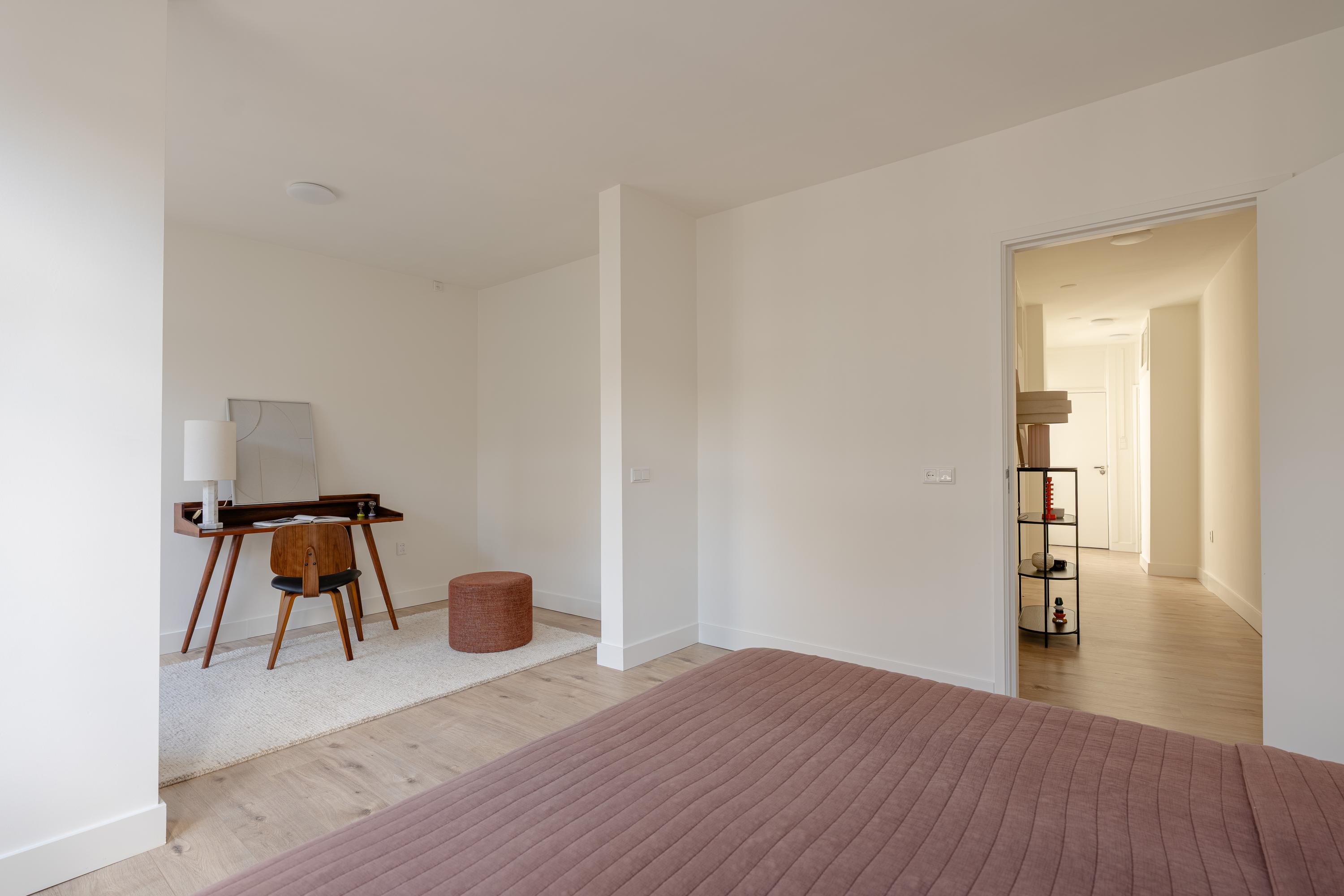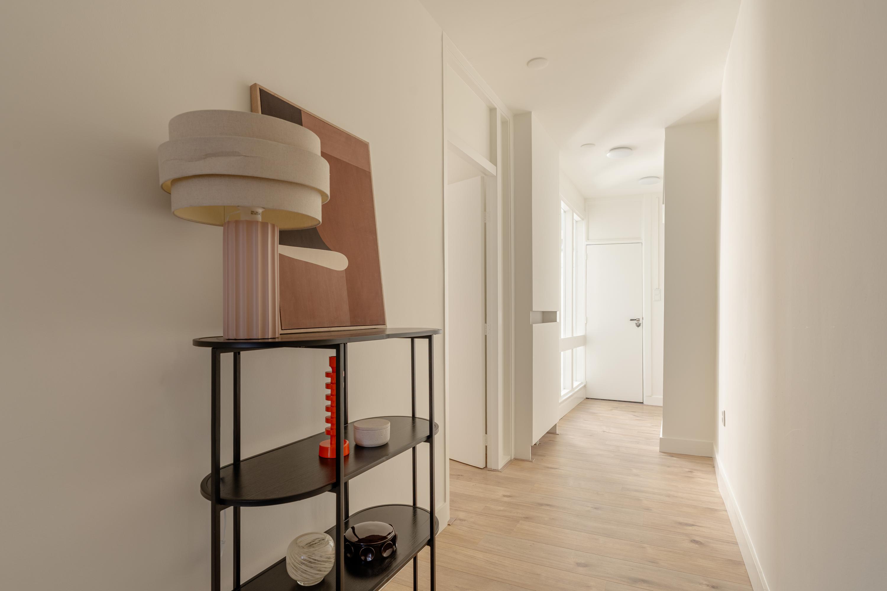 The second bedroom is generously sized and includes built-in wardrobes. At the front is a large bedroom with space for a walk-in closet. French doors open onto a balcony facing Nieuwe Spiegelstraat with a fantastic view.
