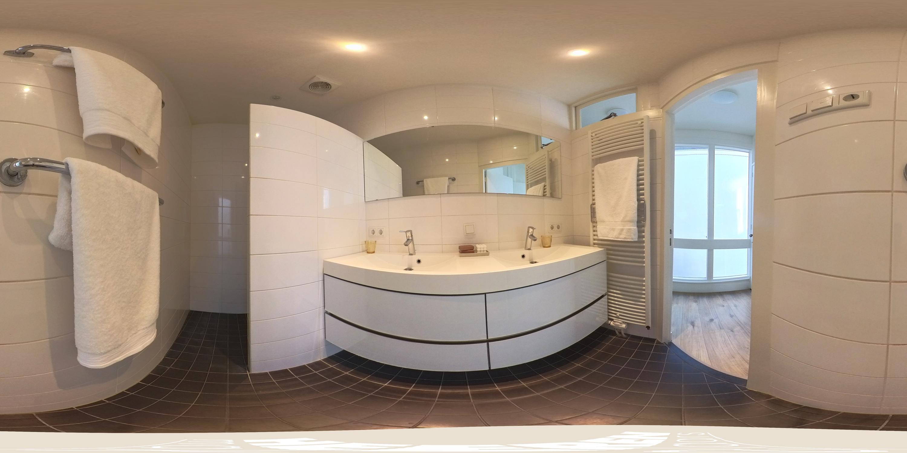 Bright hallway with partial view of the roof terrace. The bathroom features a double washbasin and walk-in shower.