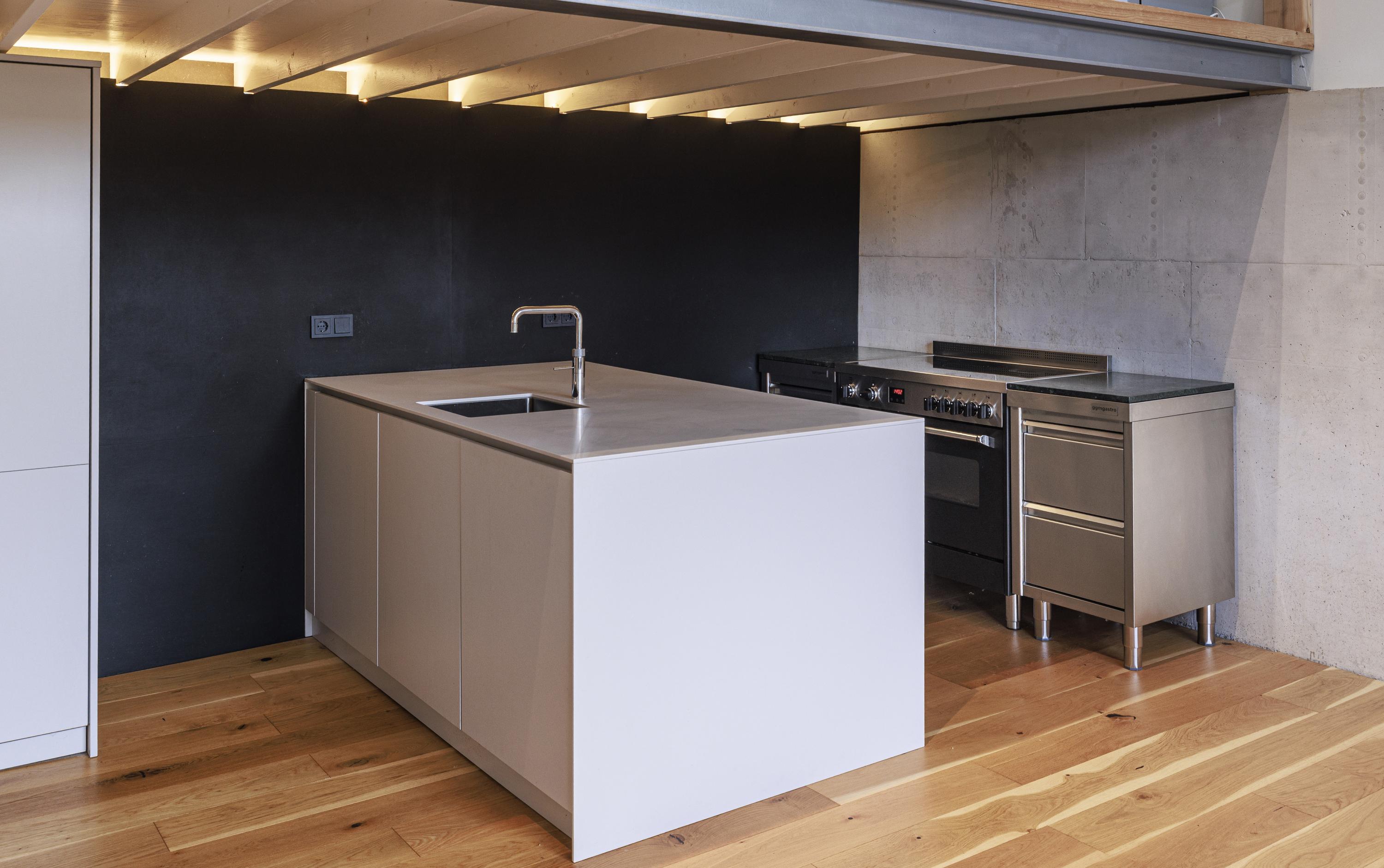 Inside, the home is just as cool. Old and modern materials were used in the new construction/renovation. Tough wooden construction beams, raw concrete, oak floorboards, classic member radiators and the steel spiral staircase are some examples.
