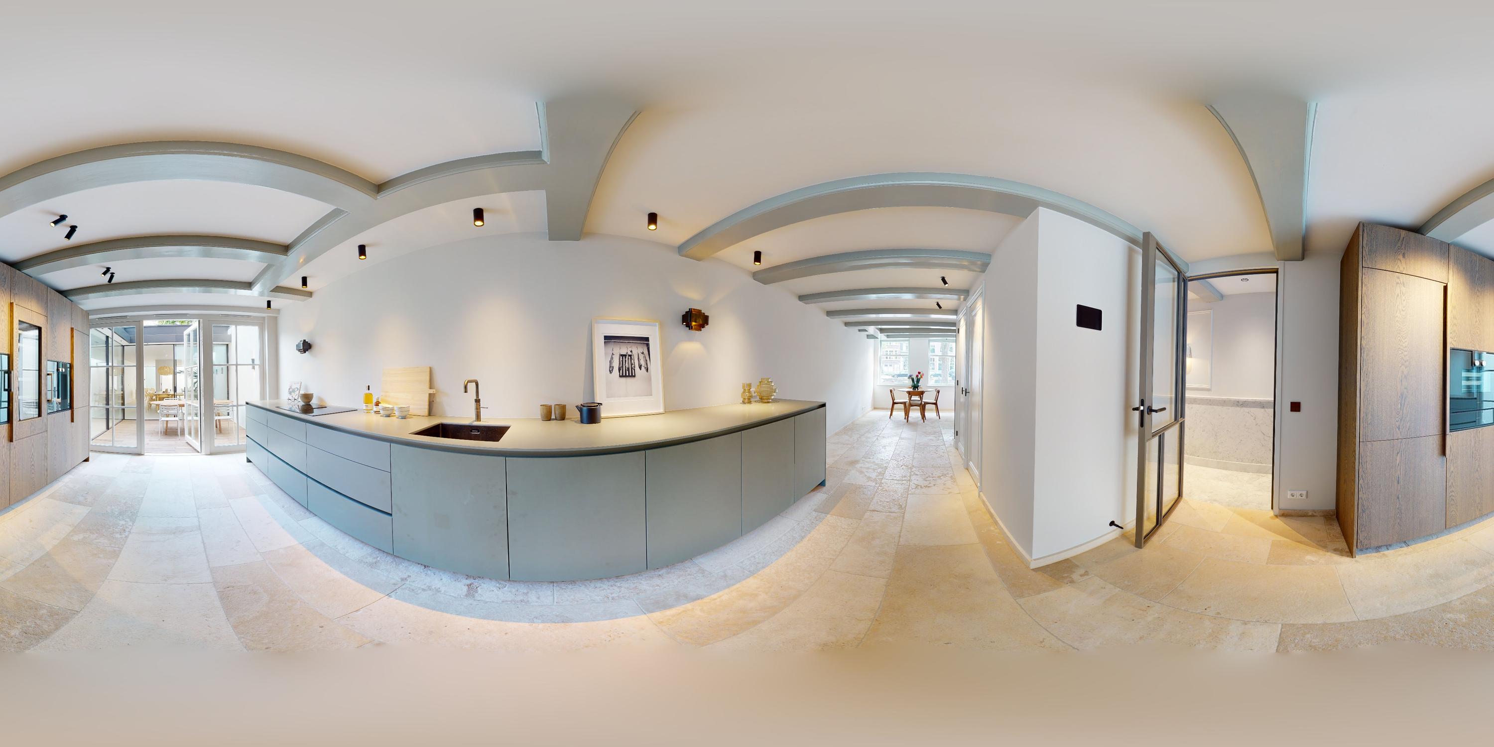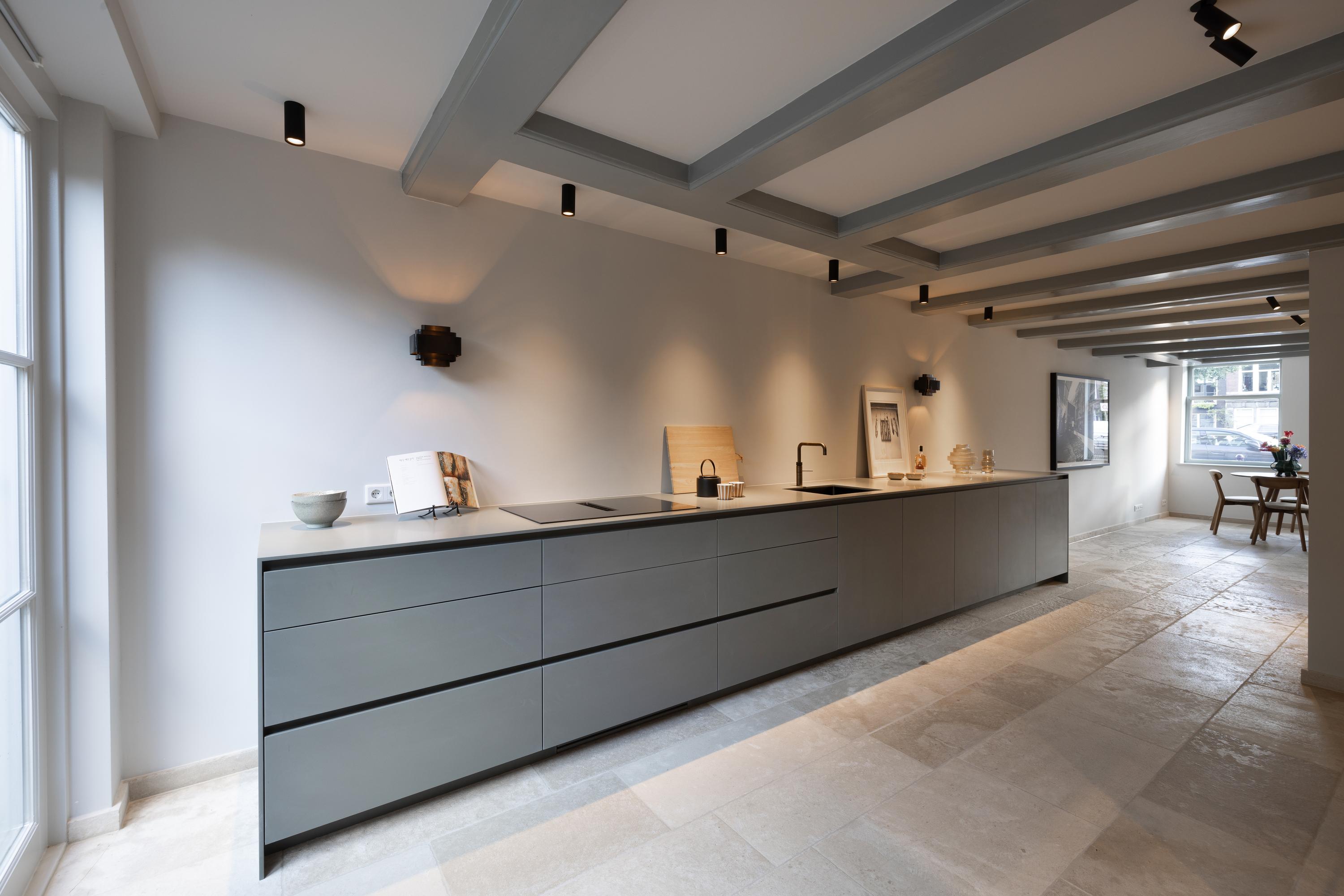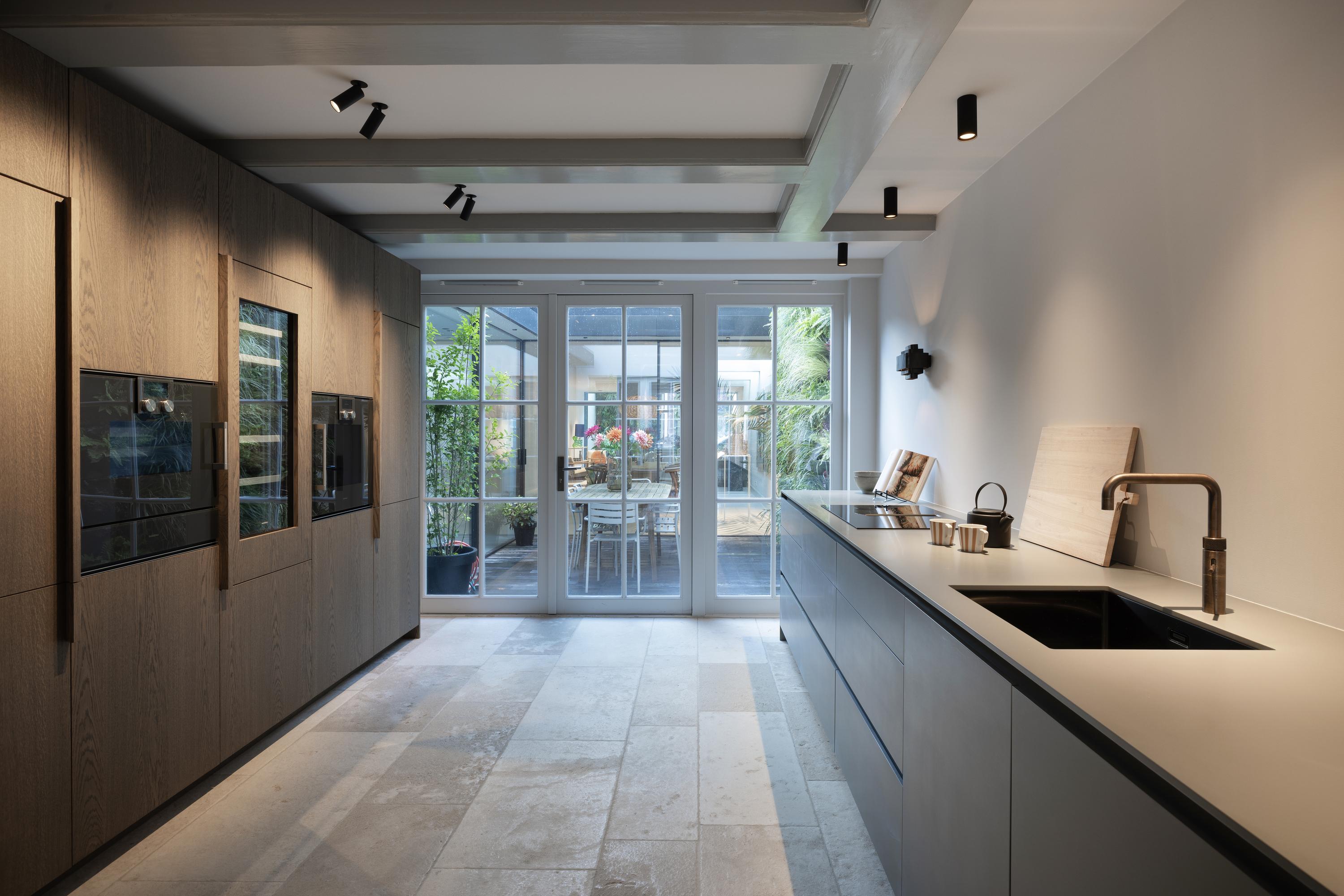 Stunning glazed steel doors lead into the property’s living kitchen. At the front of this floor, there is a dining room with a view of the canal through big windows. The luxury kitchen is equipped with a number of Gaggenau built-in appliances, including a double fridge and freezer, dishwasher, wine climate cabinet, (steam) oven, warming drawer, a sink with a Quooker tap and an induction hob with a built-in extraction system. A spacious patio floods the kitchen with light and can be accessed from both the kitchen and the living room.