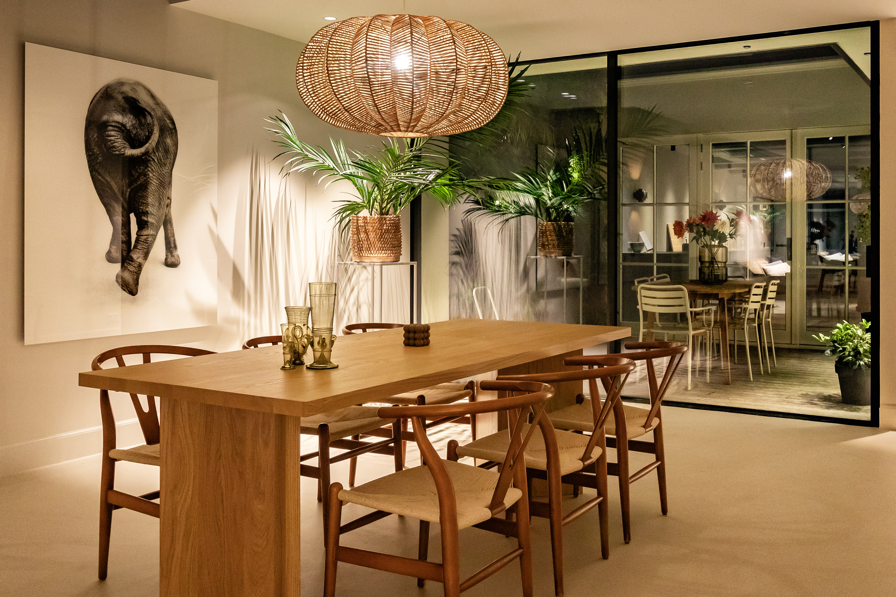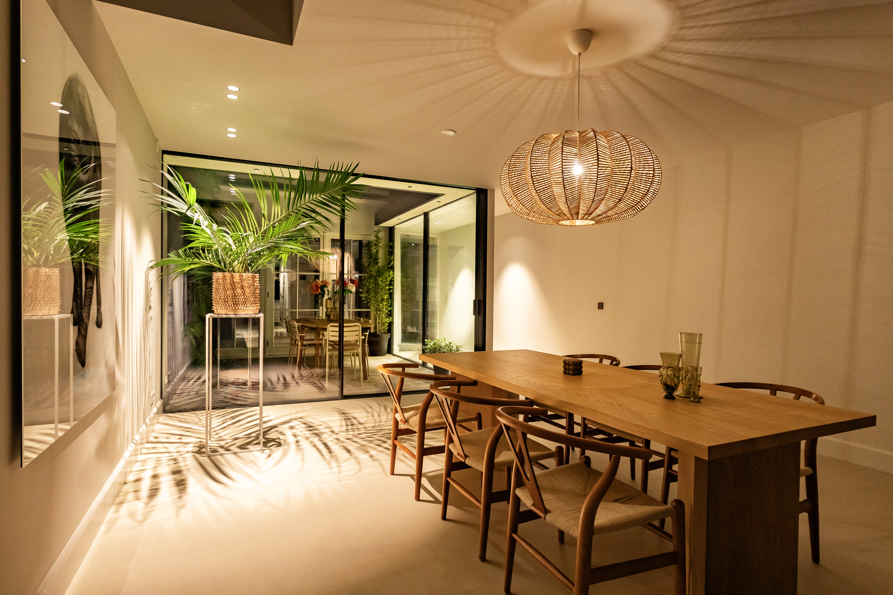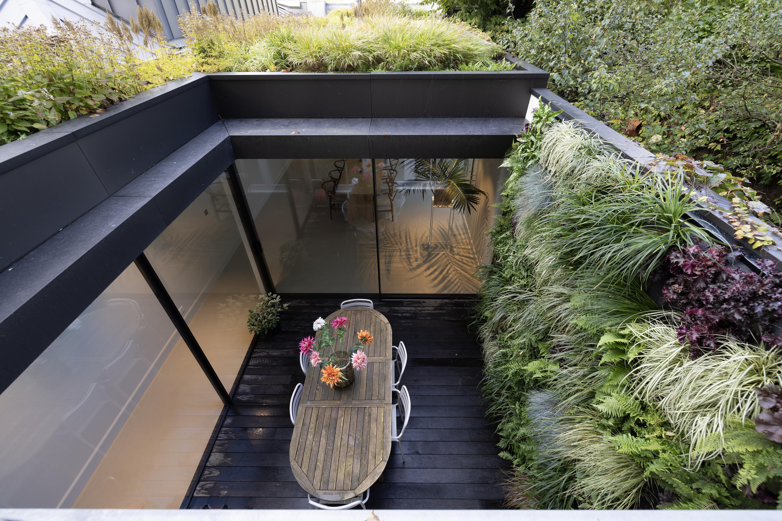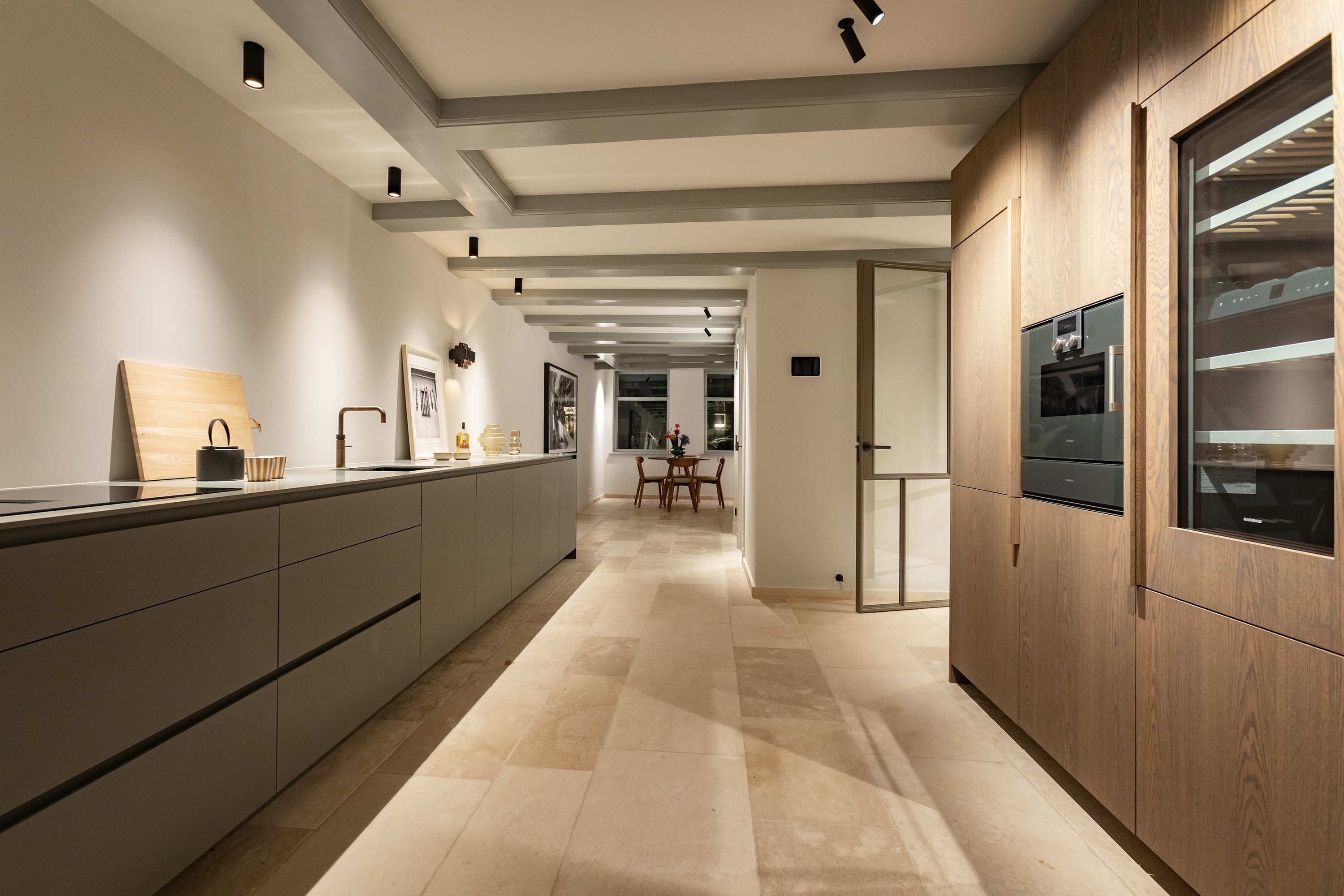 Stunning glazed steel doors lead into the property’s living kitchen. At the front of this floor, there is a dining room with a view of the canal through big windows. The luxury kitchen is equipped with a number of Gaggenau built-in appliances, including a double fridge and freezer, dishwasher, wine climate cabinet, (steam) oven, warming drawer, a sink with a Quooker tap and an induction hob with a built-in extraction system. A spacious patio floods the kitchen with light and can be accessed from both the kitchen and the living room.