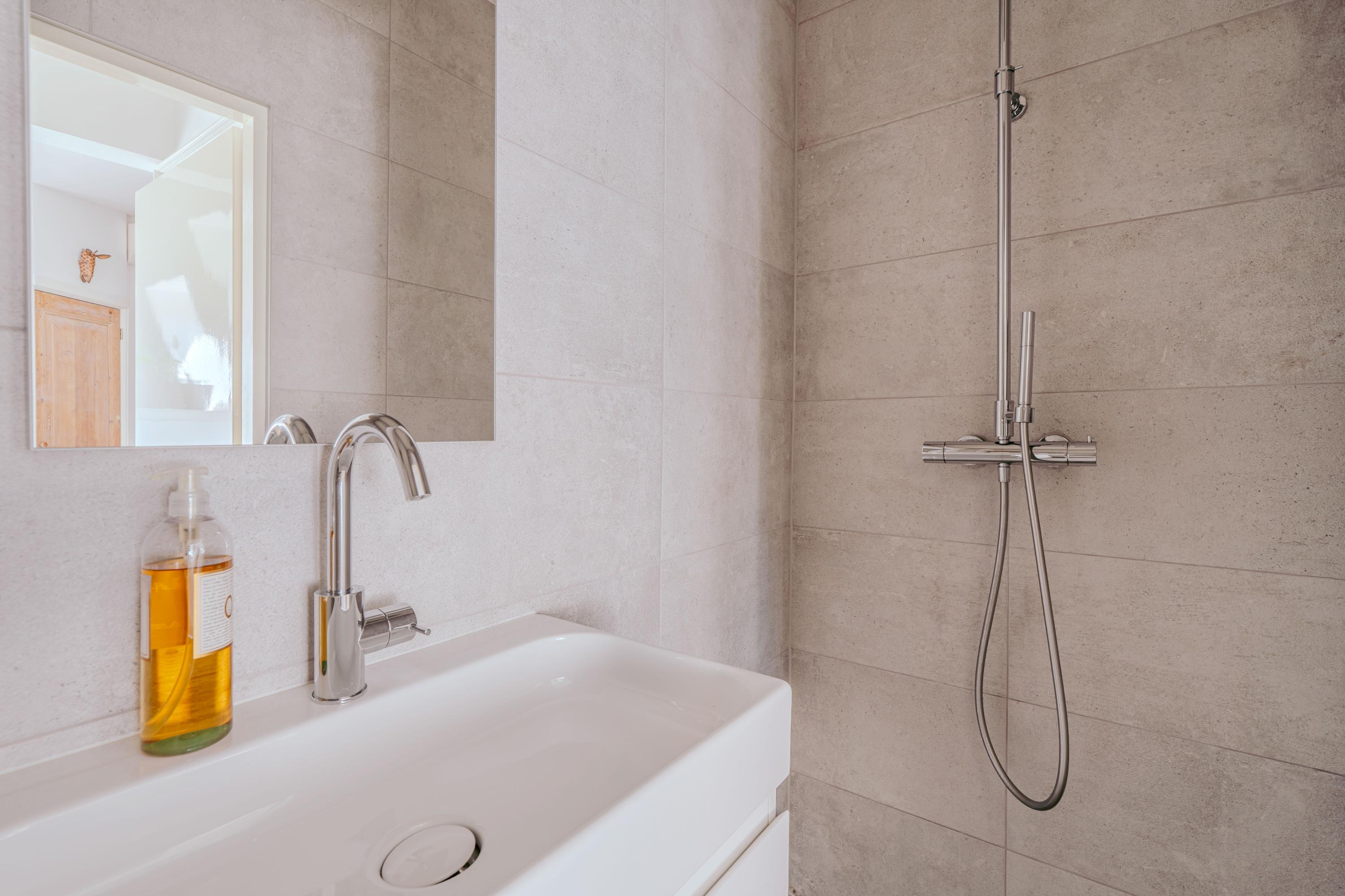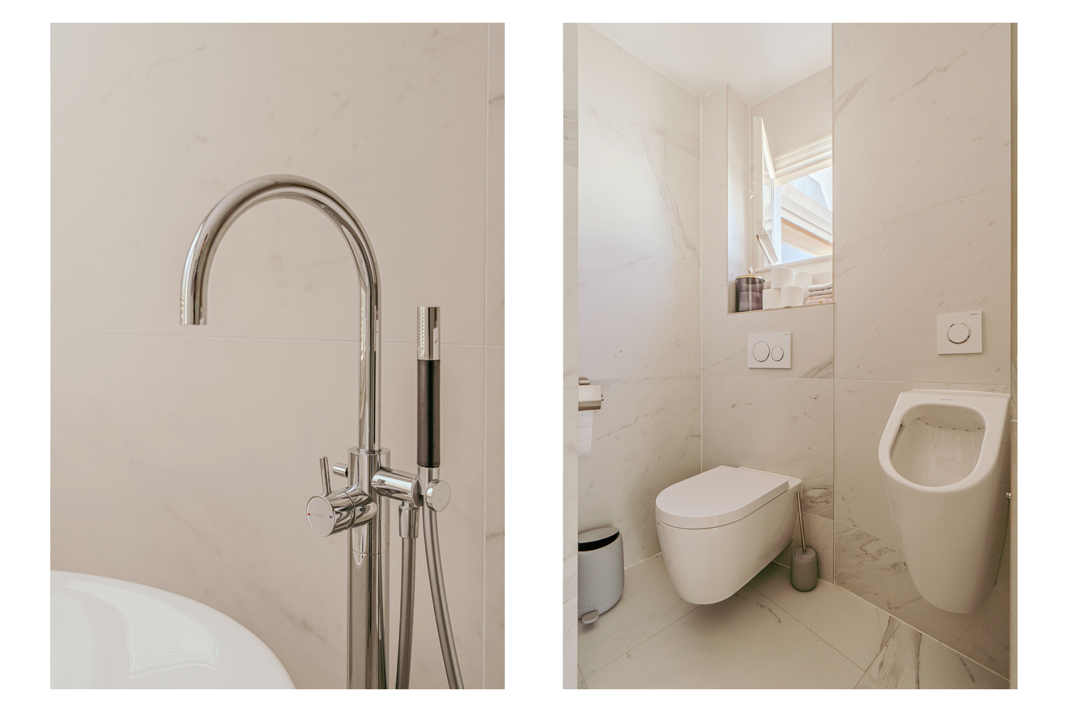 The second staircase takes you directly into the living room on the third floor, which features a kitchenette, two large storage rooms, air conditioning, and an additional bathroom. This bathroom includes a washbasin with vanity unit, a shower, and a toilet. At the front of this floor, you'll find a fourth generously sized bedroom with an adjoining office space, both equipped with air conditioning. These rooms are accessible via the central stairwell on the right side of the property. From the living room, you can ascend to the sun-drenched rooftop terrace, where you can enjoy the sun until the late evening hours. The rooftop terrace spans more than 23 m² – a true rarity in the city!