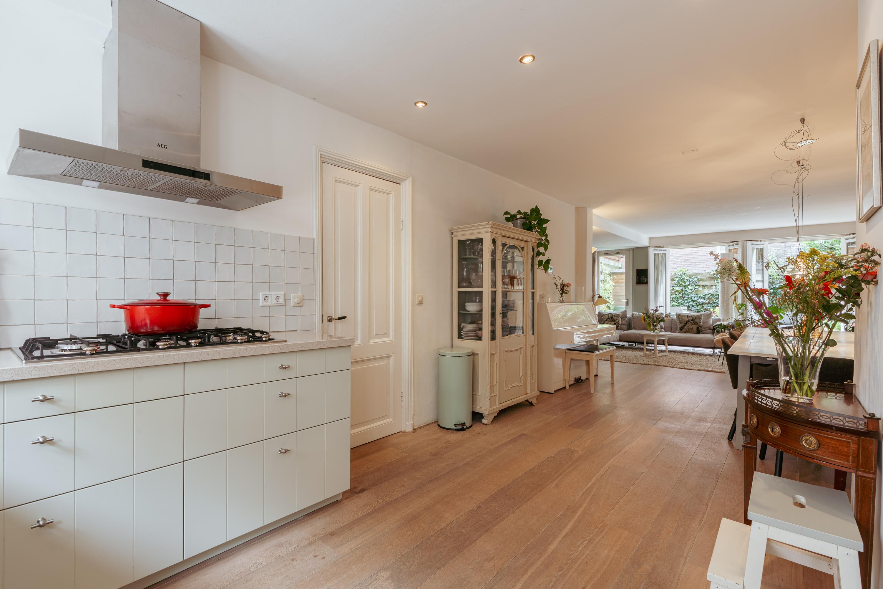 Entrance with hallway, featuring a cloakroom, built-in cupboard, and separate toilet. From the hallway you enter the spacious living room with large windows and French doors opening onto the garden. This charming space offers plenty of possibilities for a comfortable seating area and a generous dining table. At the front is the modern kitchen, completely renewed in 2022 and fitted with a 5-burner gas stove, extractor hood, combination oven, sink, dishwasher, refrigerator, freezer, and ample cupboard space. From the living room, French doors lead to the rear garden – a delightful place to enjoy outdoor living in peace and quiet. The garden also includes a practical storage shed.