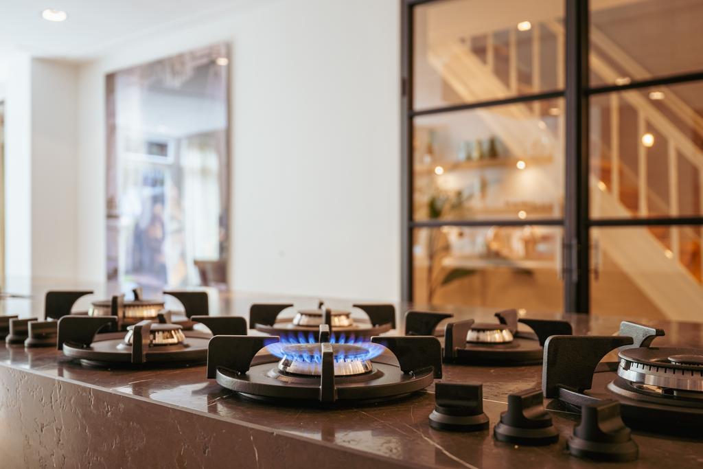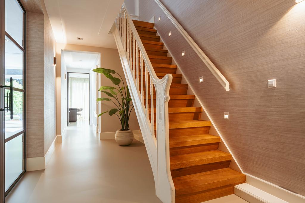 To the front is a bedroom with an en-suite bathroom featuring a washbasin and walk-in shower—currently used as a home gym, but easily repurposed. At the rear is the stunning open-plan kitchen, the centerpiece of this level. Outfitted with Gaggenau appliances, including a fridge, freezer, Quooker, five-burner gas stove integrated into the counter, oven, steam oven, dishwasher, and wine fridge, the kitchen combines luxury and functionality. A solid natural stone countertop with a wooden breakfast bar provides a warm, refined look.
