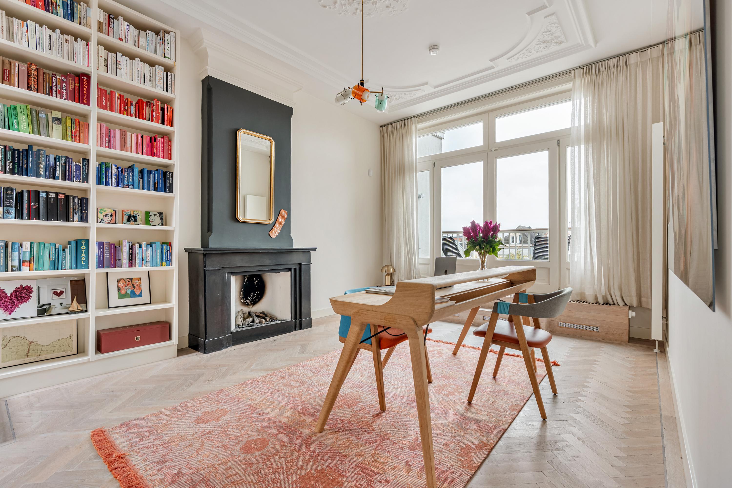 On the distinguished Vossiusstraat, directly bordering the Vondelpark, lies this remarkable upper residence of approximately 183 m², spread over two floors and featuring several outdoor spaces, including a spacious roof terrace of no less than 59 m². The home combines the character of a classic Amsterdam townhouse with the comfort of a modern residence. High ceilings with original ornaments, a light herringbone floor, wooden en-suite doors and marble details give the interior timeless elegance, while the layout and finish create a sense of calm and warmth.