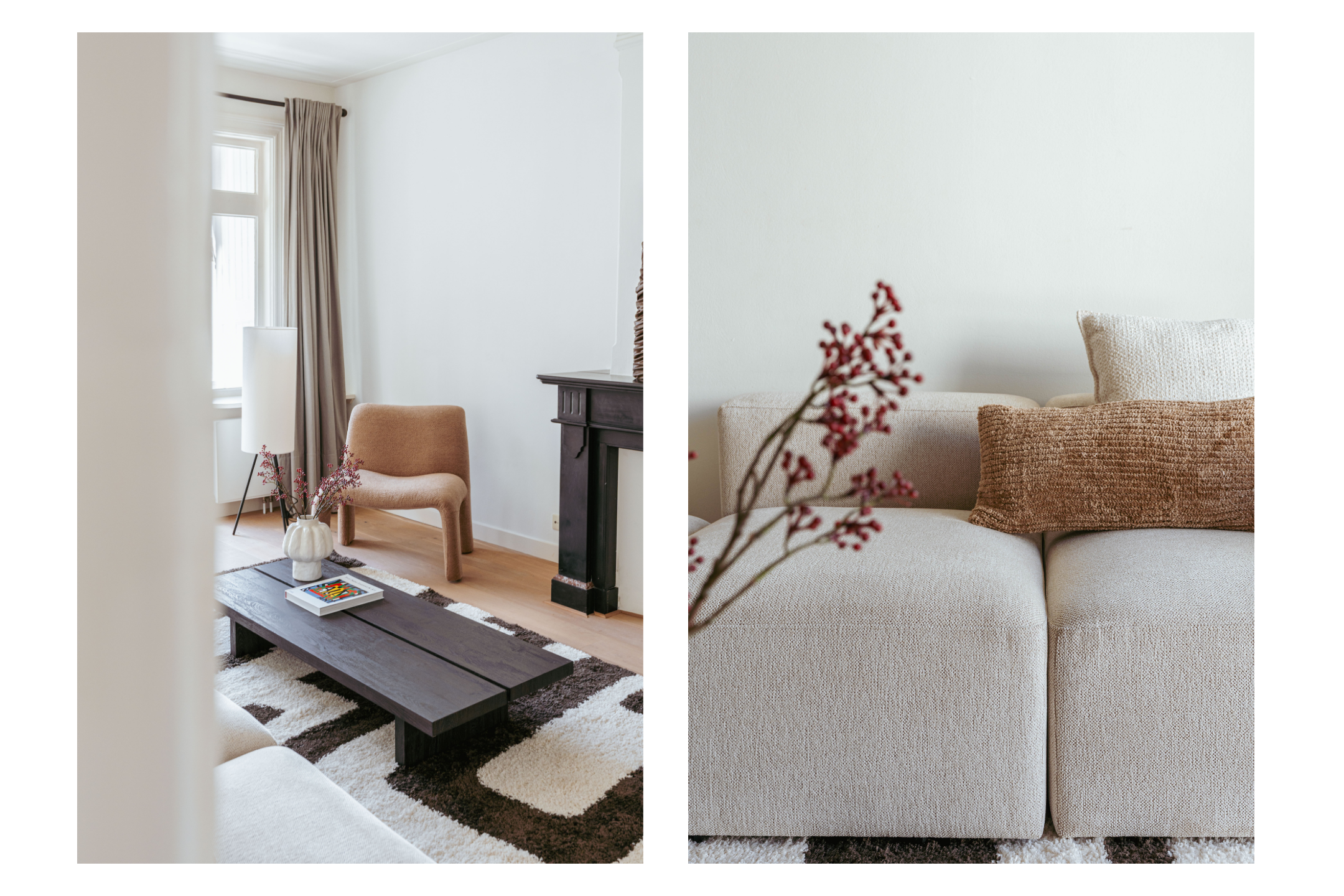 The apartment can be accessed via both the first and second floors. On the second floor, you’ll find the generous through-living room, which benefits from large windows on both sides, filling the space with natural light. There is ample room for a comfortable seating area as well as a spacious dining area with a large dining table. The elegant fireplace adds a charming focal point to the room.
