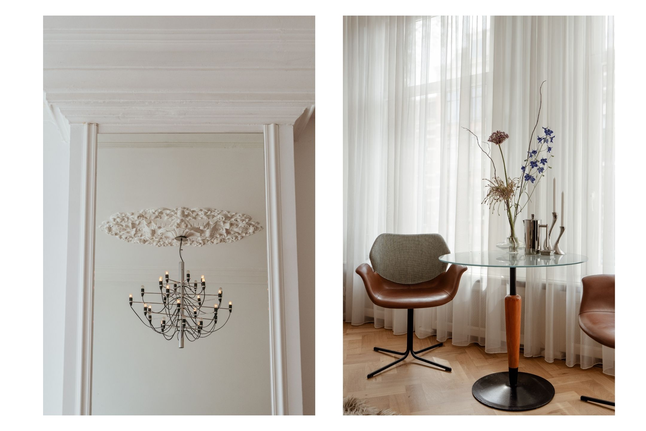 Aan de voorzijde van de woning bevindt zich de royale woonkamer met sfeervolle (open) haard en grote raampartijen, waardoor de ruimte baadt in natuurlijk licht. De woonkamer wordt extra gekenmerkt door prachtige authentieke details, waaronder rijk gedecoreerde plafondornamenten en originele schuifdeuren, die de ruimte een elegante en karaktervolle uitstraling geven. Dankzij de riante afmetingen is dit een ideale plek voor een comfortabele zithoek en een royale leefruimte.