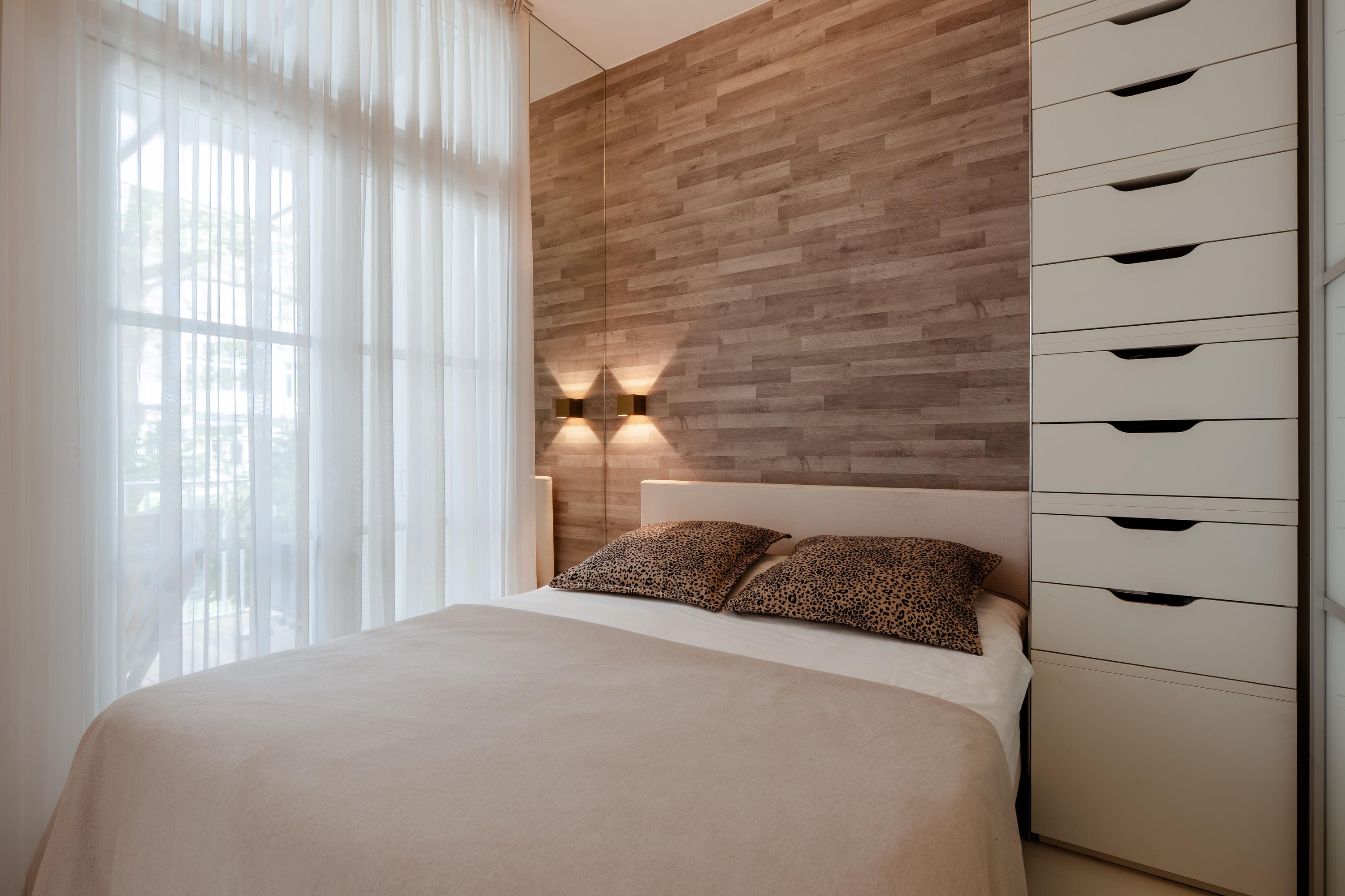 Dubbele openslaande deuren geven toegang tot het zeer diepe balkon van circa 17 m², voorzien van een terrasoverkapping en een praktische hoge balkonkast. De slaapkamer is rustig gelegen aan de achterzijde van de woning en beschikt eveneens over dubbele openslaande deuren naar het balkon. Het balkon is zowel vanuit de woonkeuken als via de slaapkamer bereikbaar.