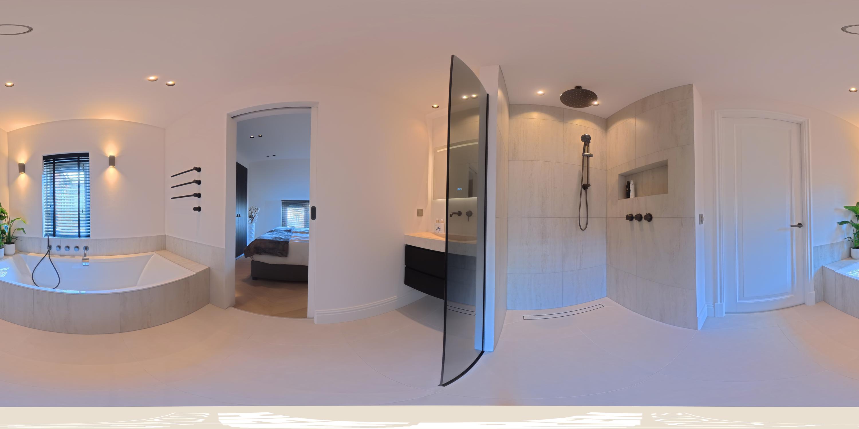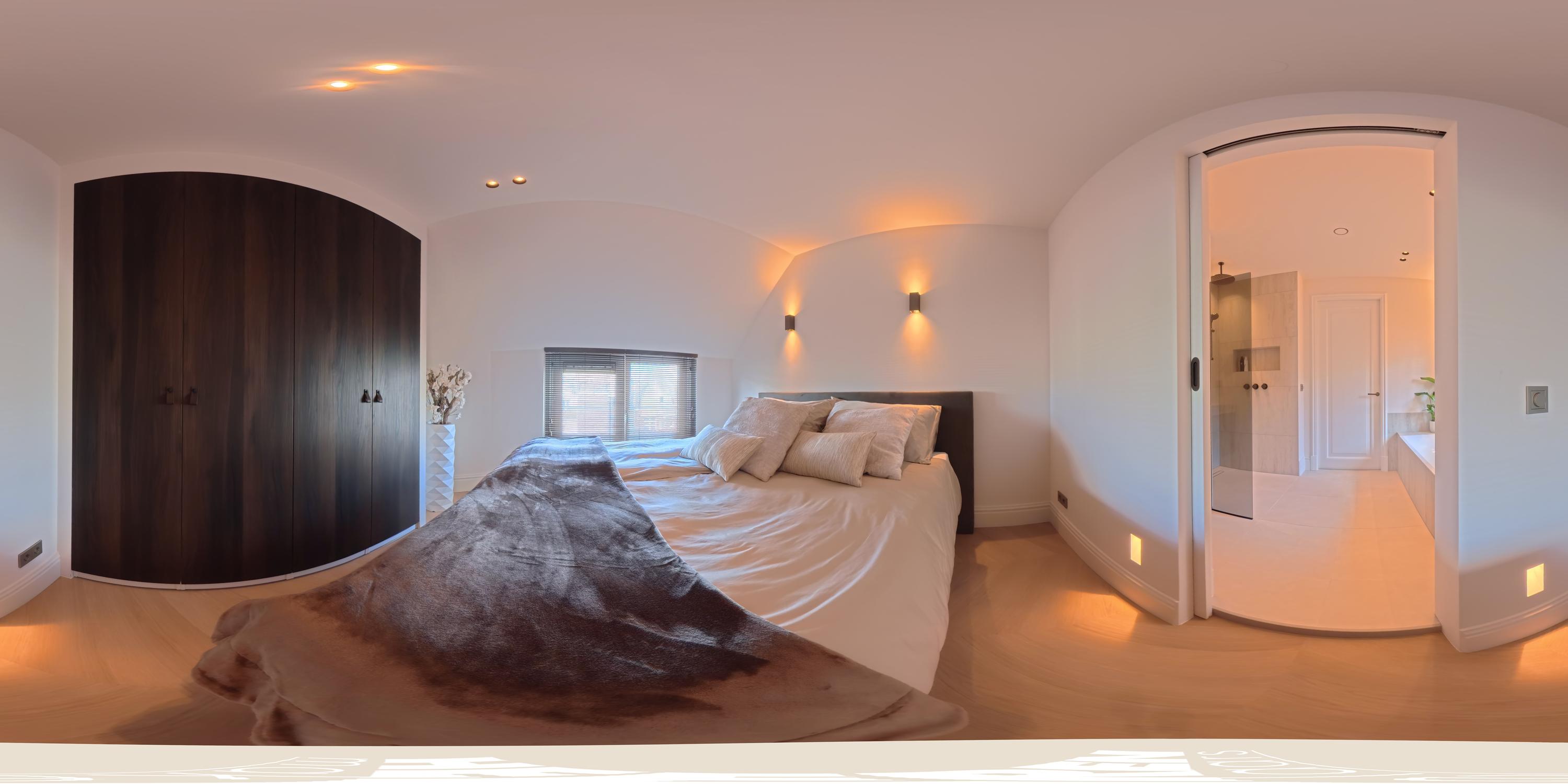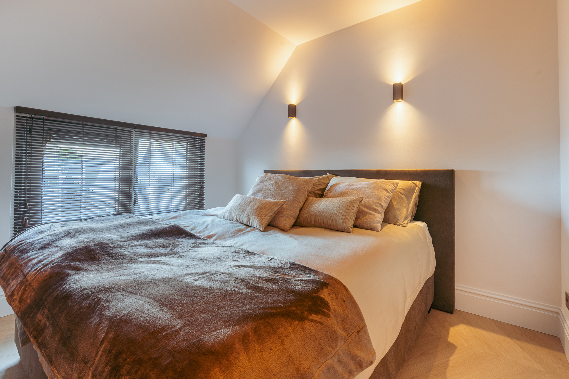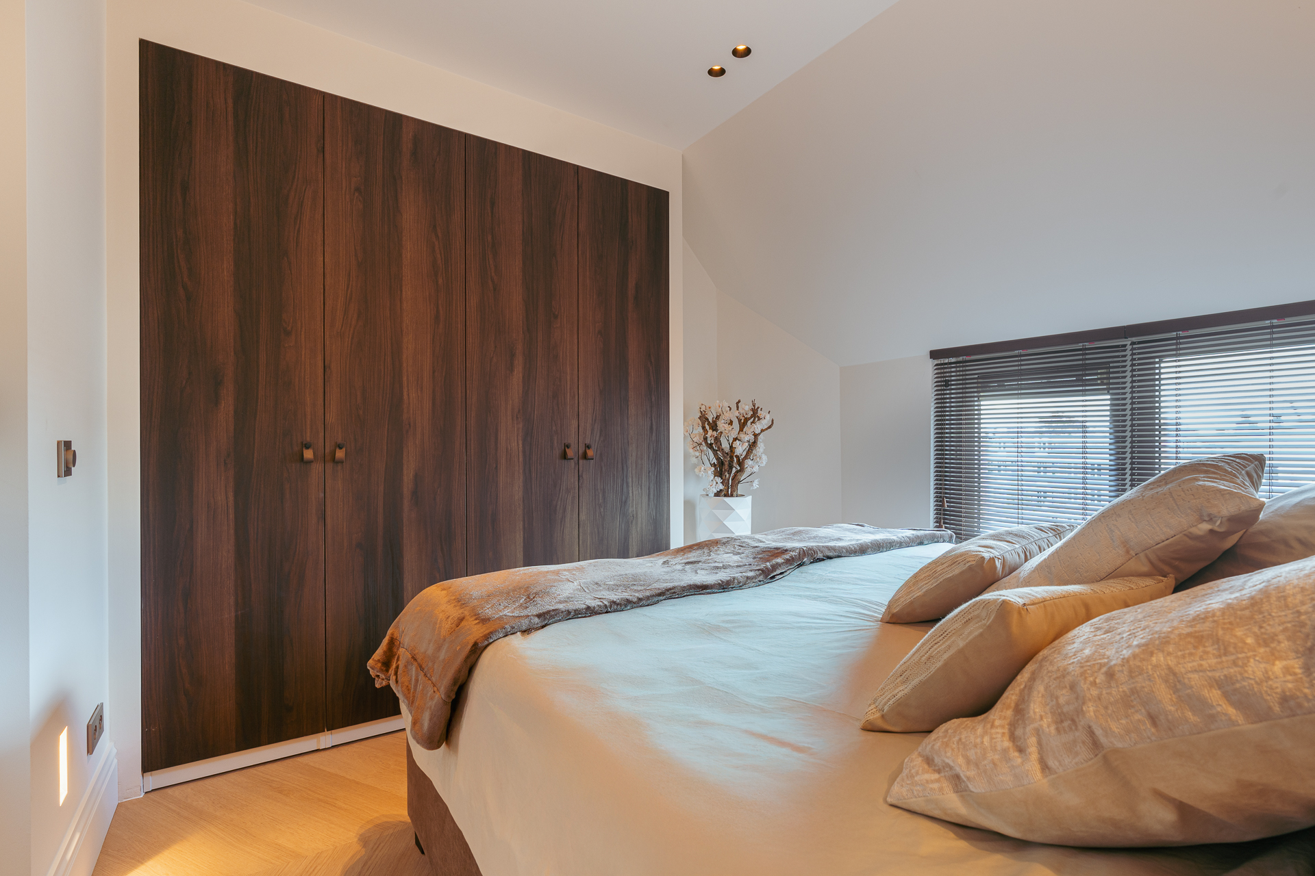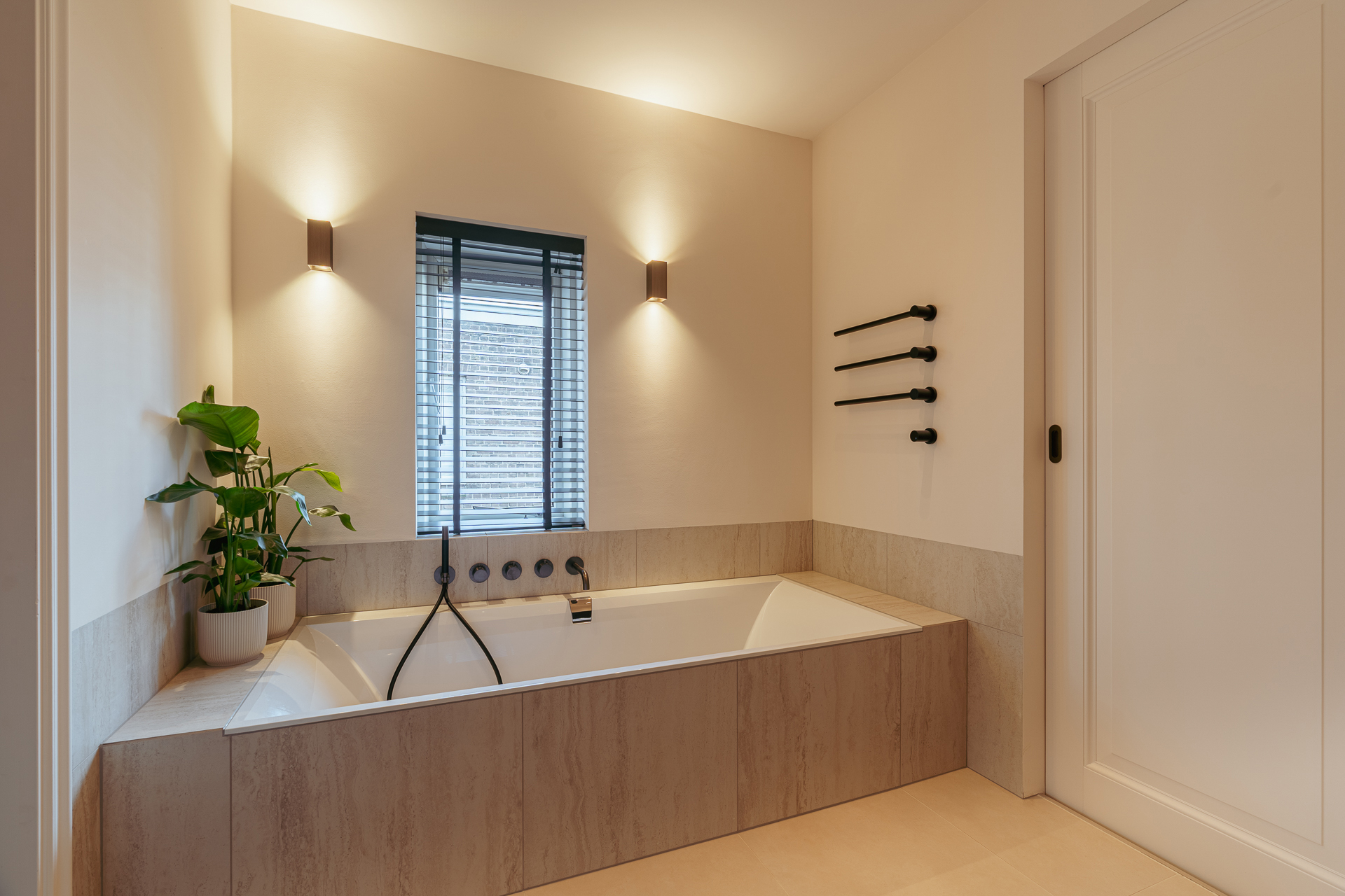 From the hallway, you have access to the bathroom and two bedrooms. The first, at the front, is multifunctional and perfectly suited as a children’s room, study, or home office. This room also houses the renewed meter cupboard with 3-phase connection. At the rear is the master bedroom, fitted with elegant built-in wardrobes and with direct access to the luxurious bathroom. The bathroom is equipped with a Villeroy & Boch bathtub, walk-in shower, and a stylish natural stone washbasin. A smart integrated sliding door allows you to separate the bathroom from the bedroom if desired.