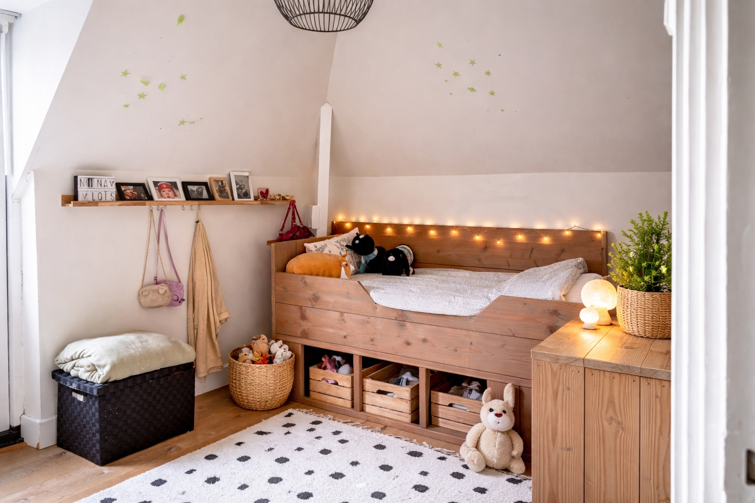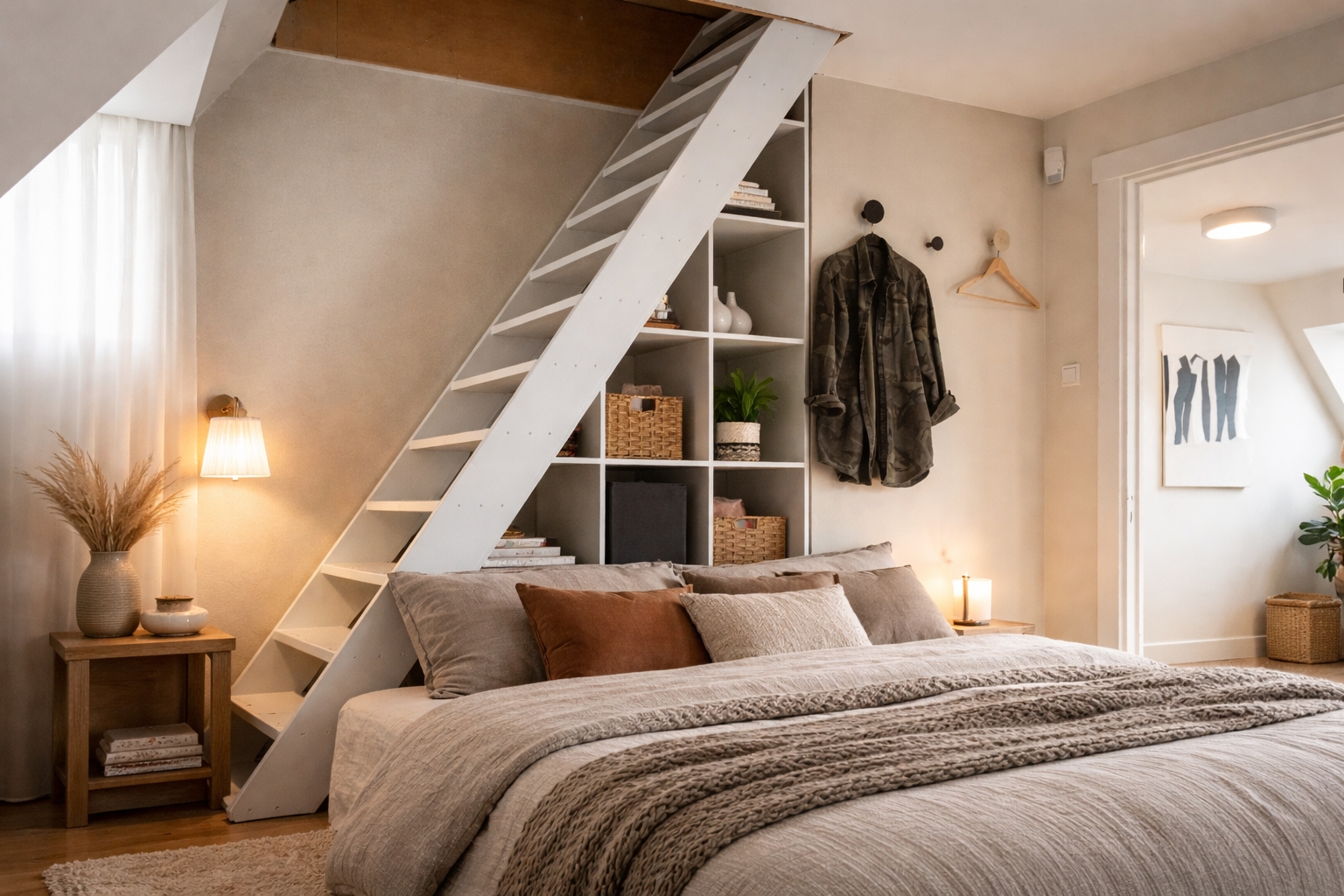 Accessible via a fixed staircase. This level comprises a generous attic room with roof window and practical storage space.