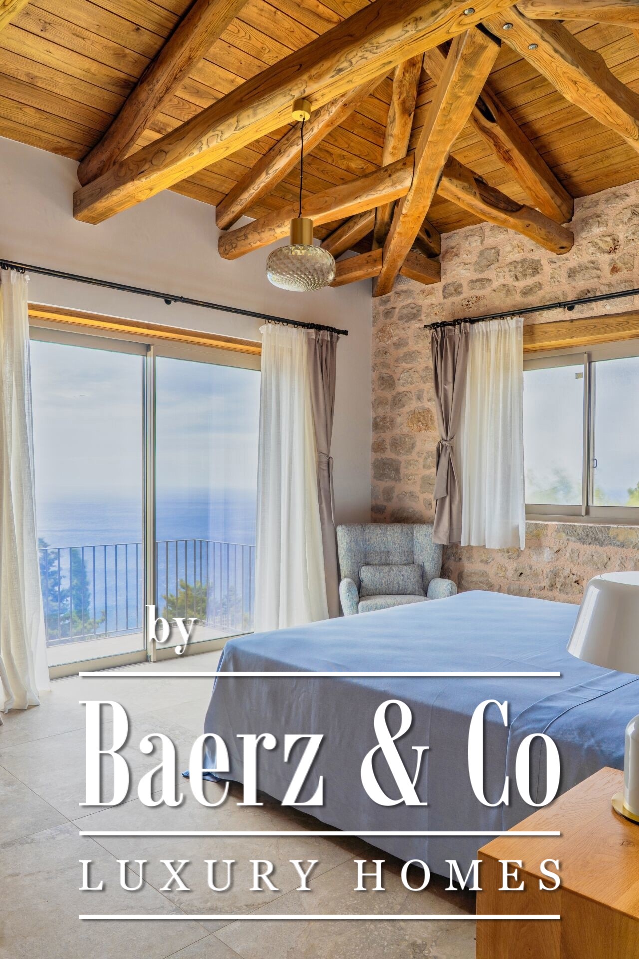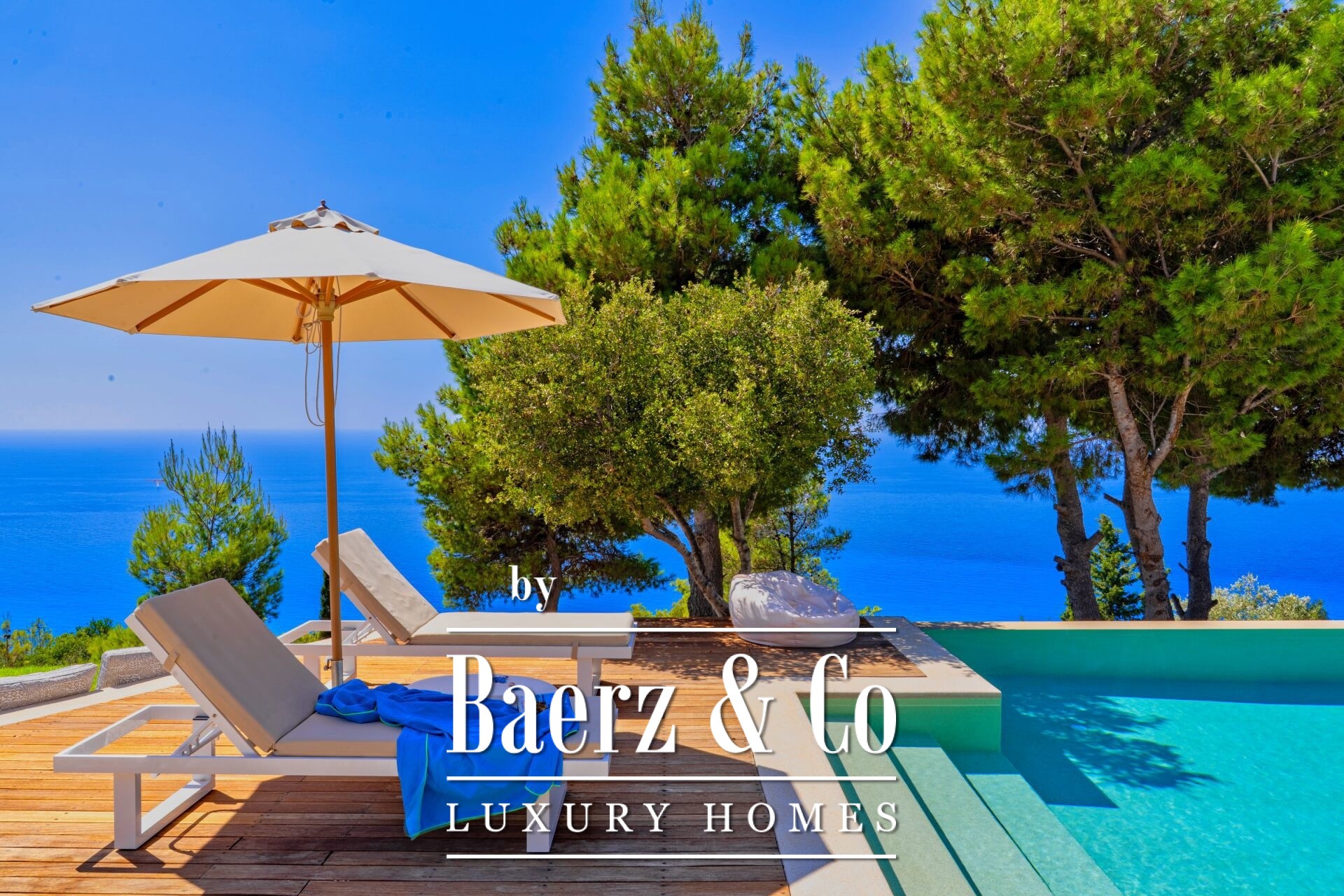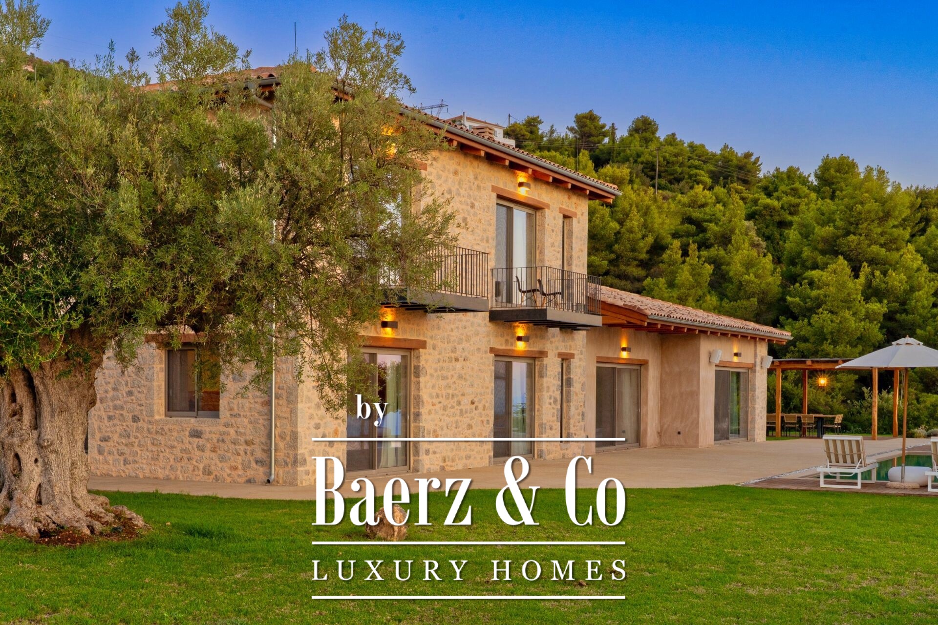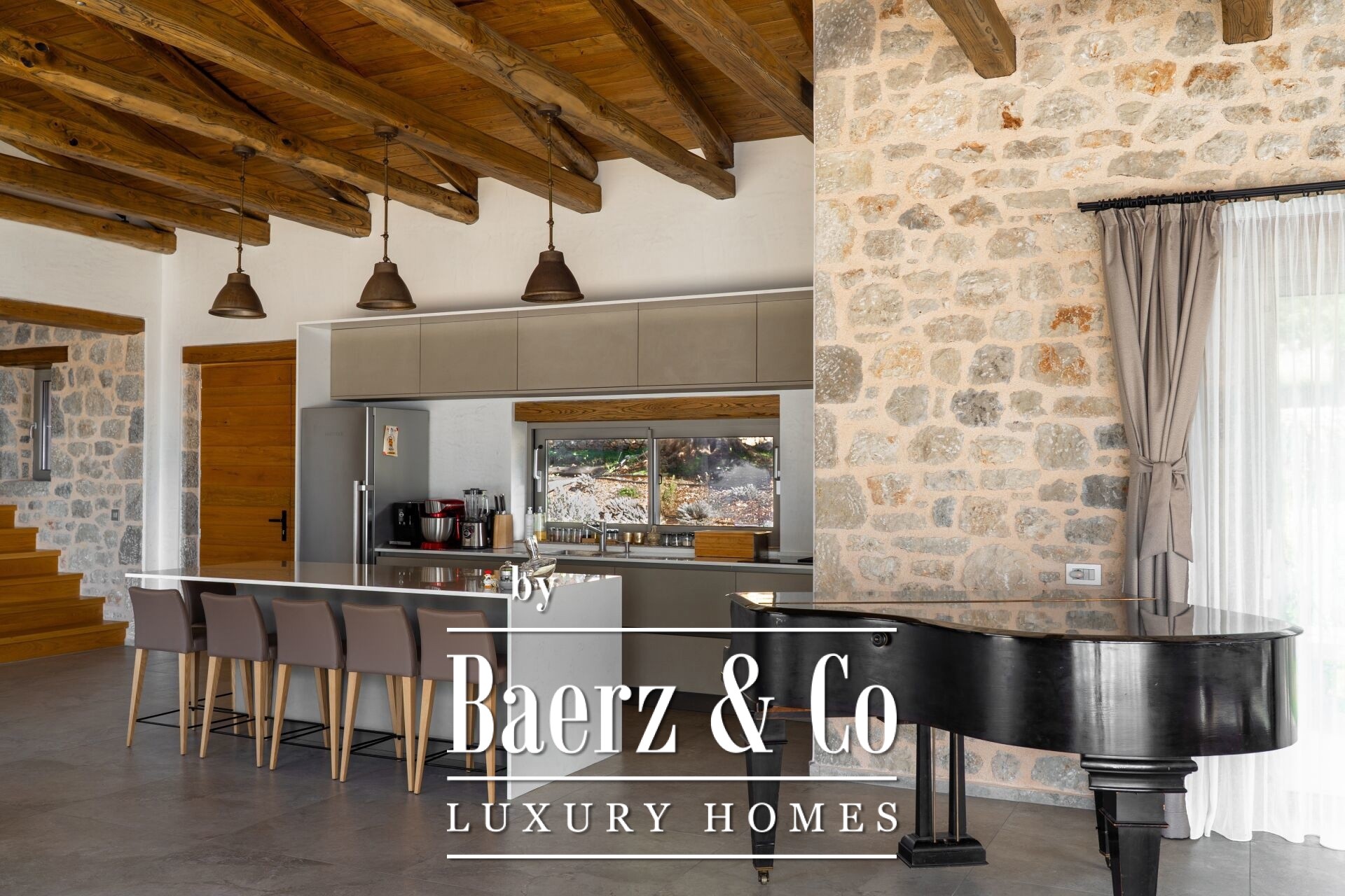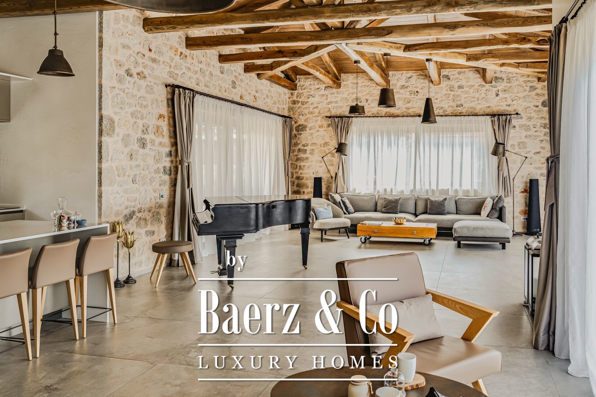 Set in a peaceful natural environment, just 300 meters from the sea, this luxurious stone-built villa of 360 sq.m. is situated on a private plot of 5,333 sq.m., offering unobstructed panoramic views of the Ionian Sea, the mountains, and the lush green landscape of Lefkada.