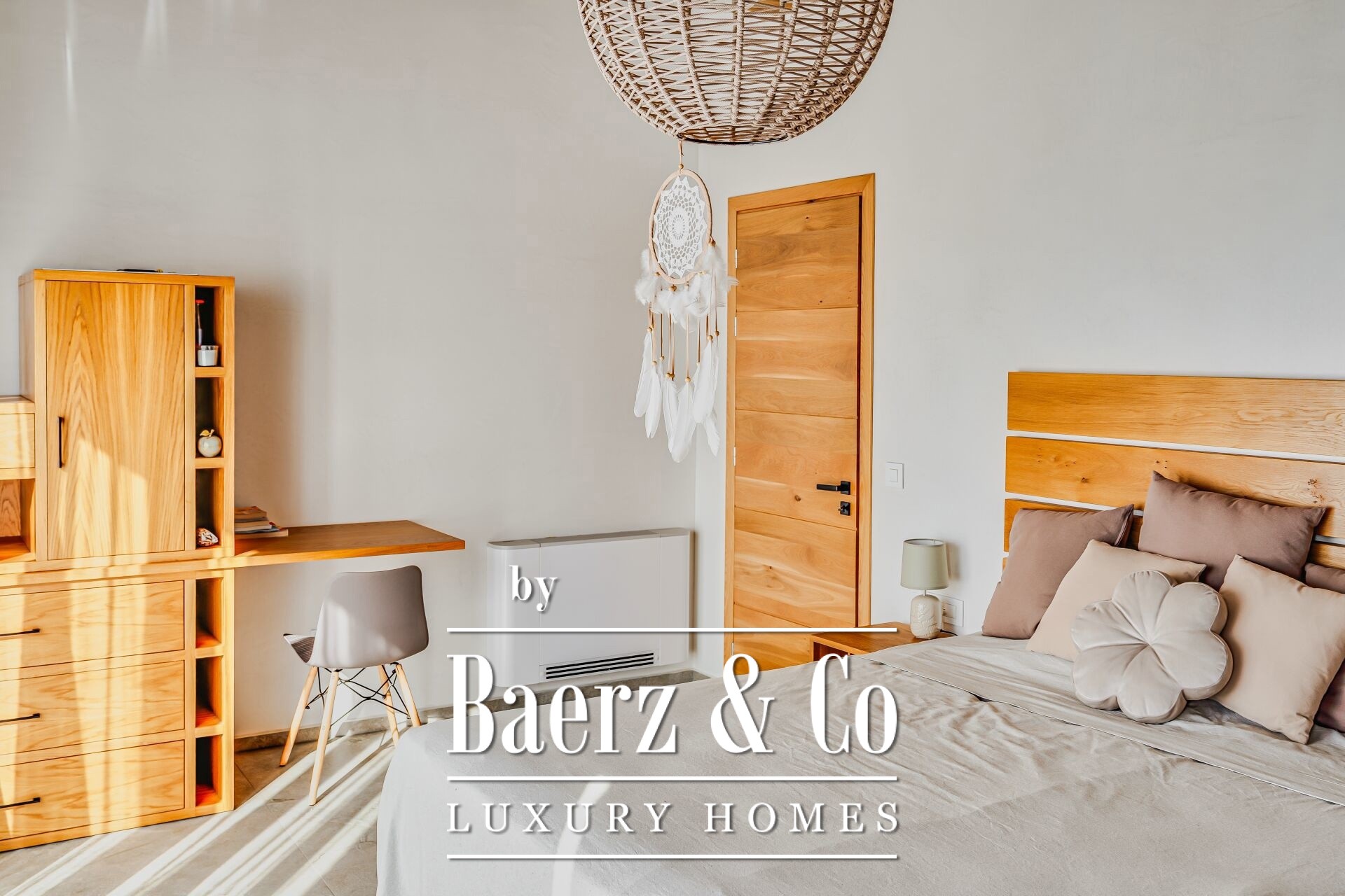 Outdoors, beyond the beautifully landscaped garden, there is a vineyard section and a herb garden, creating an authentic Mediterranean atmosphere. The property also offers a comfortable lounge area, an outdoor dining space, an open shower, and a large swimming pool of 75 sq.m., equipped with a heating system and a jet wave system, ideal for relaxation and wellness.