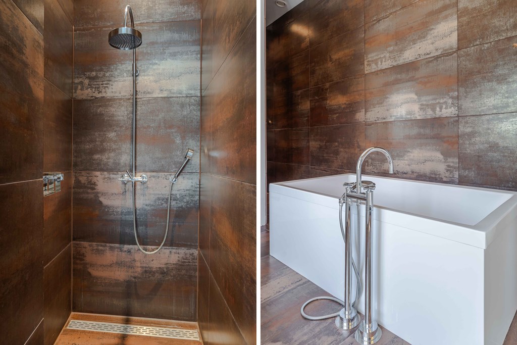 Bedroom 1, located at the front of the house, serves as the master suite. Overlooking the garden, it offers a true oasis of calm. This suite includes a walk-in closet and a complete bathroom with a walk-in shower, freestanding bathtub, and double washbasins with vanity.