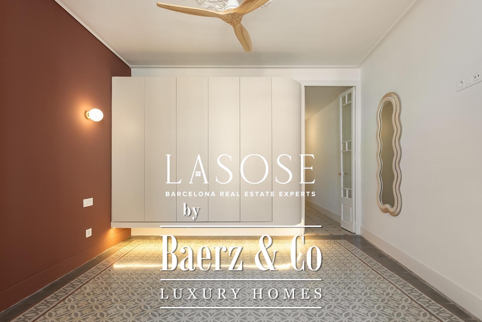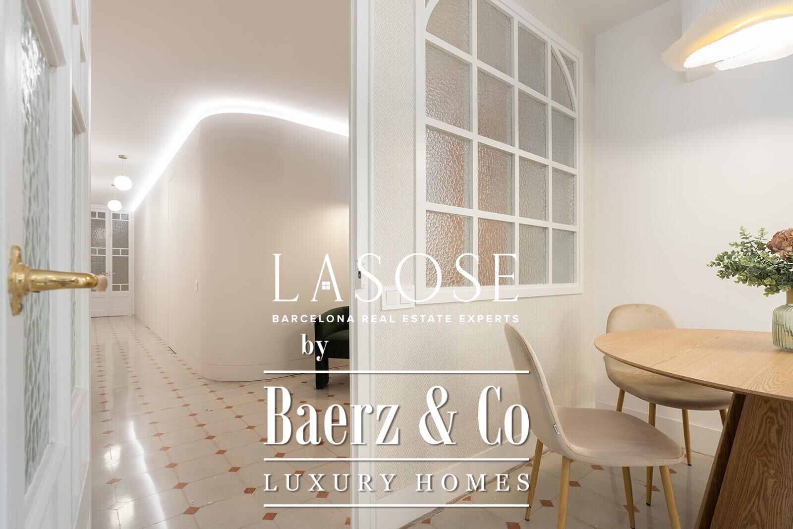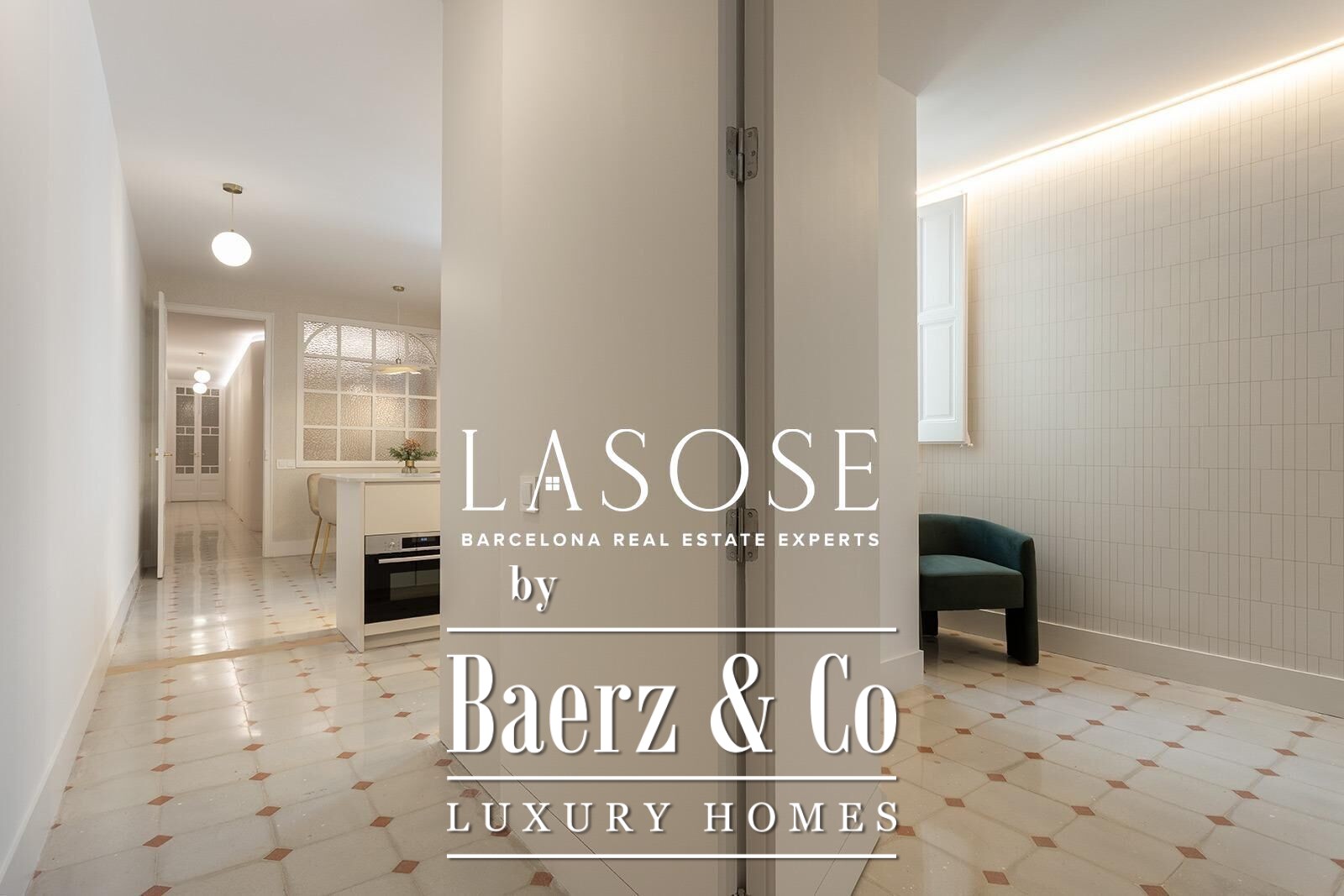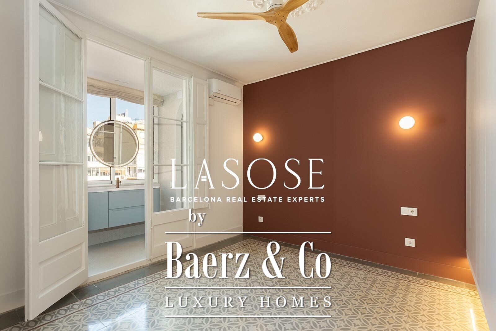 Apartment Barcelona is a residence where heritage architecture is balanced with contemporary renovation, set on the top floor in Eixample. The 115 m² apartment, fully renewed in 2025, invites abundant natural light through its southeast facing balcony, filling the living space with warmth and offering open views from the lounge. Original hydraulic tiles and a carefully restored Catalan ceiling stand as signatures of period craftsmanship, while modern lighting, sleek bathrooms, and brand new appliances seamlessly blend into the refined fabric of the home.