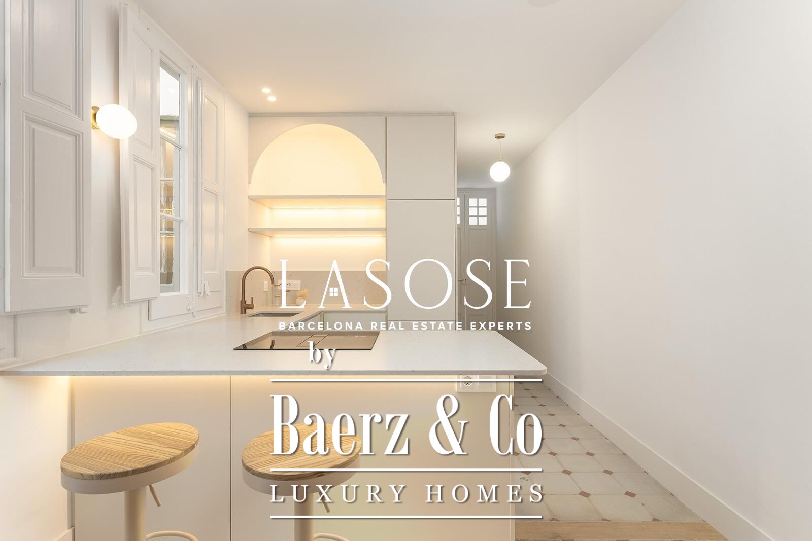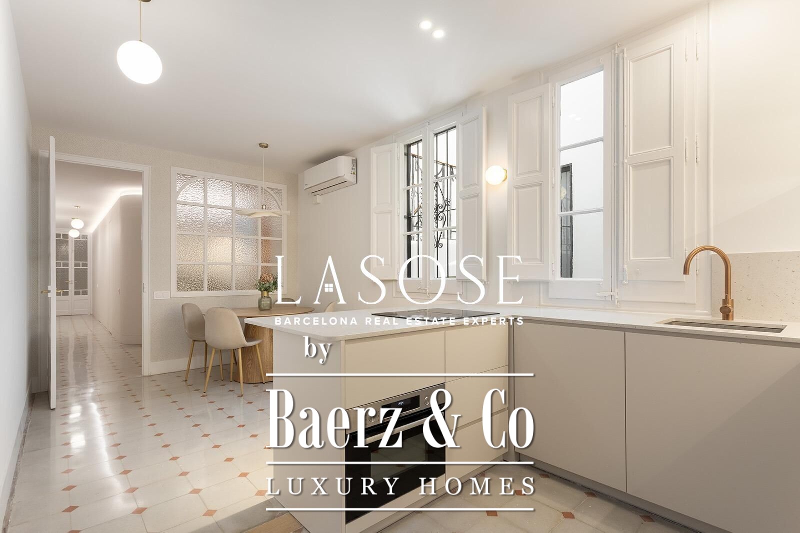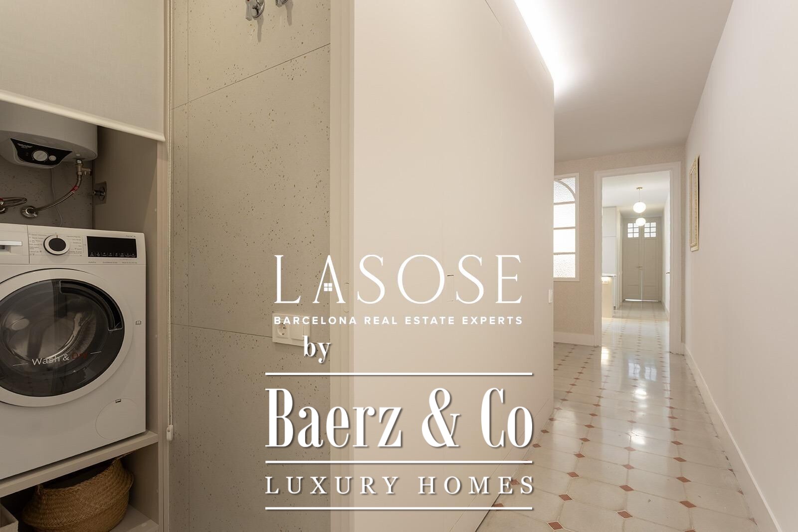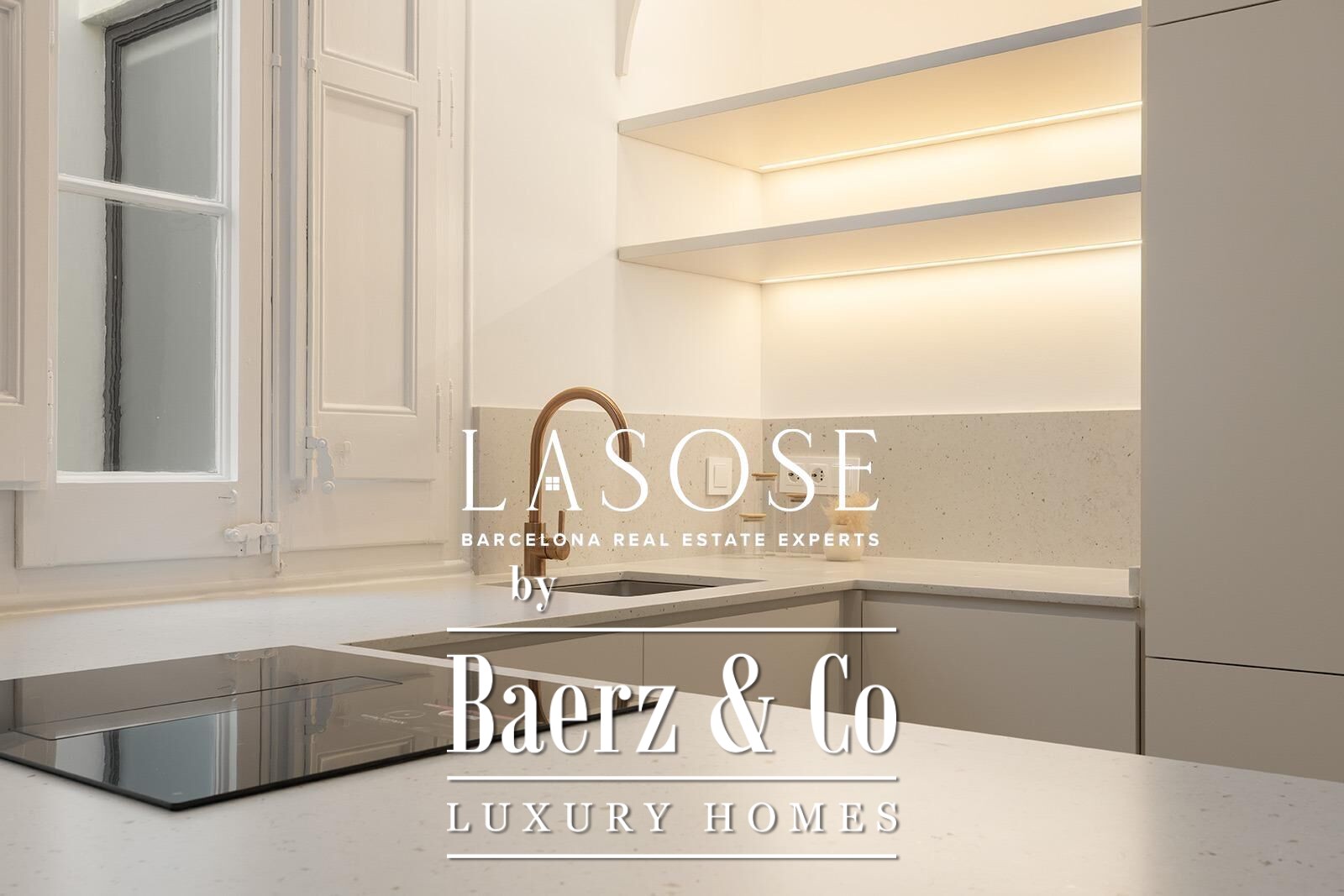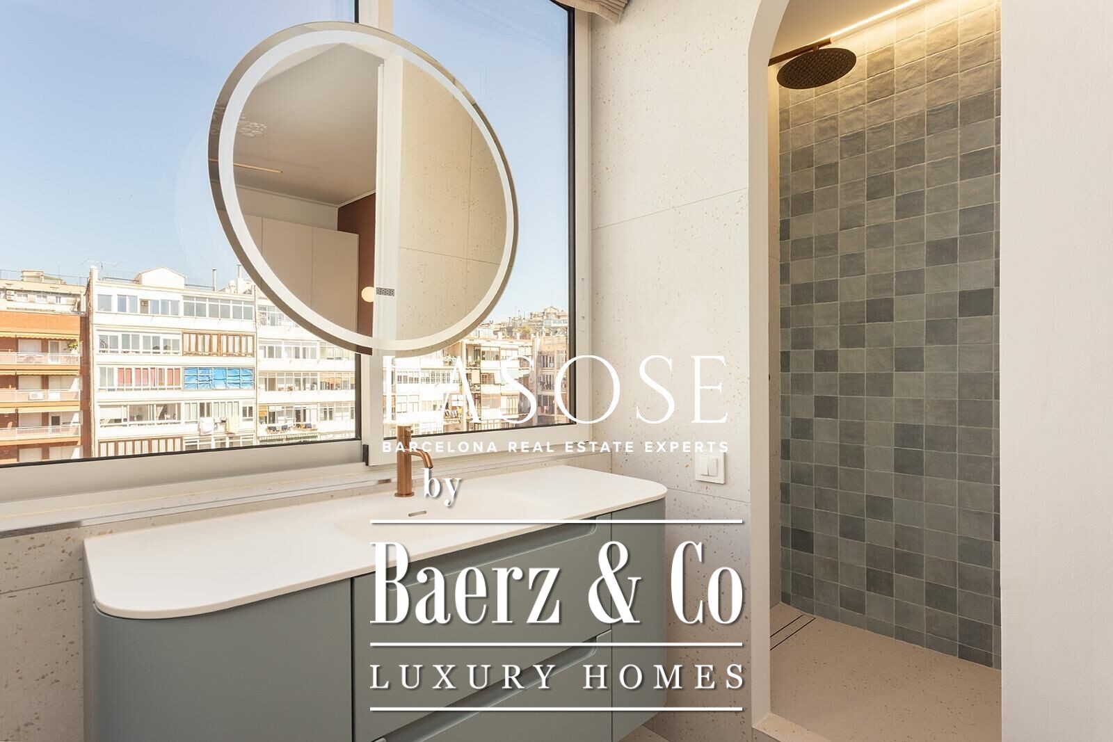 Apartment Barcelona is a residence where heritage architecture is balanced with contemporary renovation, set on the top floor in Eixample. The 115 m² apartment, fully renewed in 2025, invites abundant natural light through its southeast facing balcony, filling the living space with warmth and offering open views from the lounge. Original hydraulic tiles and a carefully restored Catalan ceiling stand as signatures of period craftsmanship, while modern lighting, sleek bathrooms, and brand new appliances seamlessly blend into the refined fabric of the home.