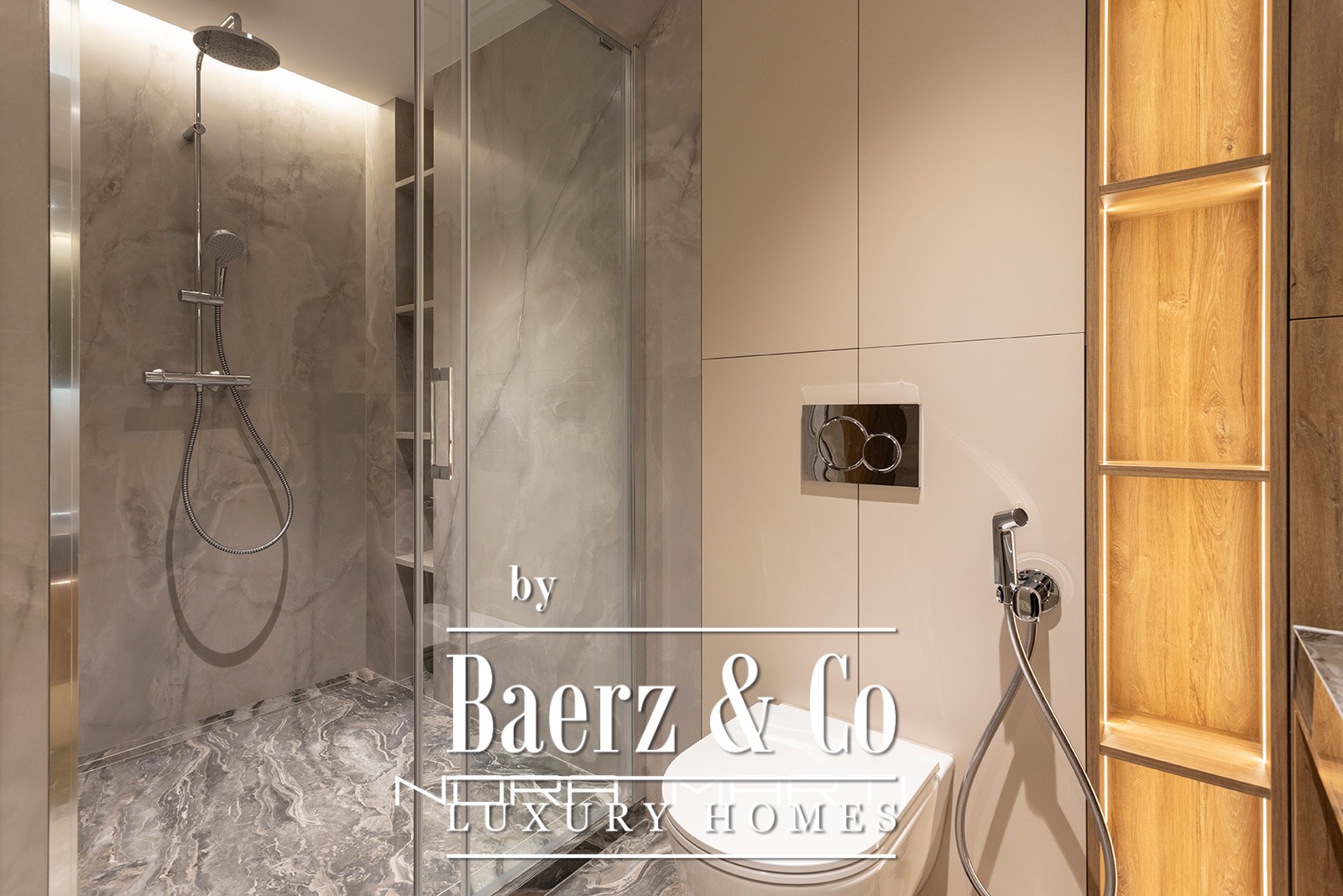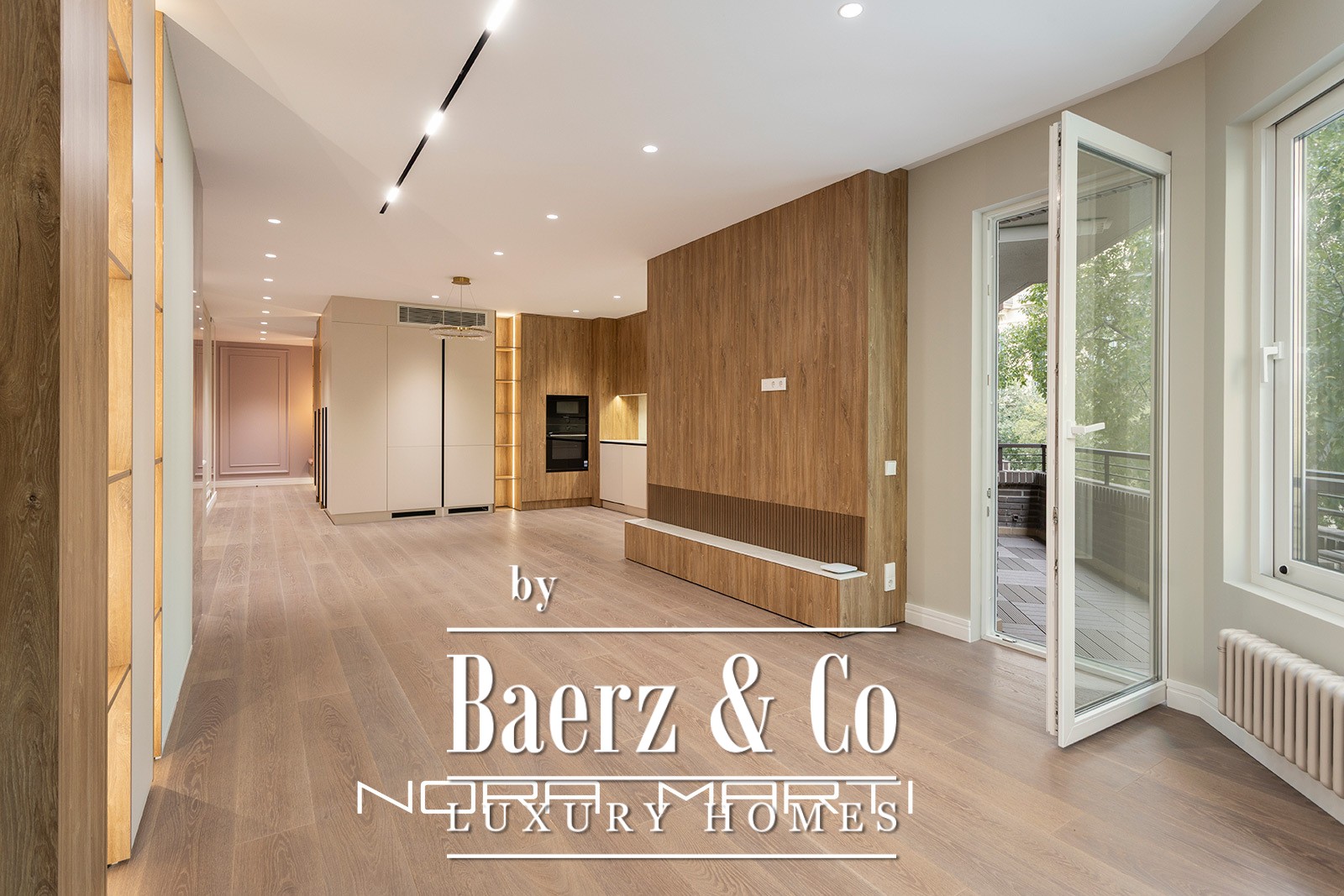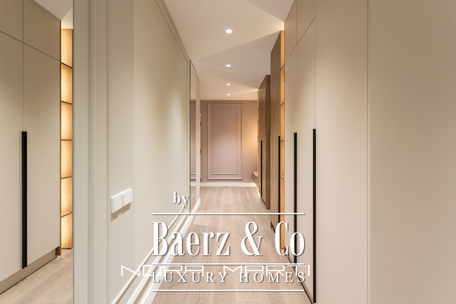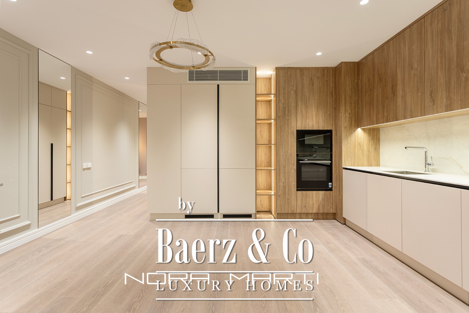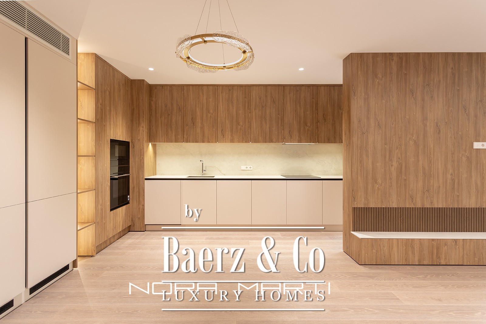 A generous open-plan living, dining, and kitchen area of approximately 51 m² anchors the home, seamlessly connected to one of two terraces totaling about 12 m². The kitchen is both functional and elegant, integrating Bosch appliances with custom cabinetry and storage. Three double bedrooms provide calm, private retreats, including a master suite with dressing area, private bathroom, and direct terrace access. Two additional double bedrooms share a full bathroom, complemented by a discreet guest toilet.