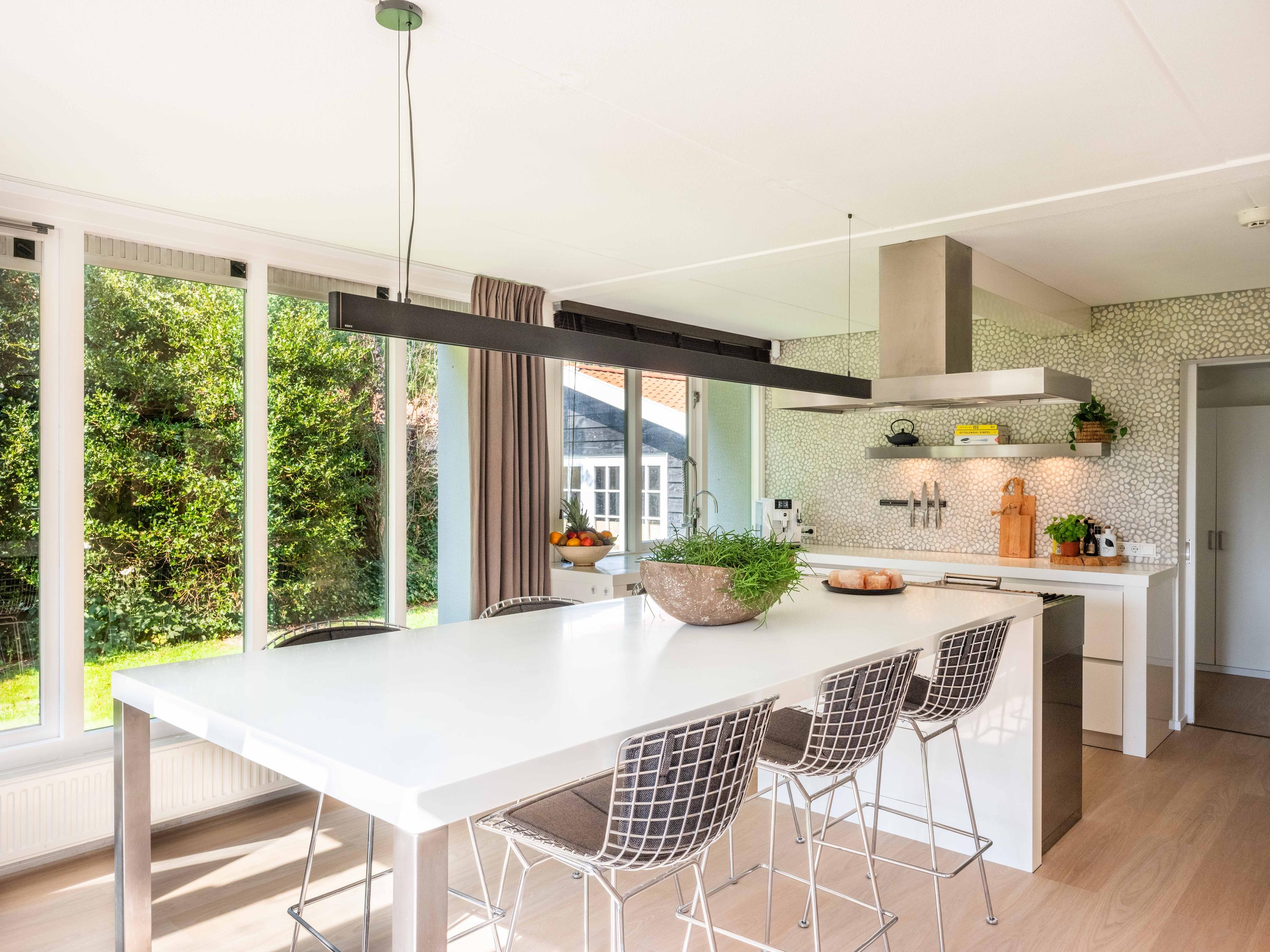 The modern open kitchen has an island where you can sit together. From here again a beautiful view of the greenery.French doors and a covered heated terrace bring the outside in.The kitchen is equipped with various appliances including a quooker, refrigerator, freezer, steam oven, wine cooler, warming drawer and dishwasher. Cooking is available on the large stove with 4 gas burners, a teppanyaki plate, deep fryer and double oven.