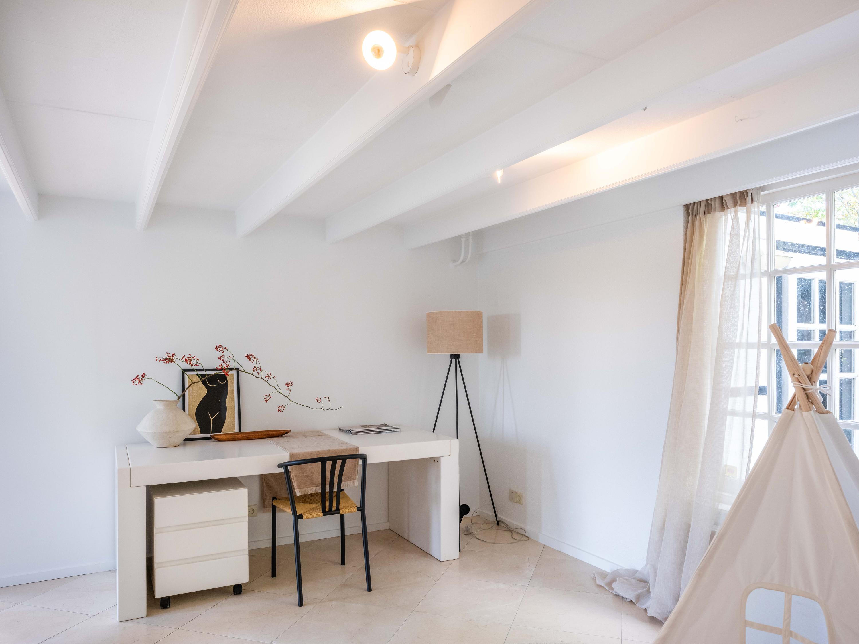 Because the house is at the very back of the plot, the front garden is very generous and offers a surprising amount of privacy. We find a lovely terrace facing south / west, so in the summer months until late in the sun and the sunset can be enjoyed. In front of the plot is parking for several cars and the whole is closed with a gate.