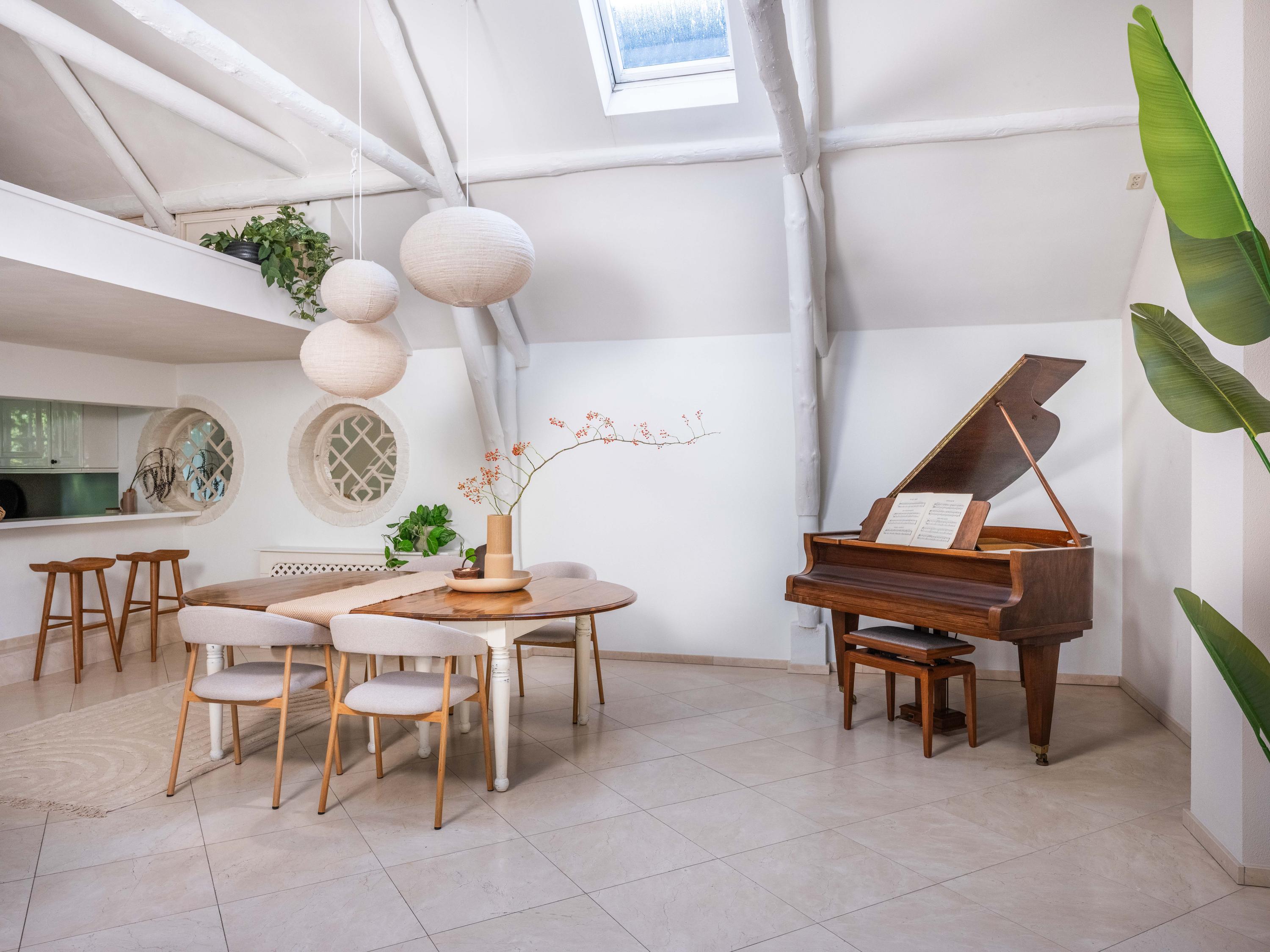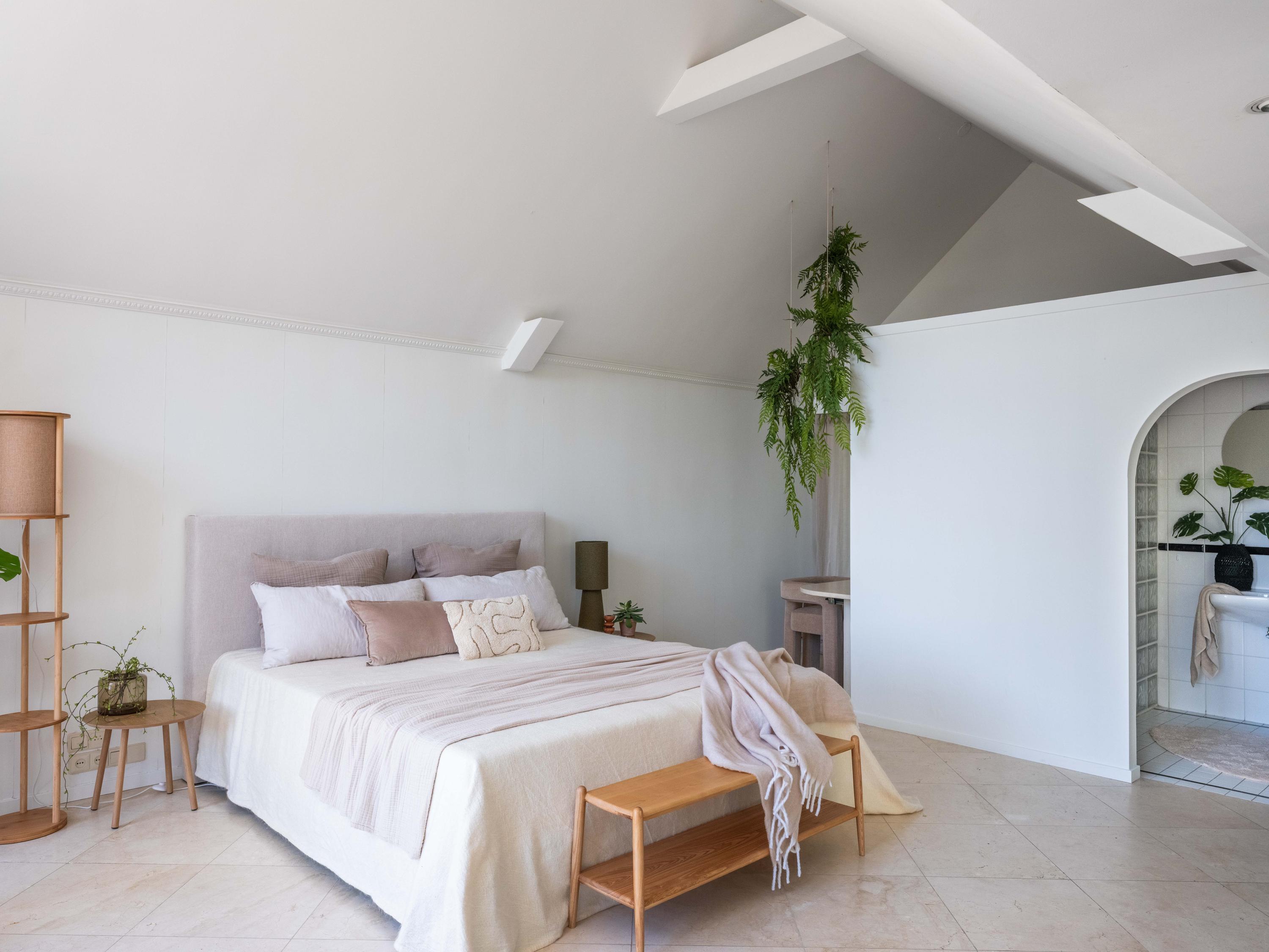 On the second floor, we walk across the loft to the bedroom. This room has closets and provides access to a spacious roof terrace. From the terrace again a great view. The bathroom on this floor is surprisingly spacious and modern (2018). This bathroom has a bathtub, walk-in shower, double sink and toilet.
