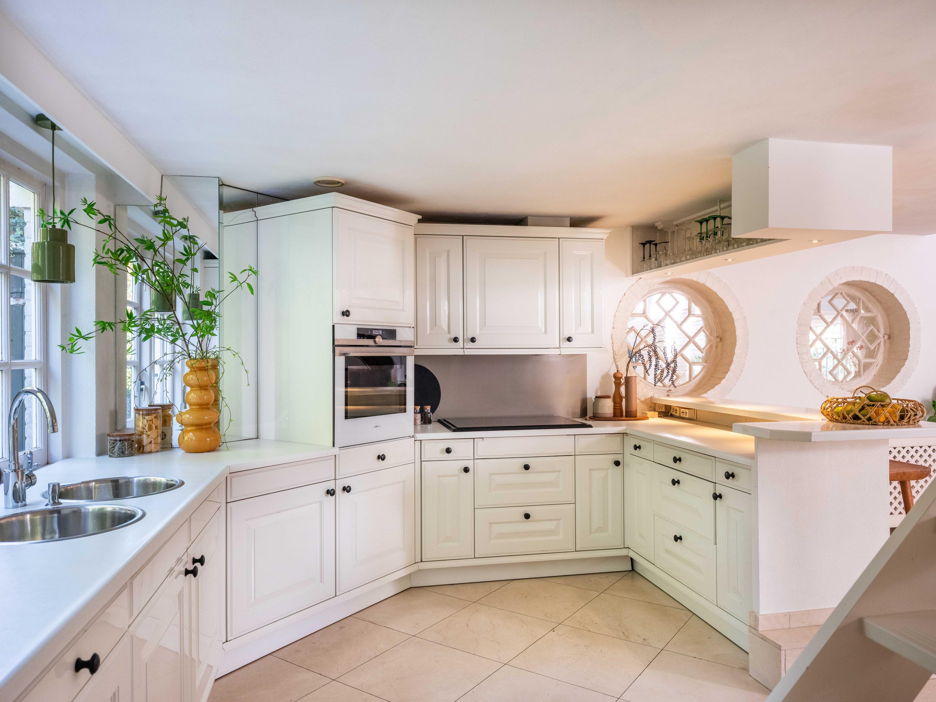The spacious living room has a cozy gas fireplace (formerly fireplace) in the center of the room. The room is cozy with many authentic details. Think of the wooden beams in sight, a high ceiling up to the ridge and round stained-glass windows. At the back left we find the open kitchen with built-in appliances. From the kitchen we enter the utility room with the connection for the washer and dryer, the central heating system and a door to the outside.