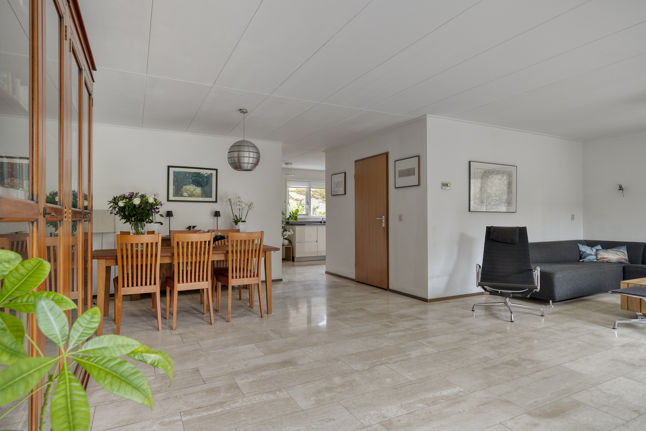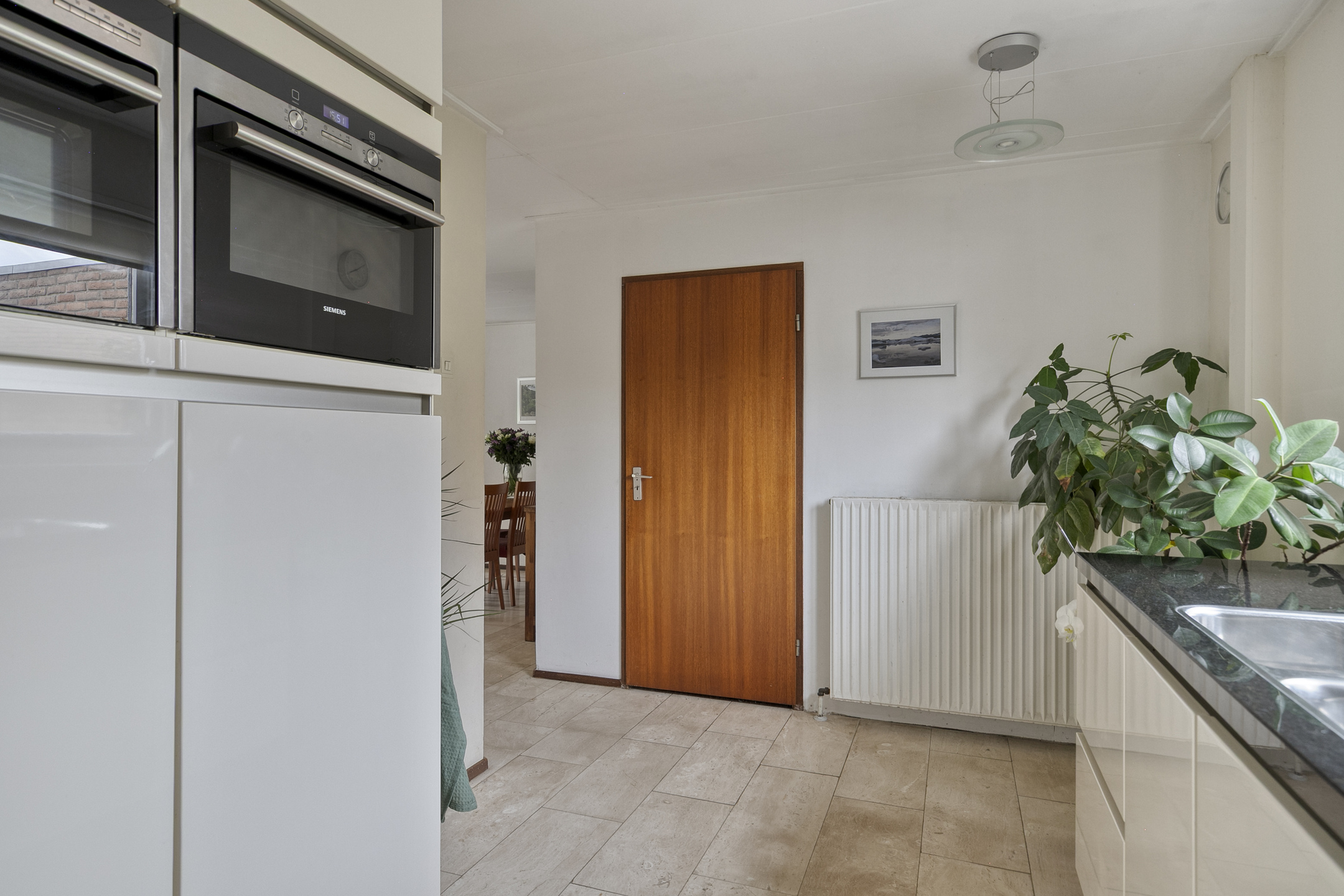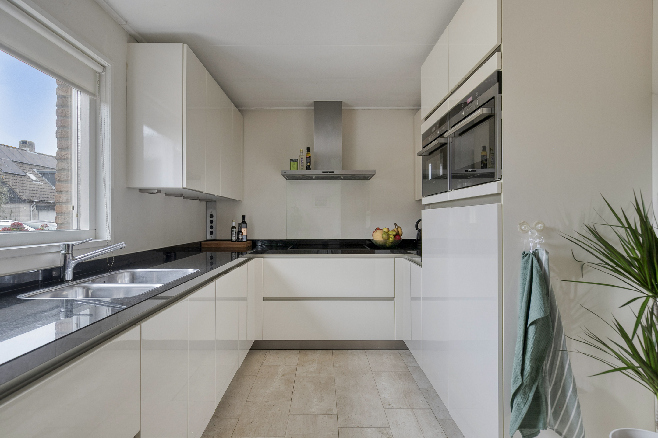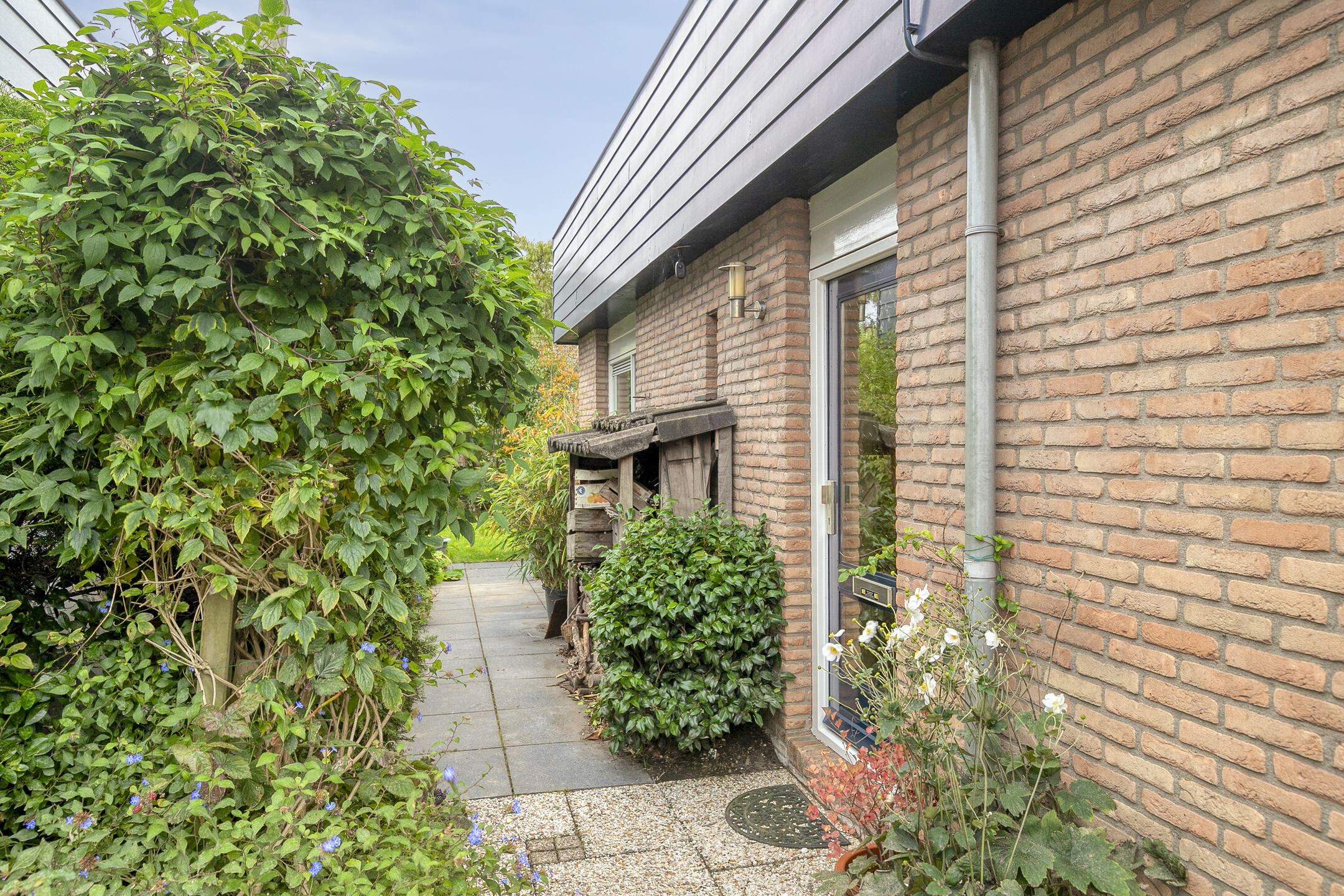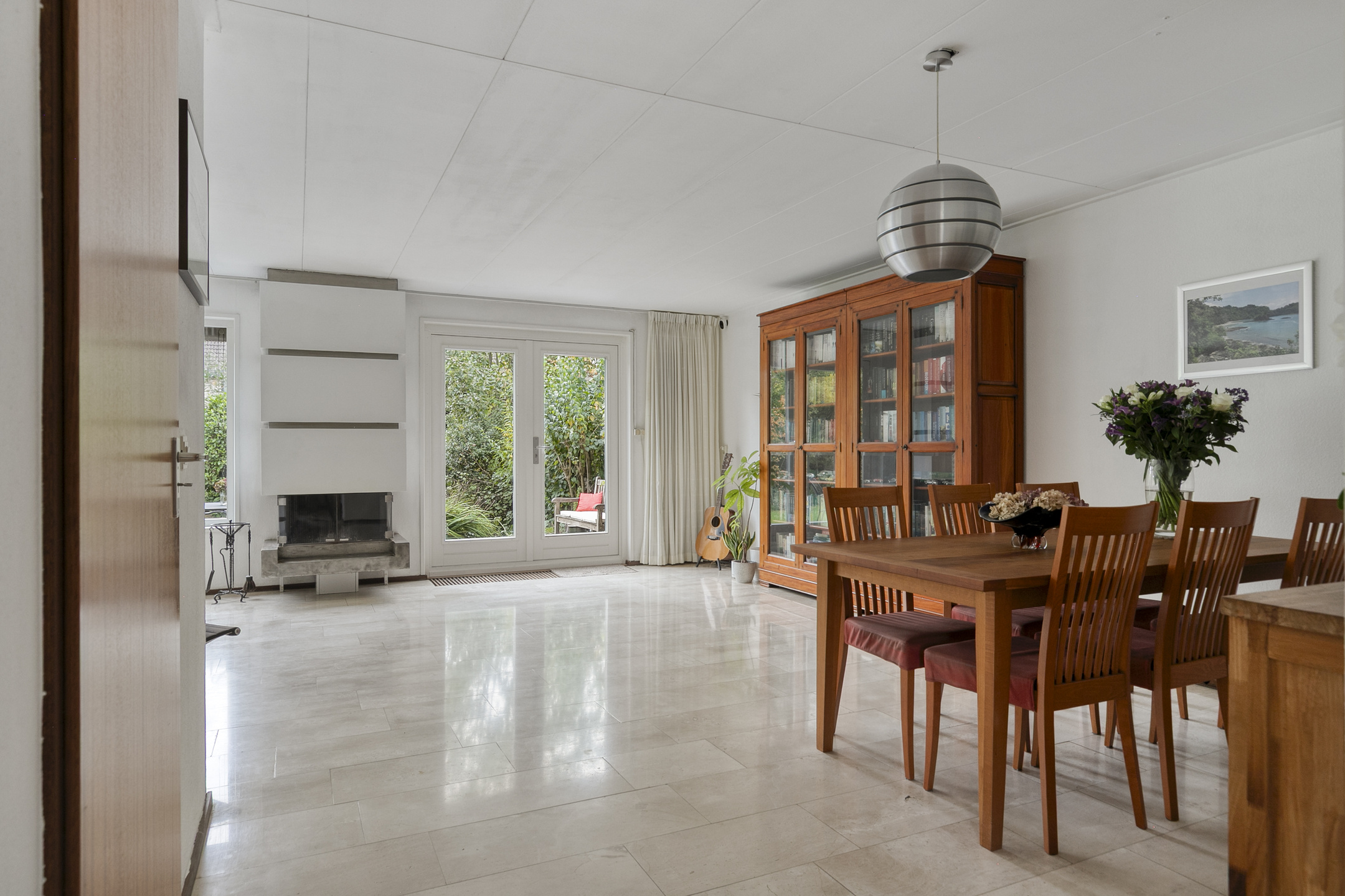 What immediately stands out are the large windows, which provide abundant natural light. The living room features a beautiful natural stone floor with underfloor heating and a cozy fireplace. From the living room, you step directly into the beautifully landscaped backyard. Facing south, the garden offers plenty of privacy and is designed with multiple terraces, perfect for enjoying either sun or shade. The waterfront enhances the open and spacious feel of this location.