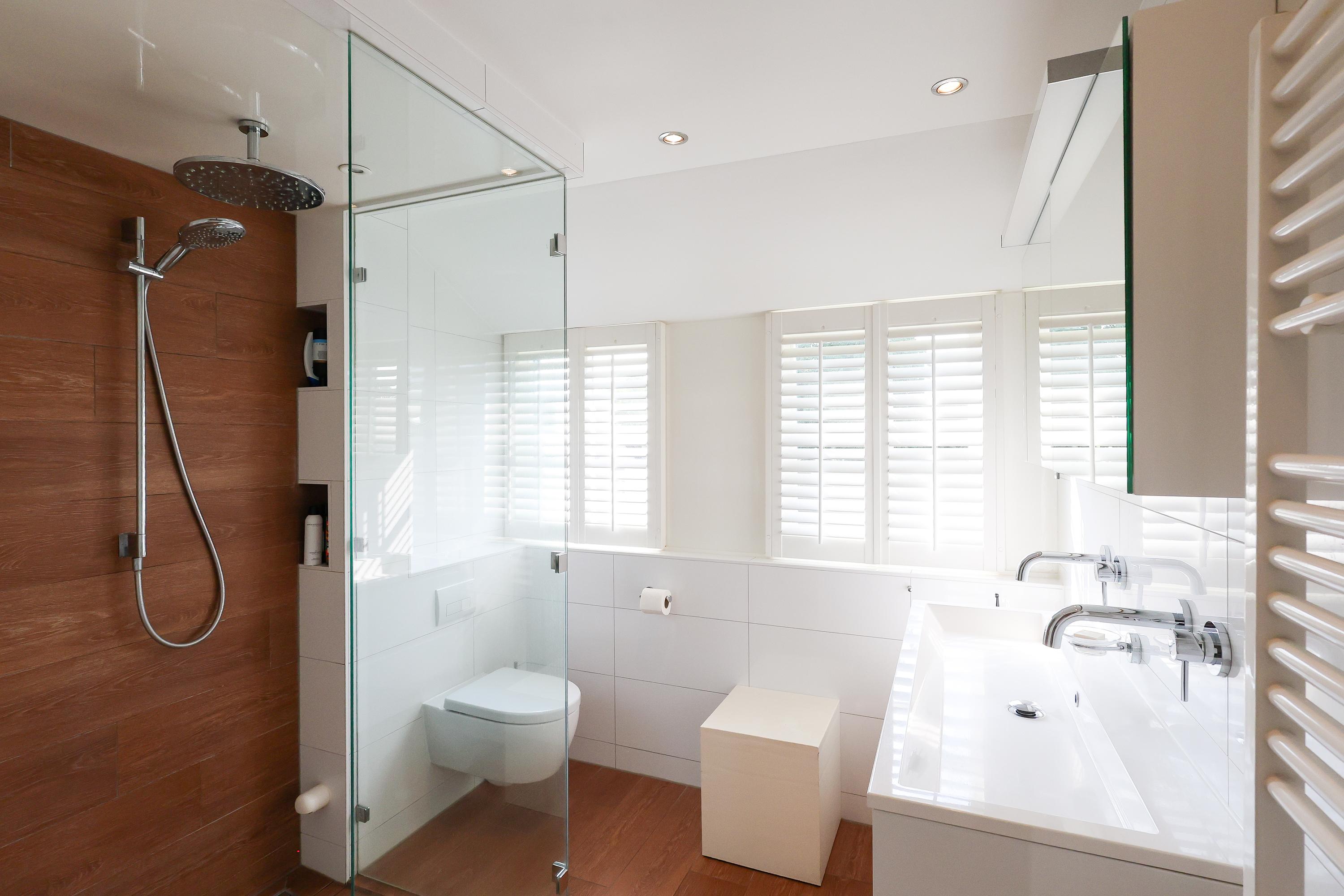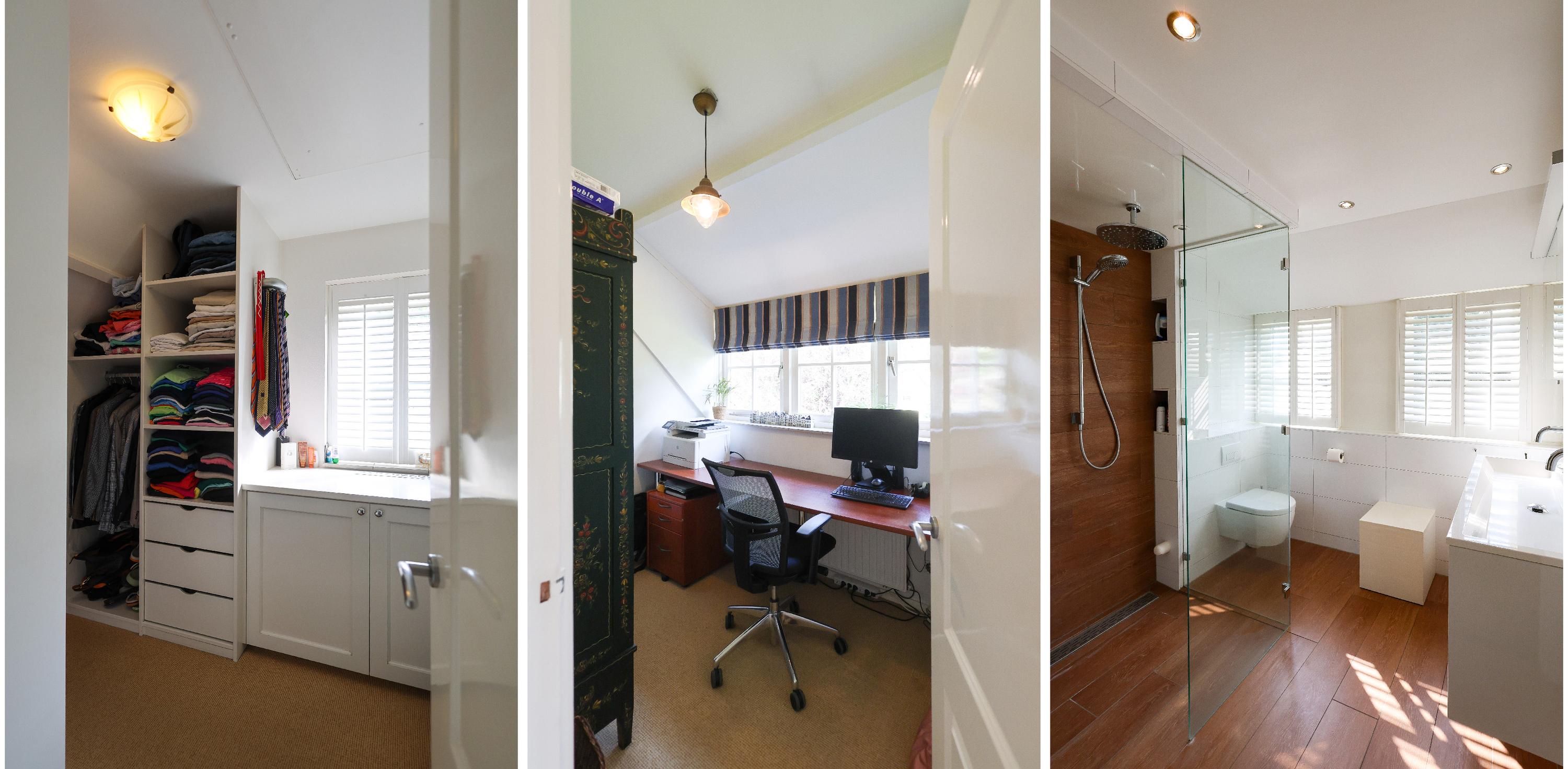Upstairs, you’ll find a spacious master bedroom with vaulted ceiling, built-in wardrobes, and French doors opening onto the balcony. There are two additional bedrooms, one currently used as a walk-in closet, a study and a modern bathroom featuring underfloor heating, a walk-in shower/steam cabin, second toilet, and vanity unit with ample storage.
